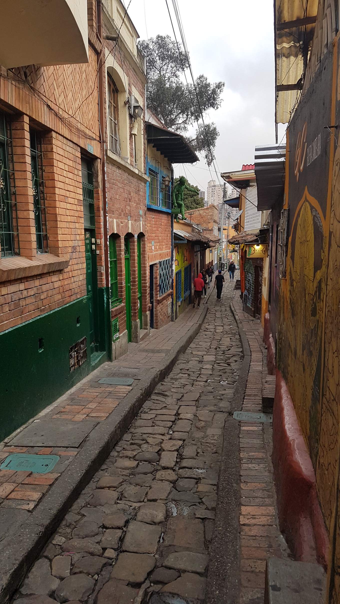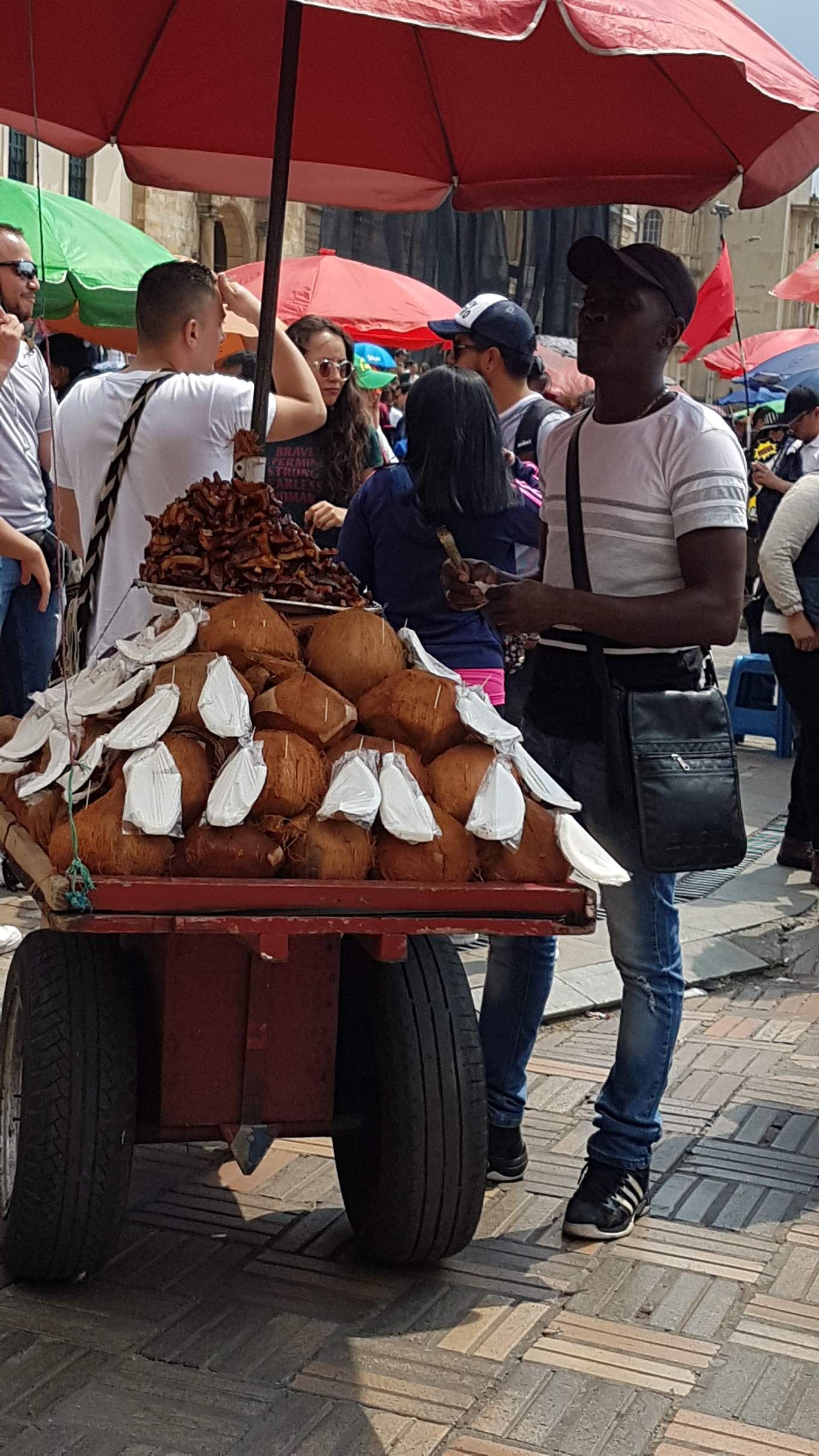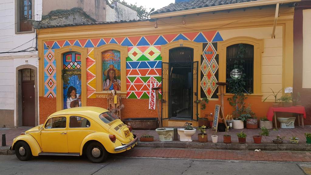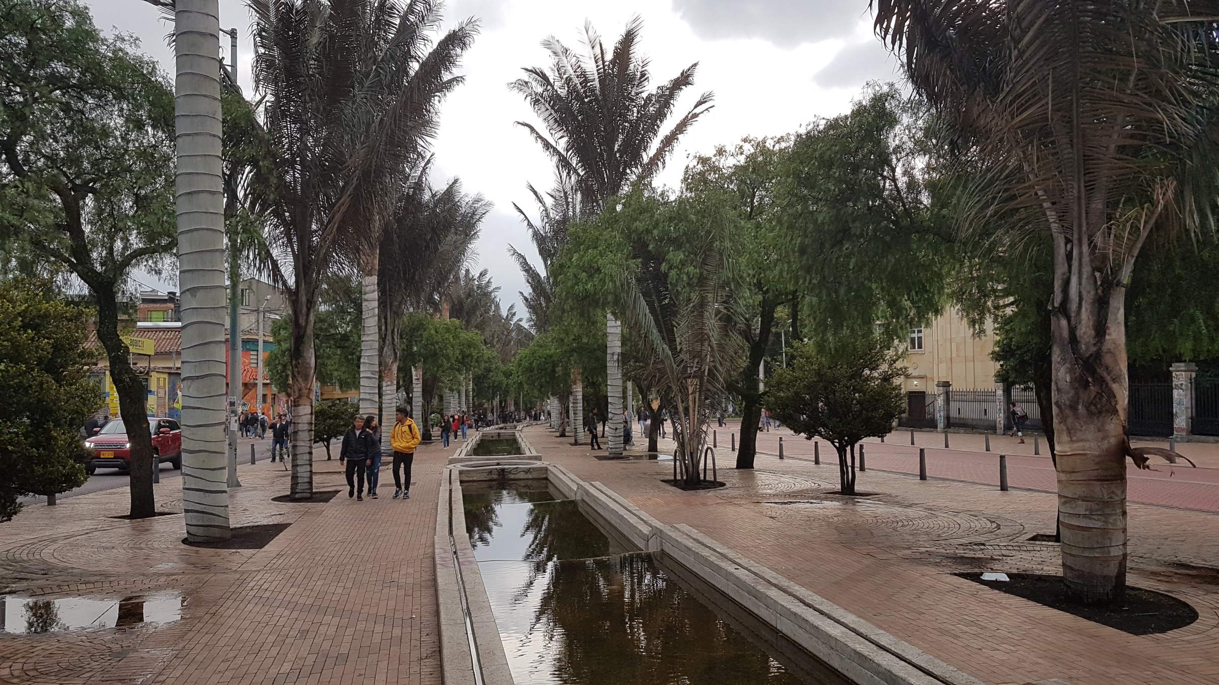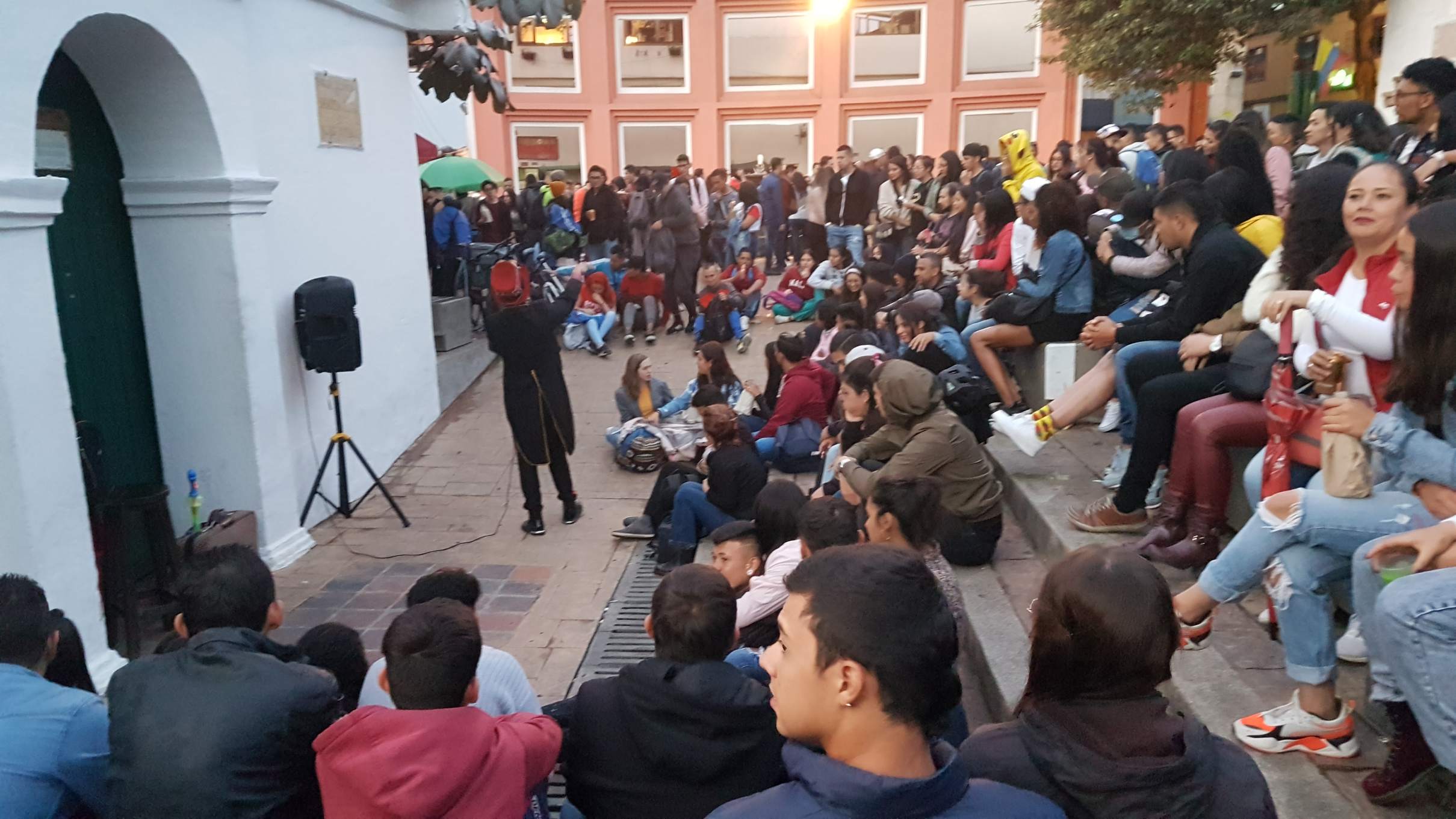 Ich starte zu meinem ersten Orientierungs- und Erkundungsgang. Das alte Herz Bogotás liegt gleich ums Eck: die Plazoleta del Chorro de Quevedo. Manche behaupten, hier wäre Bogotá gegründet worden. Egal wie, dieser Platz in La Candelaria erwacht auf jeden Fall spätestens am Nachmittag zu Leben. Auf ihm versammeln sich Musiker und Geschichtenerzähler, Akrobaten und Comedians und jede Menge junge Menschen. Es wird den Künstlern gelauscht, viel gelacht und applaudiert, aromatisierte Chicha getrunken, in Gruppen geratscht und philosophiert. Auch die Policía schaut hin und wieder nach dem Rechten.