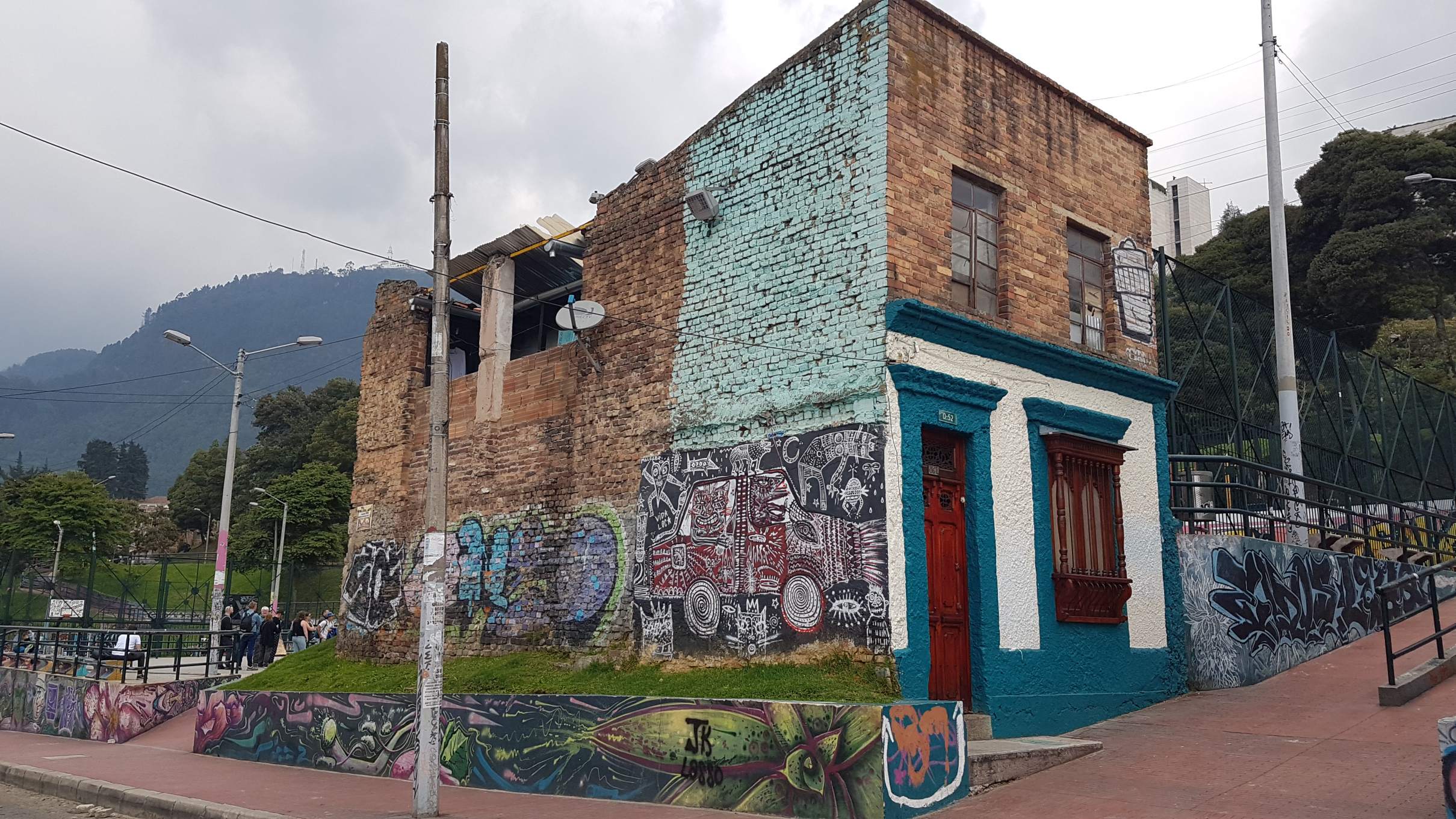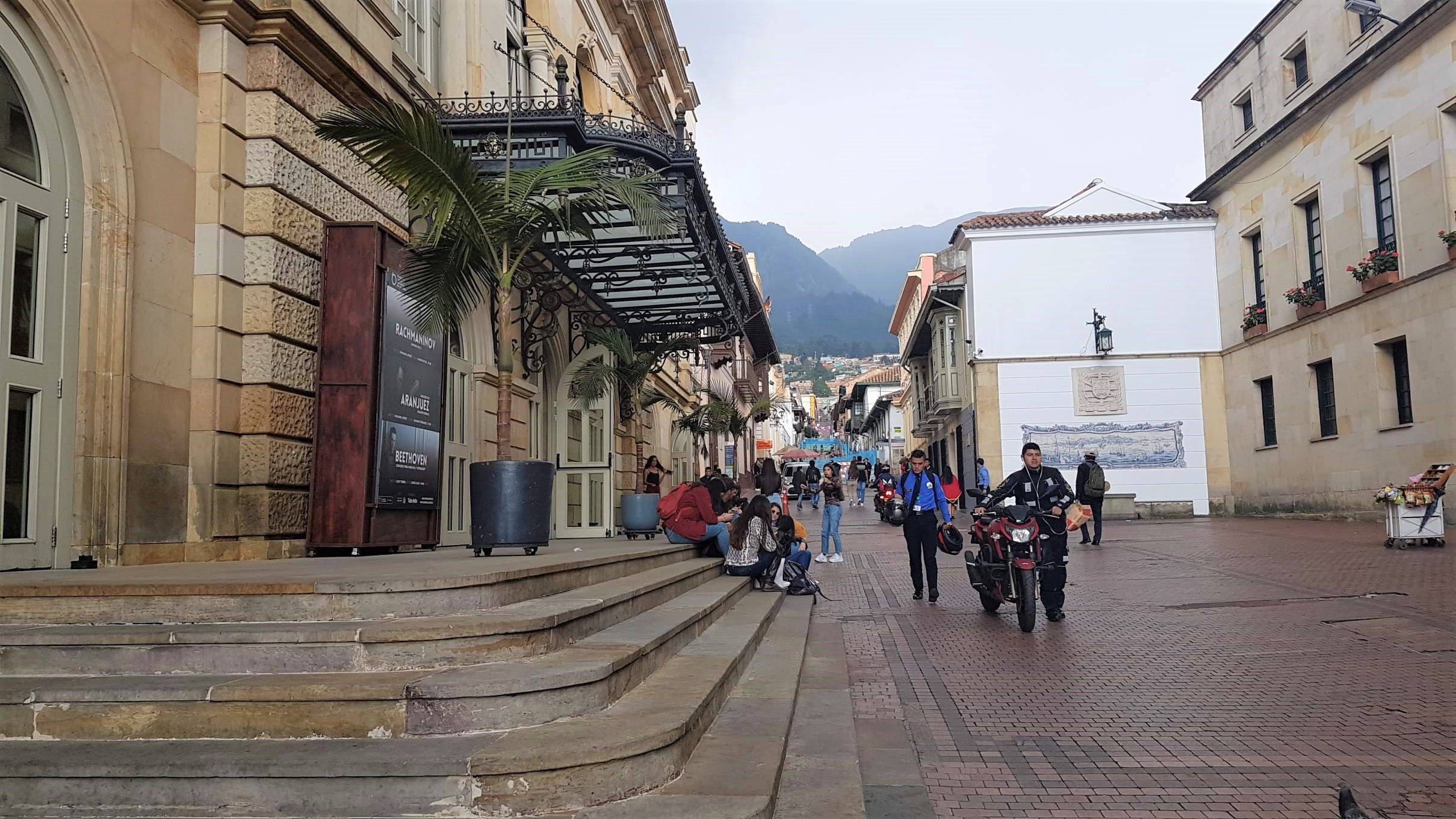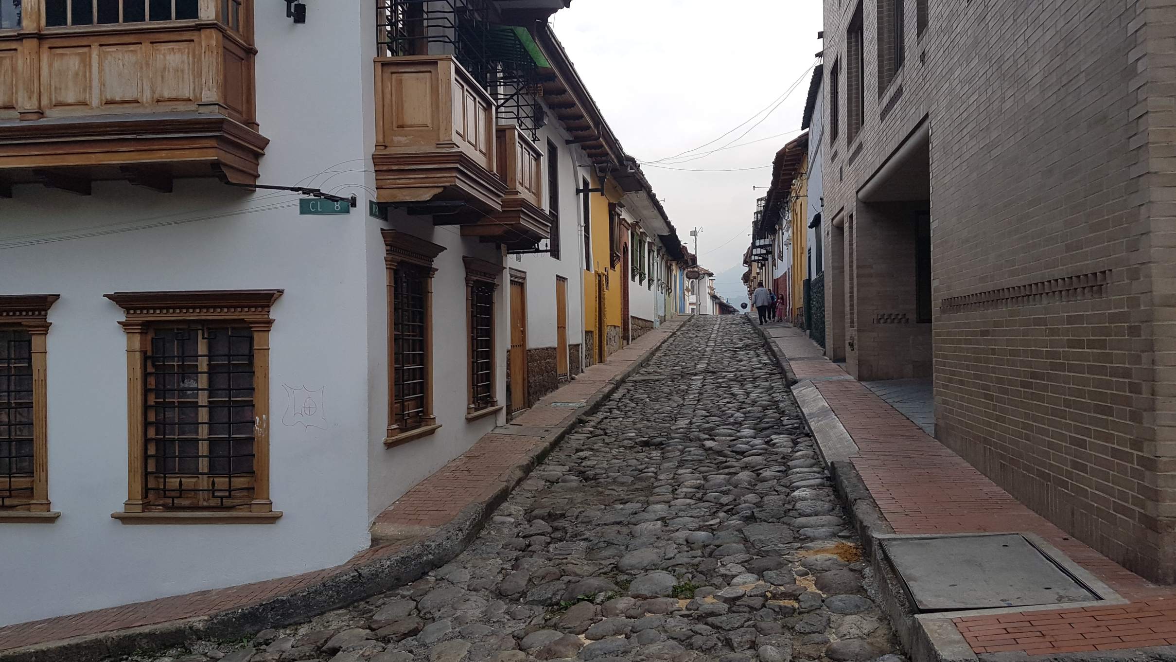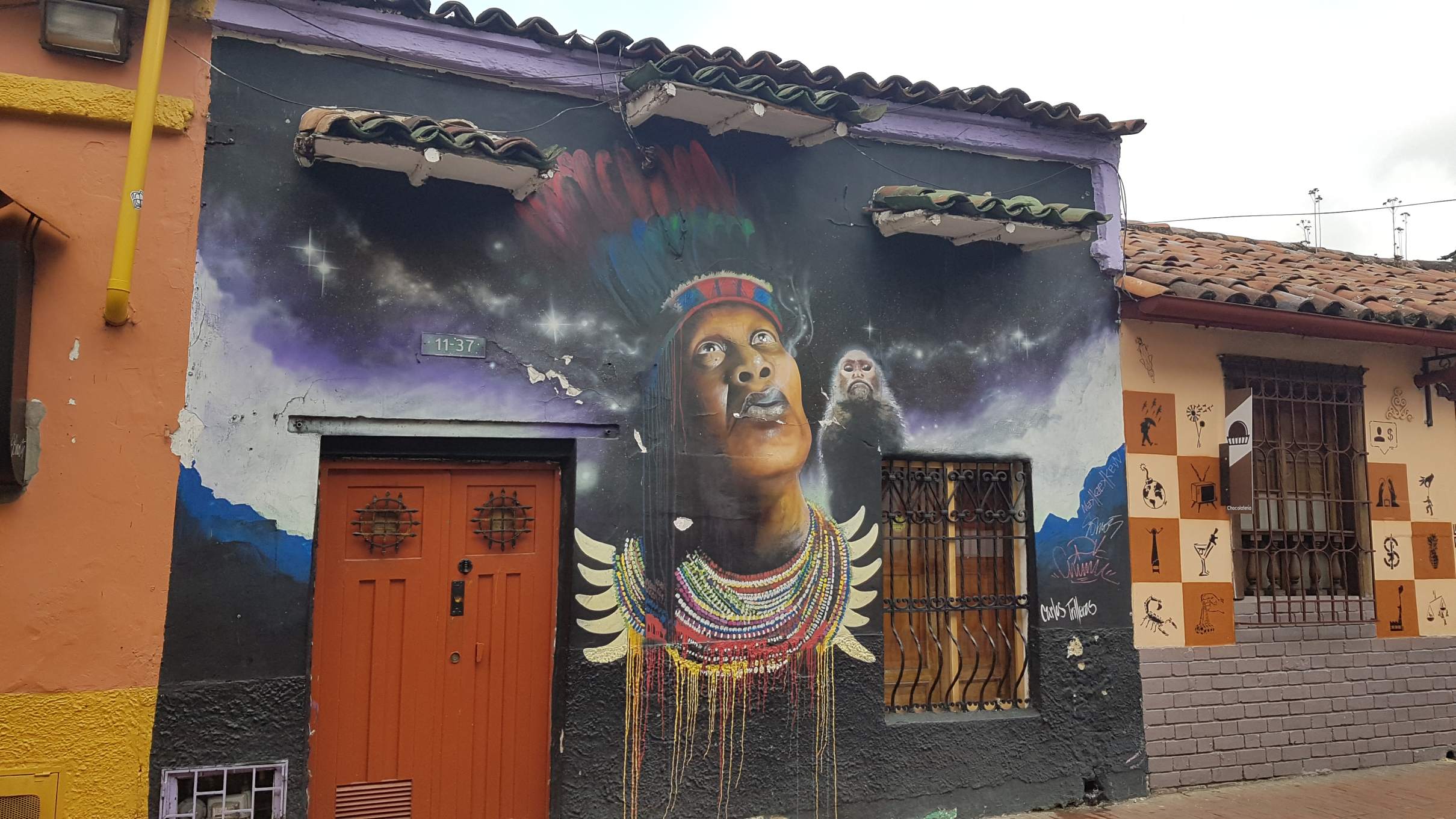 Ich starte zu meinem ersten Orientierungs- und Erkundungsgang. Das alte Herz Bogotás liegt gleich ums Eck: die Plazoleta del Chorro de Quevedo. Manche behaupten, hier wäre Bogotá gegründet worden. Egal wie, dieser Platz in La Candelaria erwacht auf jeden Fall spätestens am Nachmittag zu Leben. Auf ihm versammeln sich Musiker und Geschichtenerzähler, Akrobaten und Comedians und jede Menge junge Menschen. Es wird den Künstlern gelauscht, viel gelacht und applaudiert, aromatisierte Chicha getrunken, in Gruppen geratscht und philosophiert. Auch die Policía schaut hin und wieder nach dem Rechten.
