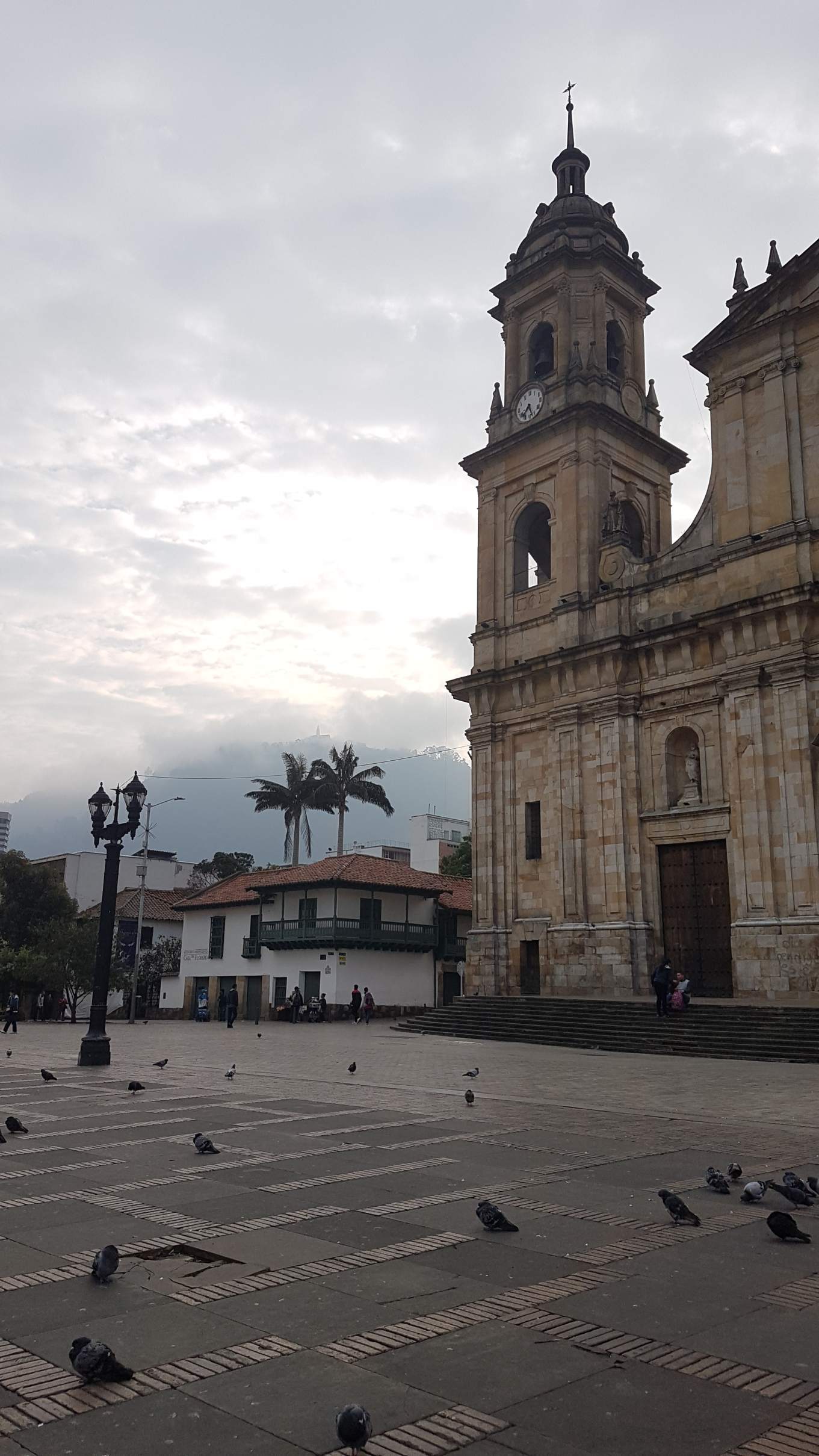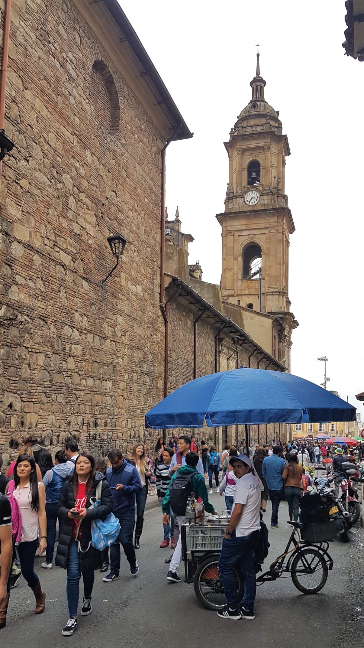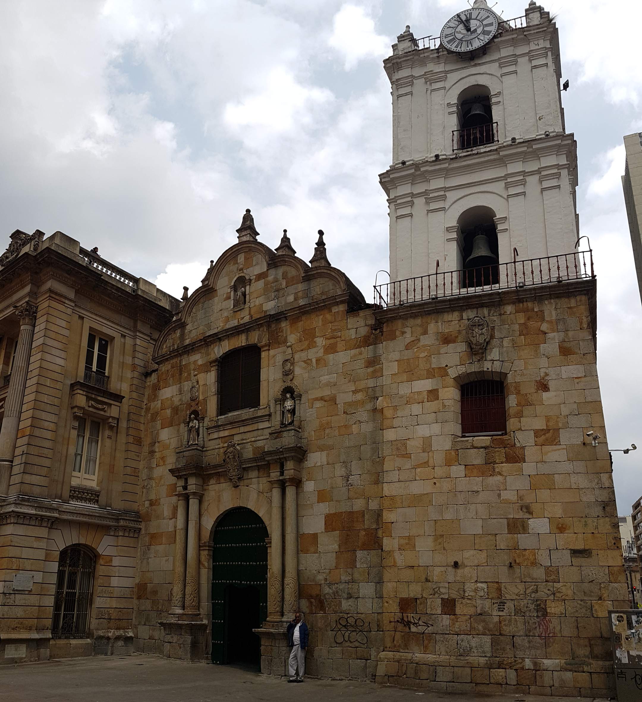 Im großen Bogen komme ich schließlich in belebtere Straßen und an der alten Kirche Nuestra Señora de la Candelaria vorbei zur großen Plaza de Bolívar mit der mächtigen Kathedrale.
