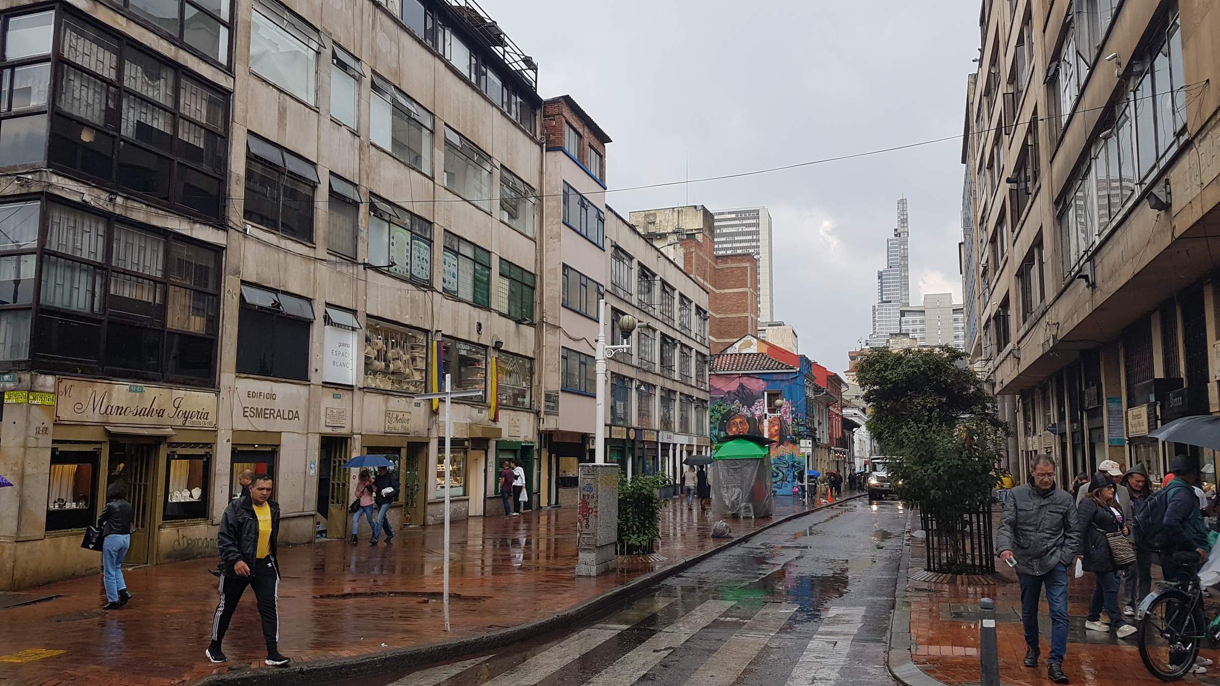 Von der Plaza folge ich dem Menschenstrom entlang der breiten Carrera 7 , die zu weiten Teilen Einkaufsstraße ist. Zwischendrin erleichtern sich die dunklen Wolken mal mit einem ordentlichen Regenguss. Doch ich lasse mich nicht ausbremsen und lande nach einem 6-Stunden-Marathon!! wieder auf der inzwischen gut gefüllten Plazoleta del Chorro de Quevedo.