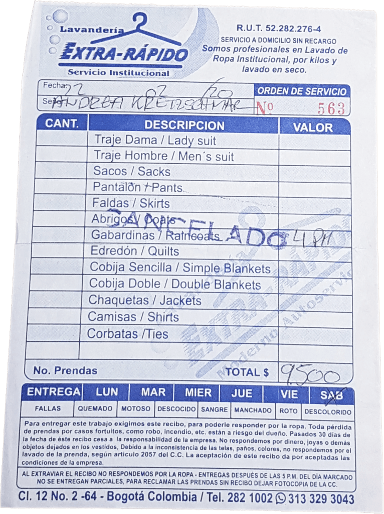Ich verlasse das Museum fluchtartig, als mir um 17.45 Uhr siedend einfällt, dass ich noch meine Wäsche bei der Wäscherei abholen muss. Schnell ein Blick auf Google – okay, offen bis 18 Uhr. Jetzt aber die Haxen geschwungen und zurück in die Altstadt. Doch dort stehe ich vor der bereits seit 14 Uhr verschlossenen Ladentür. Am Samstag hat die Wäscherei nur bis frühen Nachmittag auf – ja so ein Mist!! Das hätten sie mir ja mal sagen können und ich hätte sie gleich gebeten, meine fertige Wäsche im Hostel drei Häuser weiter abzugeben. Über Mobilnummer und mit Hilfe der Hostel-Reception versuchen wir zwar noch, jemanden zu erreichen. Aber die Inhaber wohnen außerhalb Bogotás und kommen erst am Montag wieder in die Stadt. Also, muss ein Plan B her – was angesichts der geschlossenen Läden am Wochenende sowohl in Bogotá als auch in Yopal schwierig werden wird.