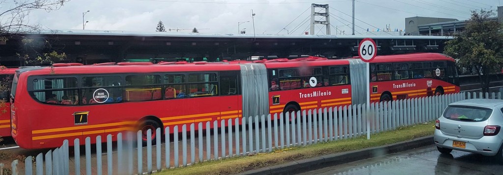 Im Vorbeifahren sehe ich nun auch mal die ewig langen TransMilenio Busse, die in Bogotá anstelle einer Metro unterwegs sind. Sie haben freie Fahrt auf einer eigenen Spur und sind oft dreimal so lang wie gewöhnliche Busse.