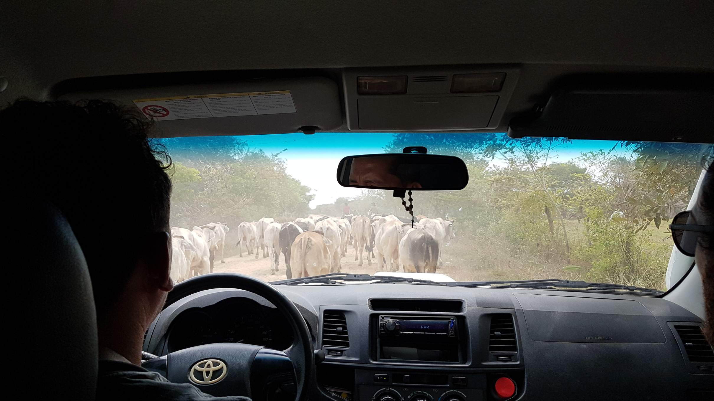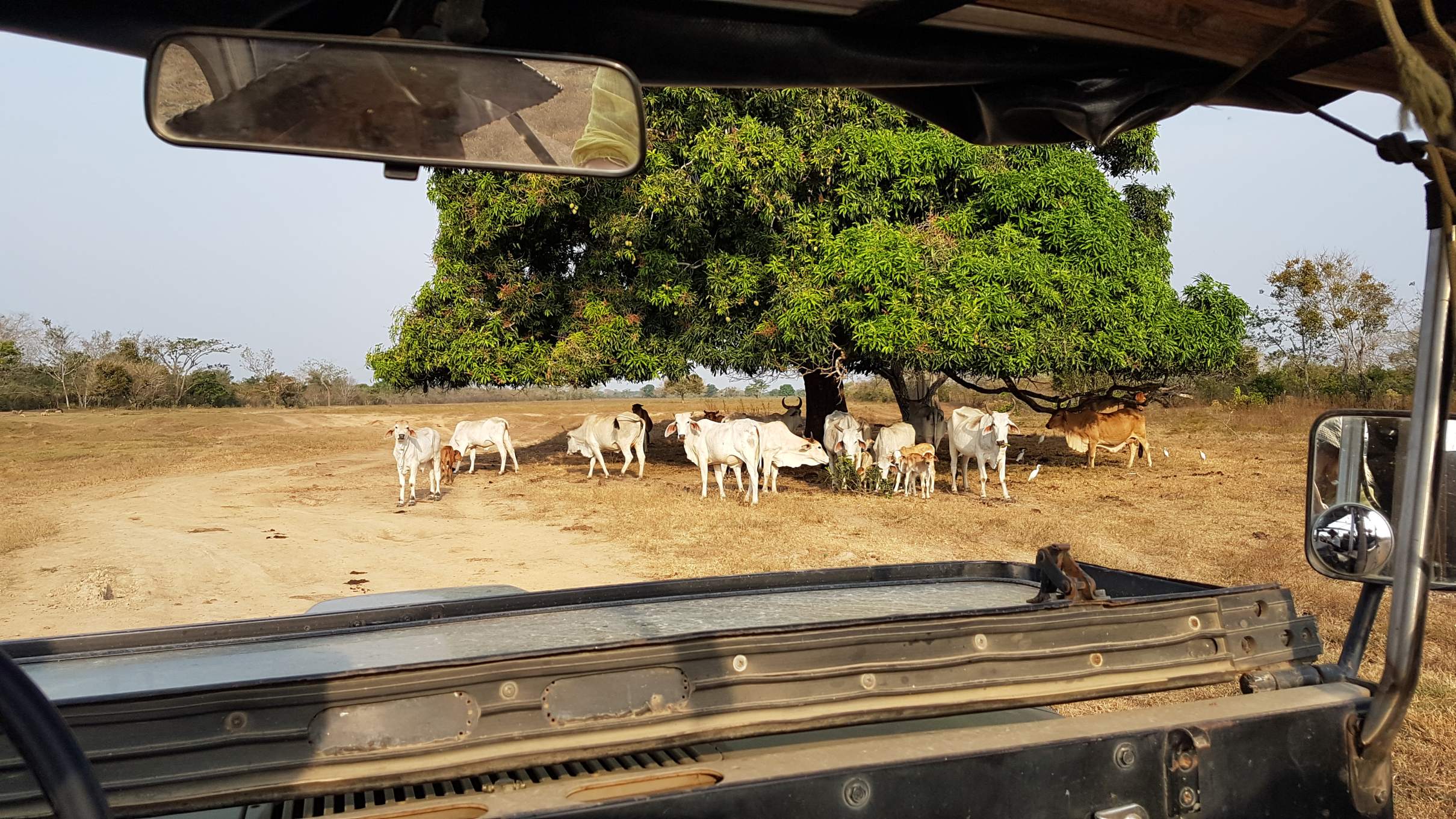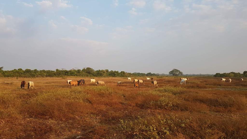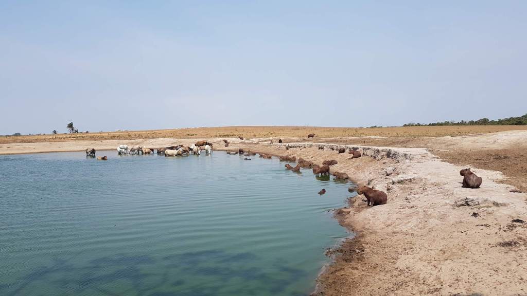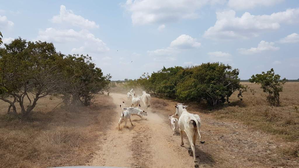 Mit dem Holzkanu setzen wir zur anderen Seite über, wo uns unser Fahrer und Guide Franklin in einem alten Jeep erwartet. Auf geht’s zur ersten kolumbianischen Safari. Immer und überall zu sehen sind Rinder-, Pferde- und Capybara-Herden. In Peru happy, wenigsten ein Wasserschwein-Pärchen am Amazonas entdeckt zu haben, lungern sie hier in Massen am und im Wasser herum.
