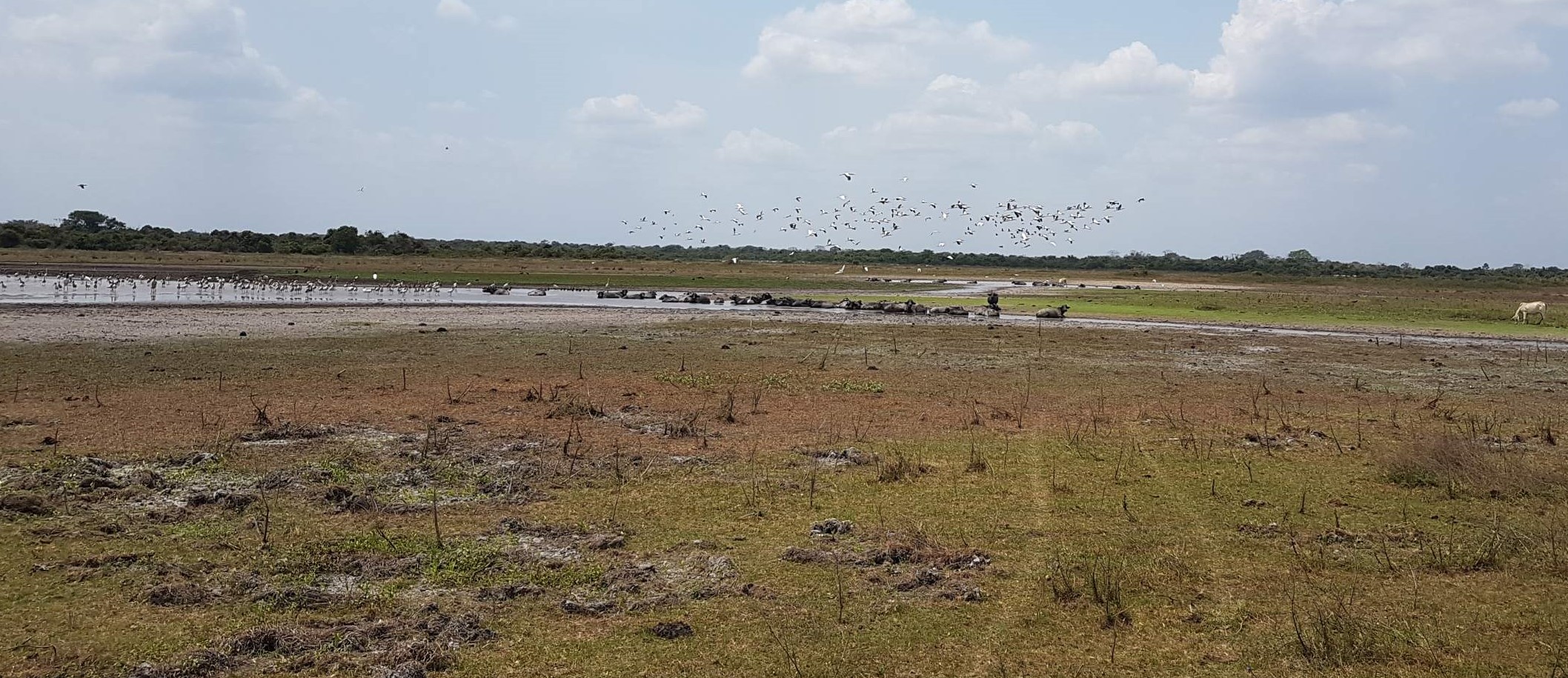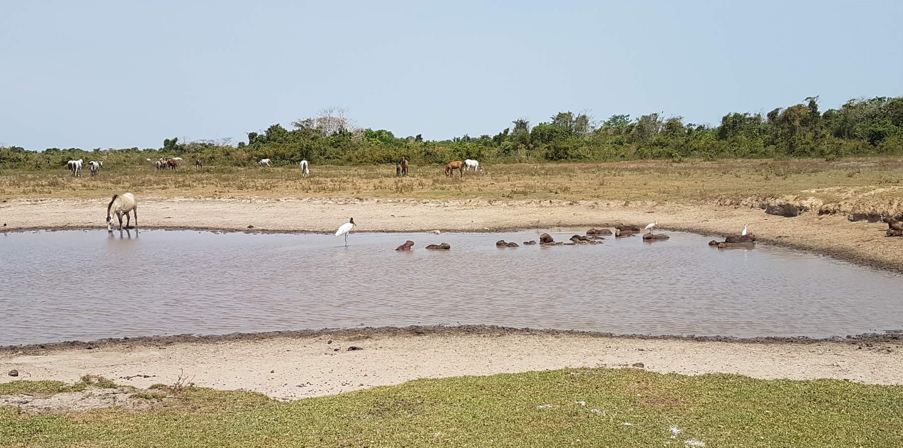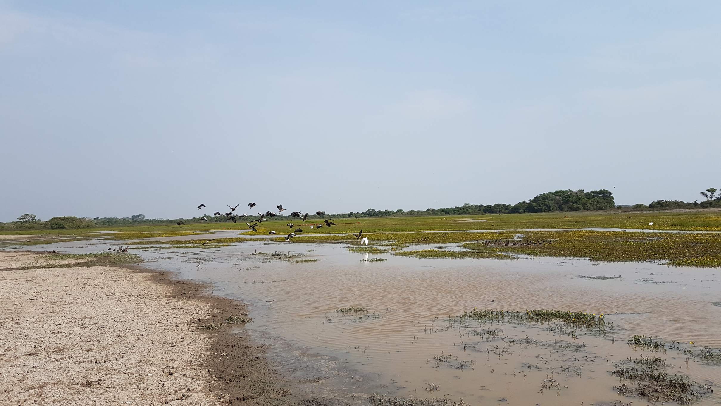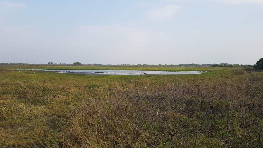 Oder in dem, was davon noch übrig ist. Denn die Landschaft erweist sich entgegen meinen Erwartungen als ziemlich ausgedörrt und trocken. Abgesehen vom Baum- und Heckenbestand entlang des Ariporo oder rund um die zusammengeschrumpften Seenplatten und Wassertümpel, ist alles braun.