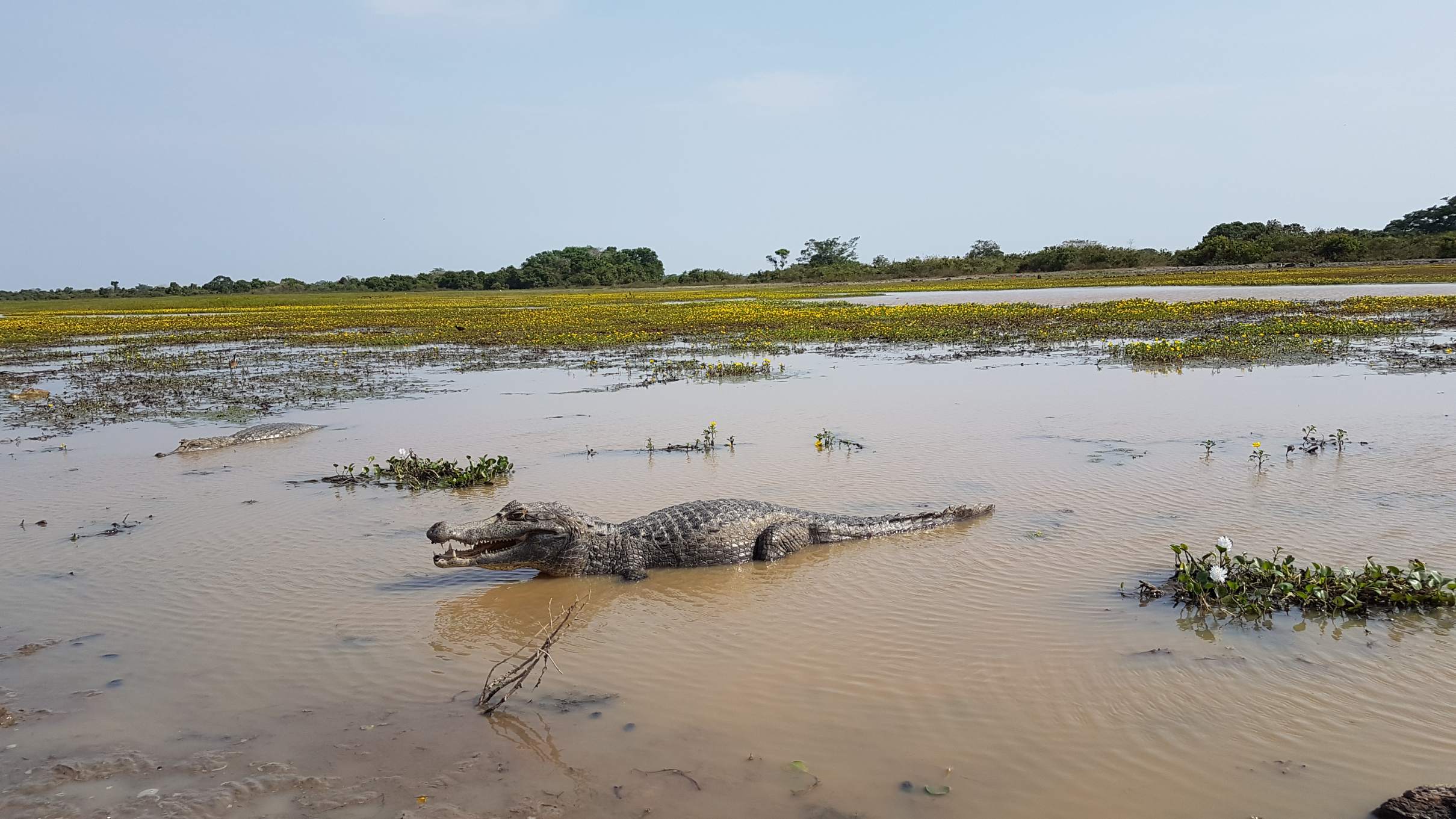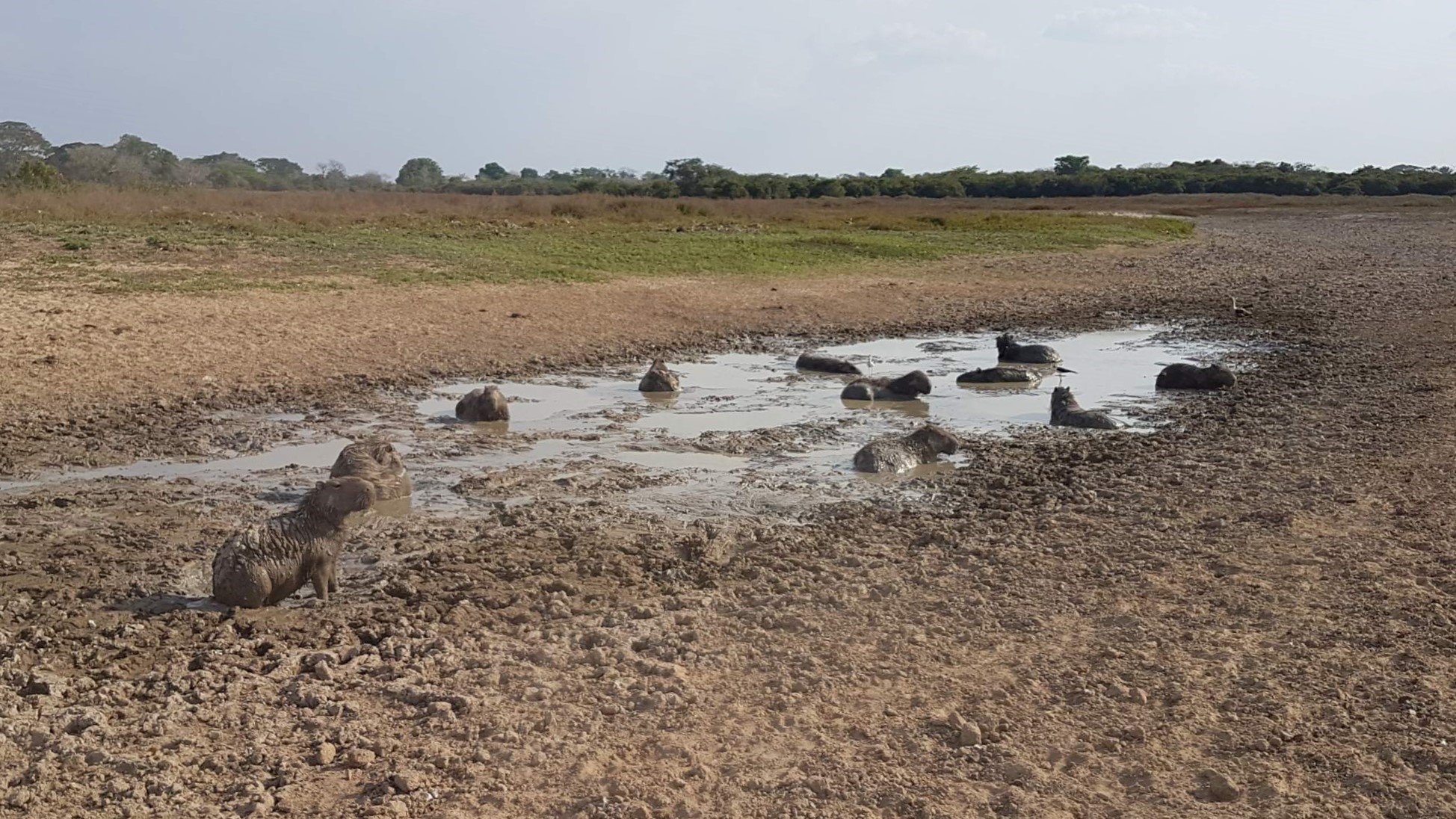 Am nächsten Tag geht es um 6.30 Uhr erneut auf Pirsch. Wir fahren eine gefühlte Ewigkeit bis wir um 8.30 Uhr an einer Wasserstelle ankommen, wo eine Anakonda gesichtet wurde und lauern gemeinsam mit zwei anderen Jeep-Gruppen über eine Stunde im Uferdickicht – aber nichts tut sich. Kaum haben wir uns entfernt und unser Frühstücks-Sandwich ausgepackt, kommt ein erneuter Anakonda-Alarm. Bis wir durch den Wald zurück zum Wasser geschlichen sind, ist das Objekt unserer Begierde schon wieder untergetaucht. Einige Geduldige konnten die Anakonda ins Wasser kriechen sehen. Wir sehen hingegen nur die besorgten Wasserschwein-Mamis, die ihren Kindern ob der Gefahrenlage Schwimmverbot erteilen.