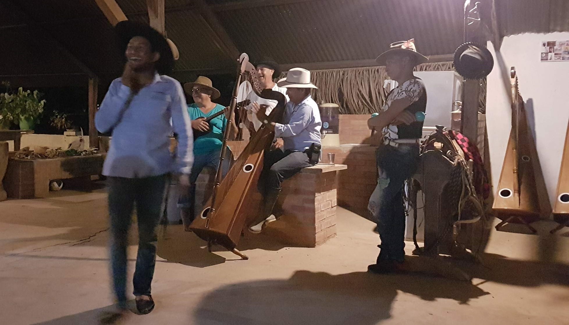 Das junge, durchweg männliche Küchen-Team gibt wie immer sein Bestes, um uns in der spartanischen Open-Air-Küche ein abwechslungsreiches und wohlschmeckendes Menü zu zaubern. Und nachdem einige neue Gäste angereist sind, wird uns vom Chef Nelson Barragán und seinem Team die geliebte Musica llanera mit Arpa, Bandola, Cuatra und Maracas und der traditionelle Joropo-Tanz der Llaneros, also der kolumbianischen Gauchos oder Cowboys, dargeboten. Ausgerechnet ich werde als Tanzpartnerin ausgewählt. Nur gut, dass der Frau beim Joropo-Paartanz lediglich zufällt, das „aufgeregte tänzerische Balz-Gehabe“ des Mannes nahezu bewegungslos über sich ergehen zu lassen und seine Avancen mehr oder weniger wohlwollend zu erwidern.