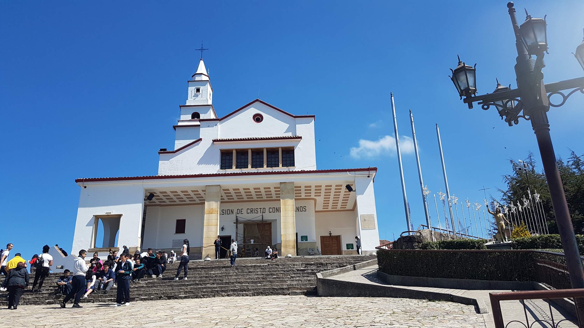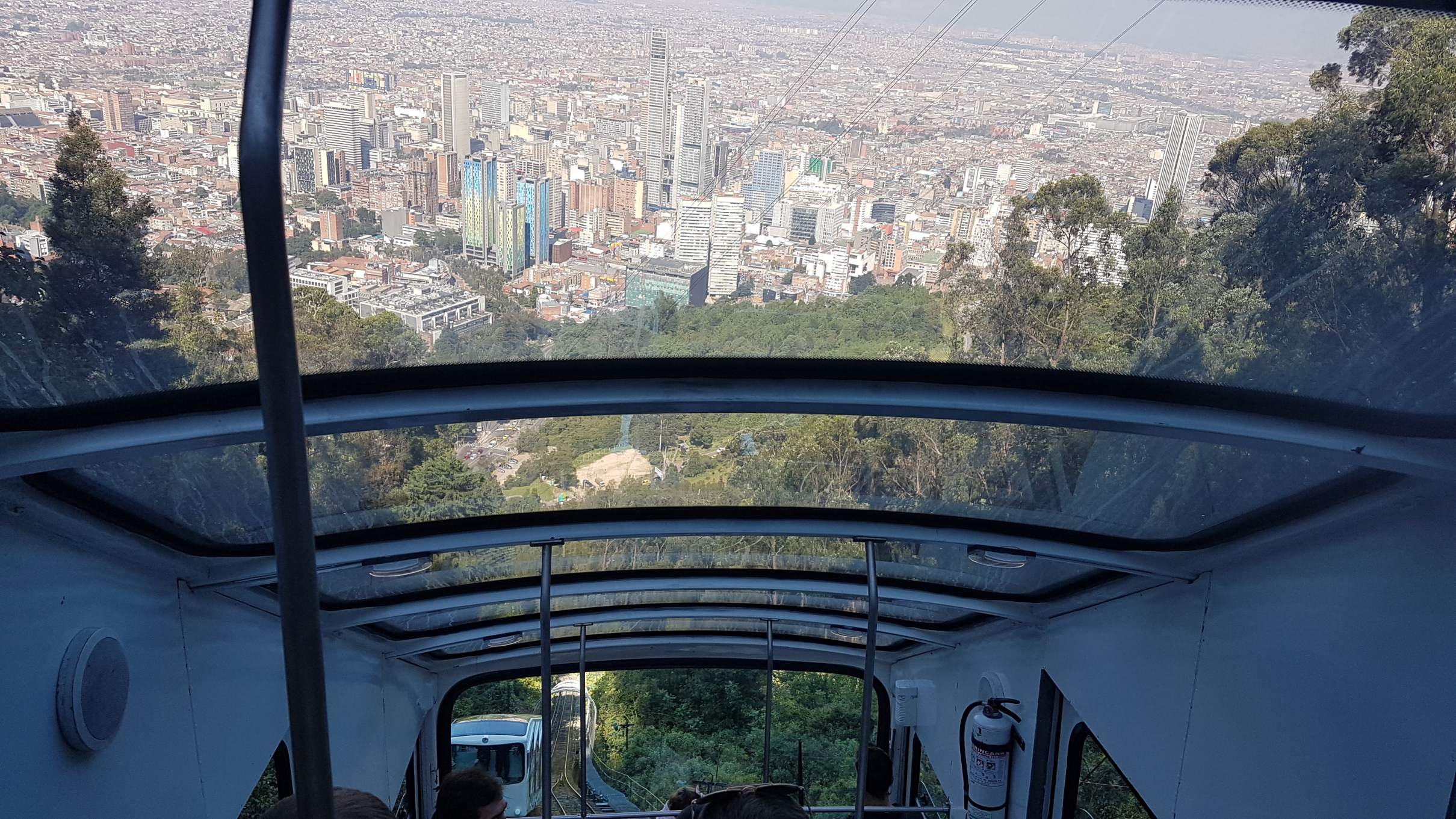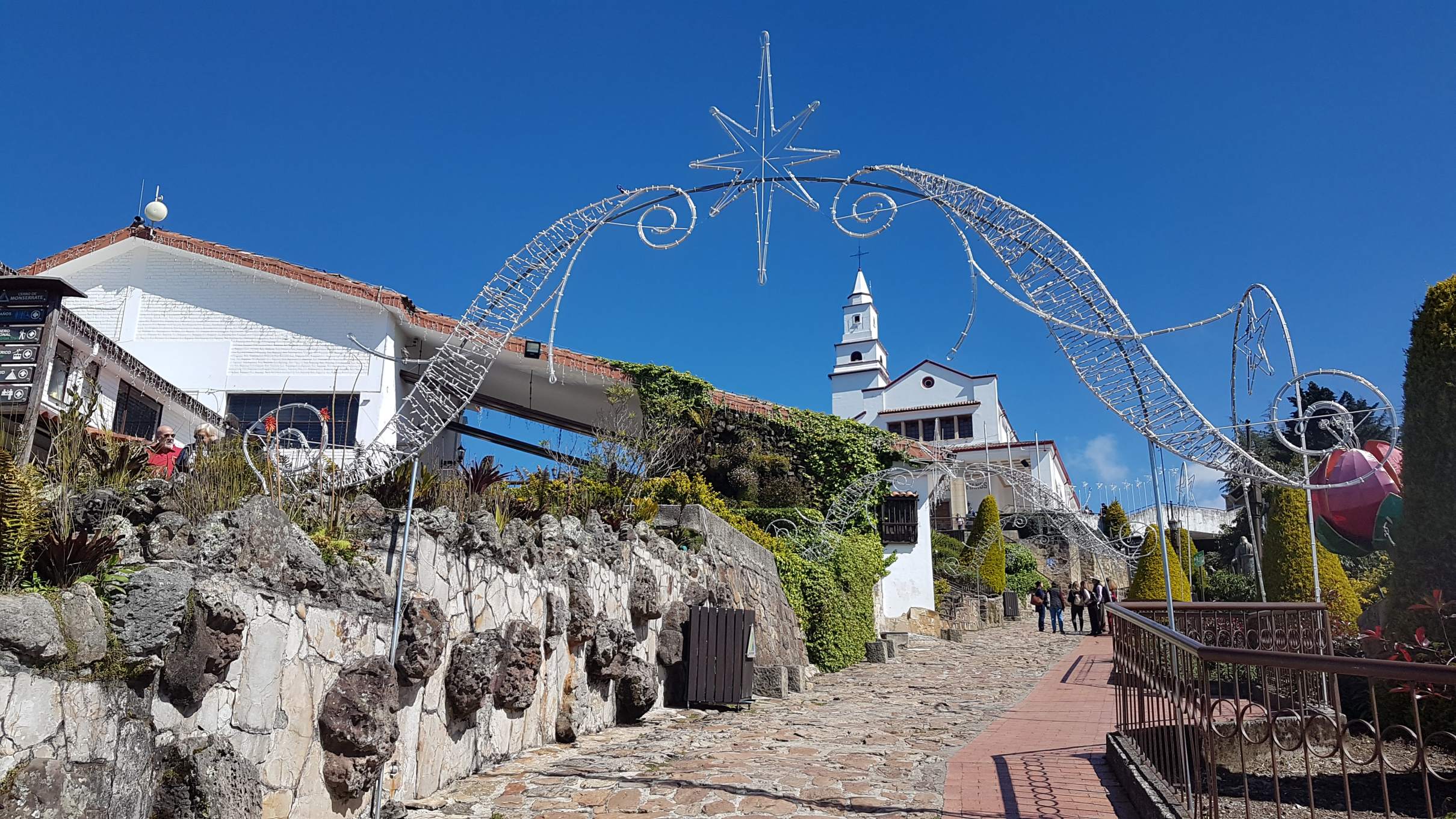 Buenos días Bogotá! Die Mega-City auf 2.650 m begrüßt mich bei meinem zweiten Besuch mit strahlend blauem Himmel und heißen Temperaturen. Das ist wie ein ganz besonderes Abschiedsgeschenk für mich, denn ich möchte an meinem letzten Tag auf jeden Fall noch den Hausberg, den Cerro de Monserrate, besuchen und mir Bogotá von oben anschauen. Obwohl ich ja gerne bergauf steige, treibt mir die Wegbeschreibung über die steilen 1.605 Stufen auf den 3.152 m hohen Gipfel bei dieser Hitze schon in Gedanken daran die Schweißperlen auf die Stirn. Deshalb entscheide ich wohlüberlegt, für die Auffahrt die Funicular zu benutzen und die Treppen am Nachmittag ohne Hast und Hetze abzusteigen. Gute Wahl!!