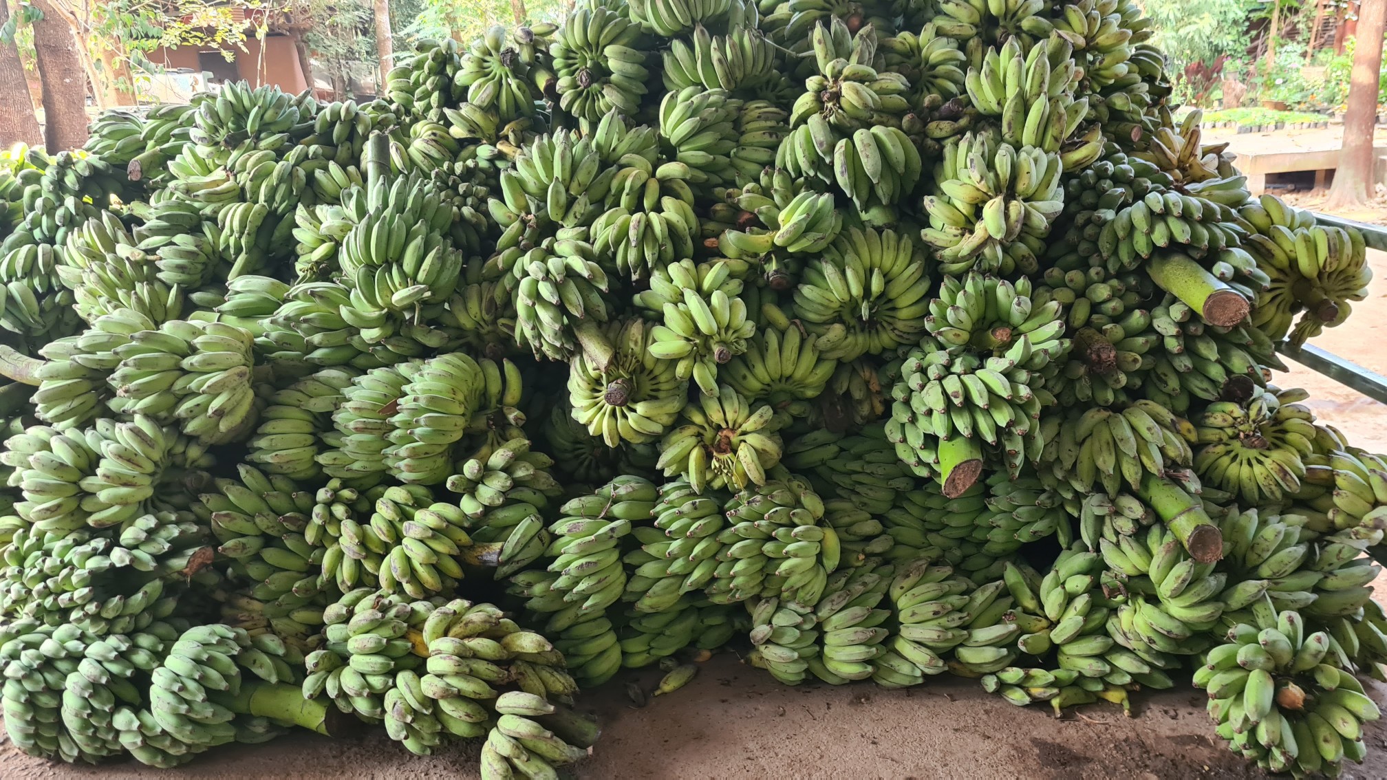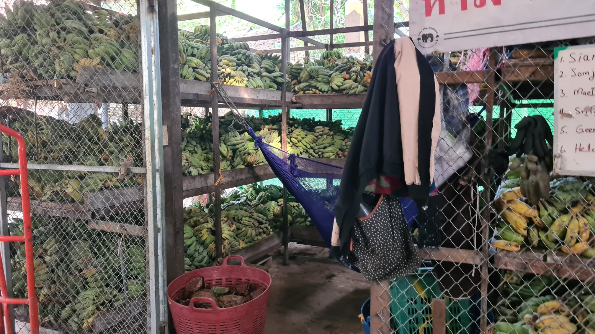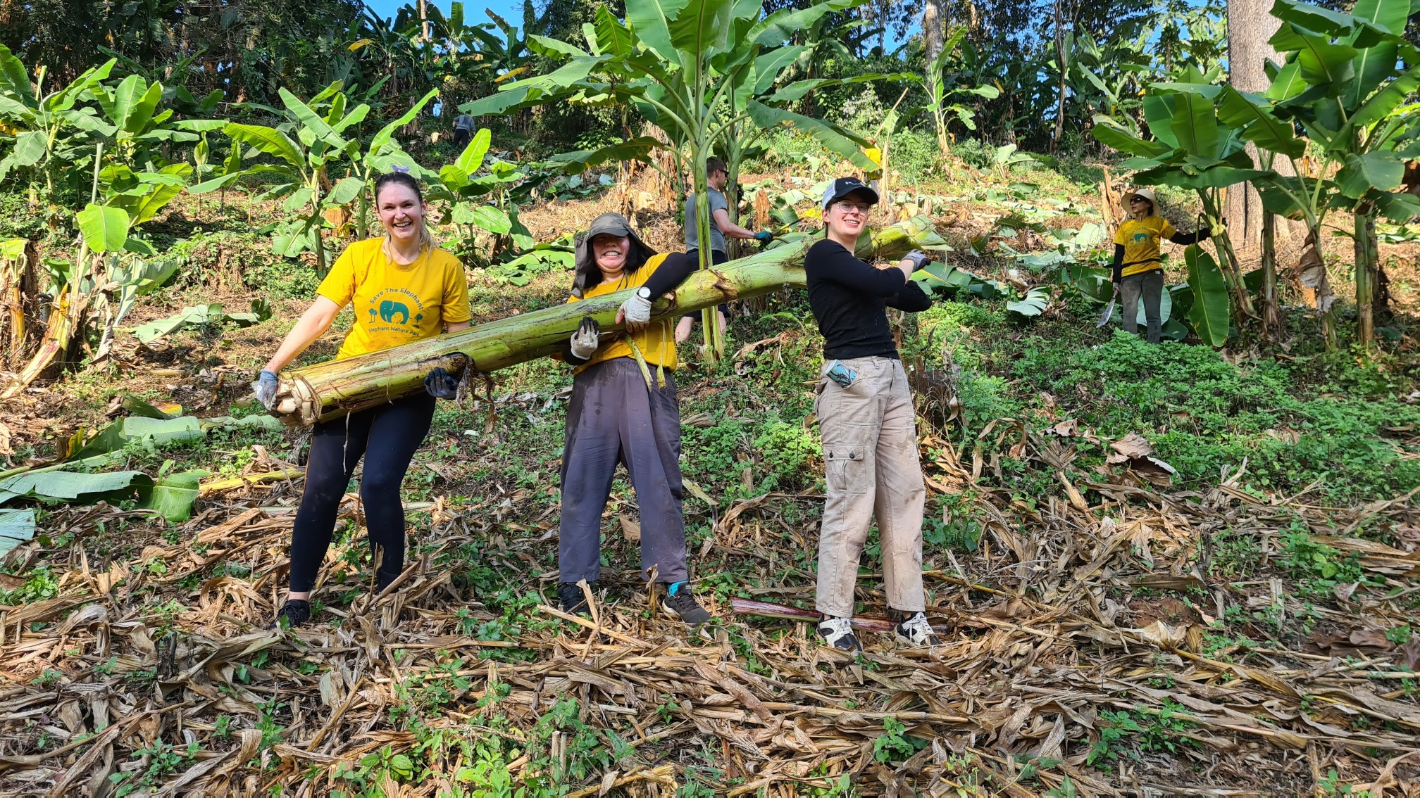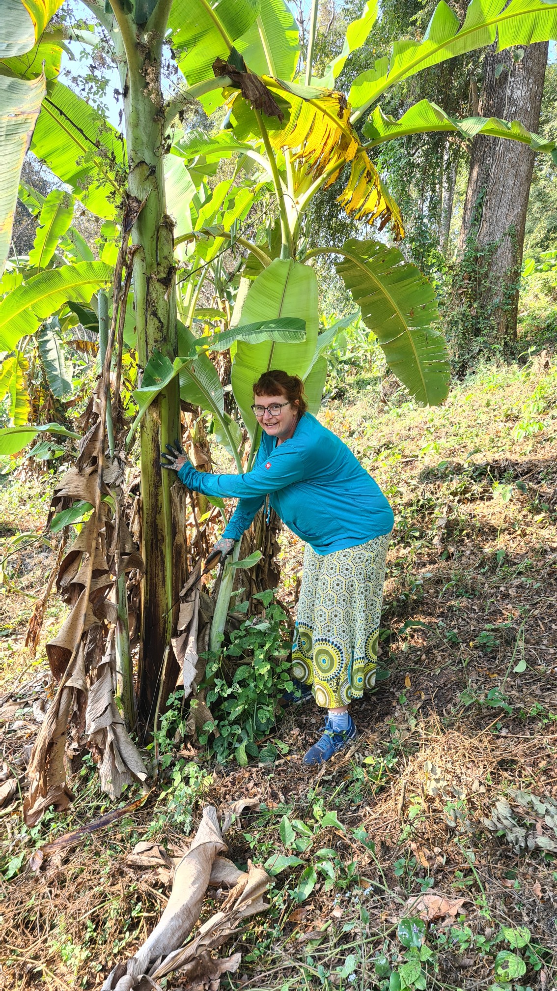 Der nächste Tag beginnt um 7 Uhr mit dem Frühstück, bevor um 8 Uhr unser erster Arbeitsdienst startet. Für unsere Gruppe geht es auf der Ladefläche des Lasters ins Nachbartal zu einer steil am Hang liegenden Bananenplantage. Wer hätte gedacht, dass Bananenstaudenernten so eine schweißtreibende Arbeit ist! Für das Schneiden mit der Machete braucht man Schmackes und den richtigen Dreh. Und auch für das Schleppen der überraschend schweren, wasserhaltigen Stämme zum Lastwagen ist Muskelschmalz gefragt.