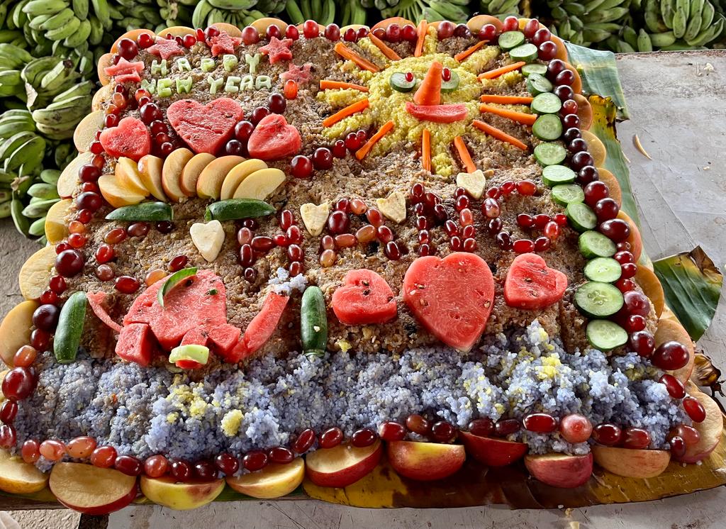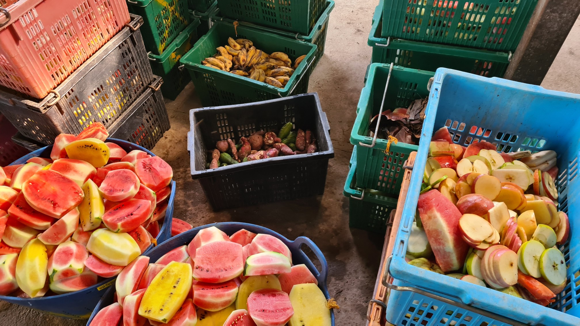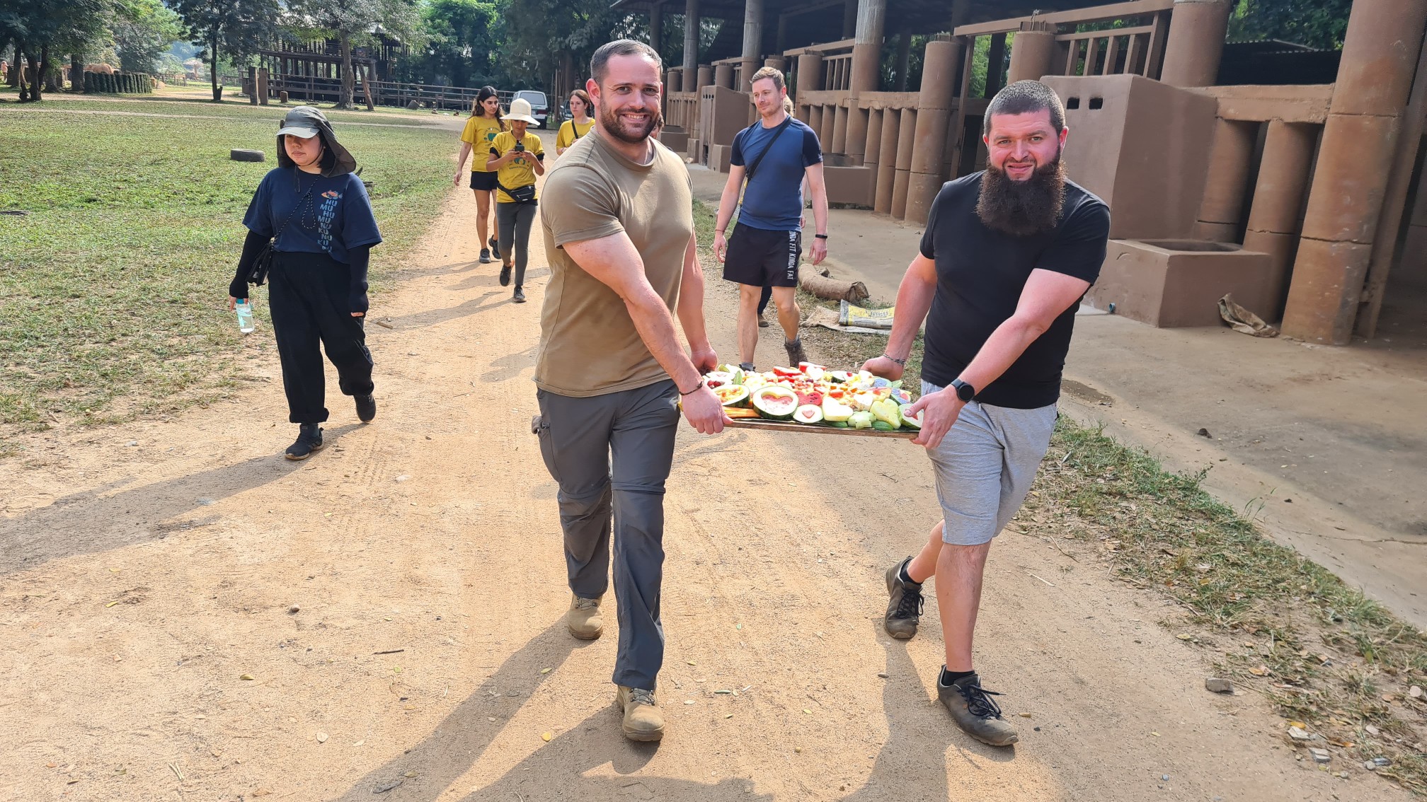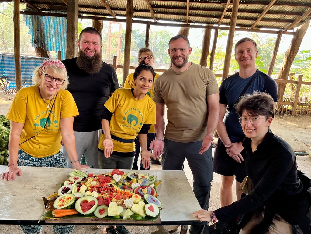 Anschließend dürfen wir dann mit Obst und Gemüse einen Elephant Cake kreieren. Die Profis aus dem ENP zaubern fast jeden Tag wirklich wunderbare Unikate. Unsere Erstlingswerke schauen dagegen noch etwas chaotisch aus. Aber den Elefanten ist das ja schlussendlich egal, Hauptsache es gibt Saftiges und Gesundes zum Naschen. Schließlich frisst so ein Elefant pro Tag ca. 150-175 kg und trinkt 70-150 l Wasser!