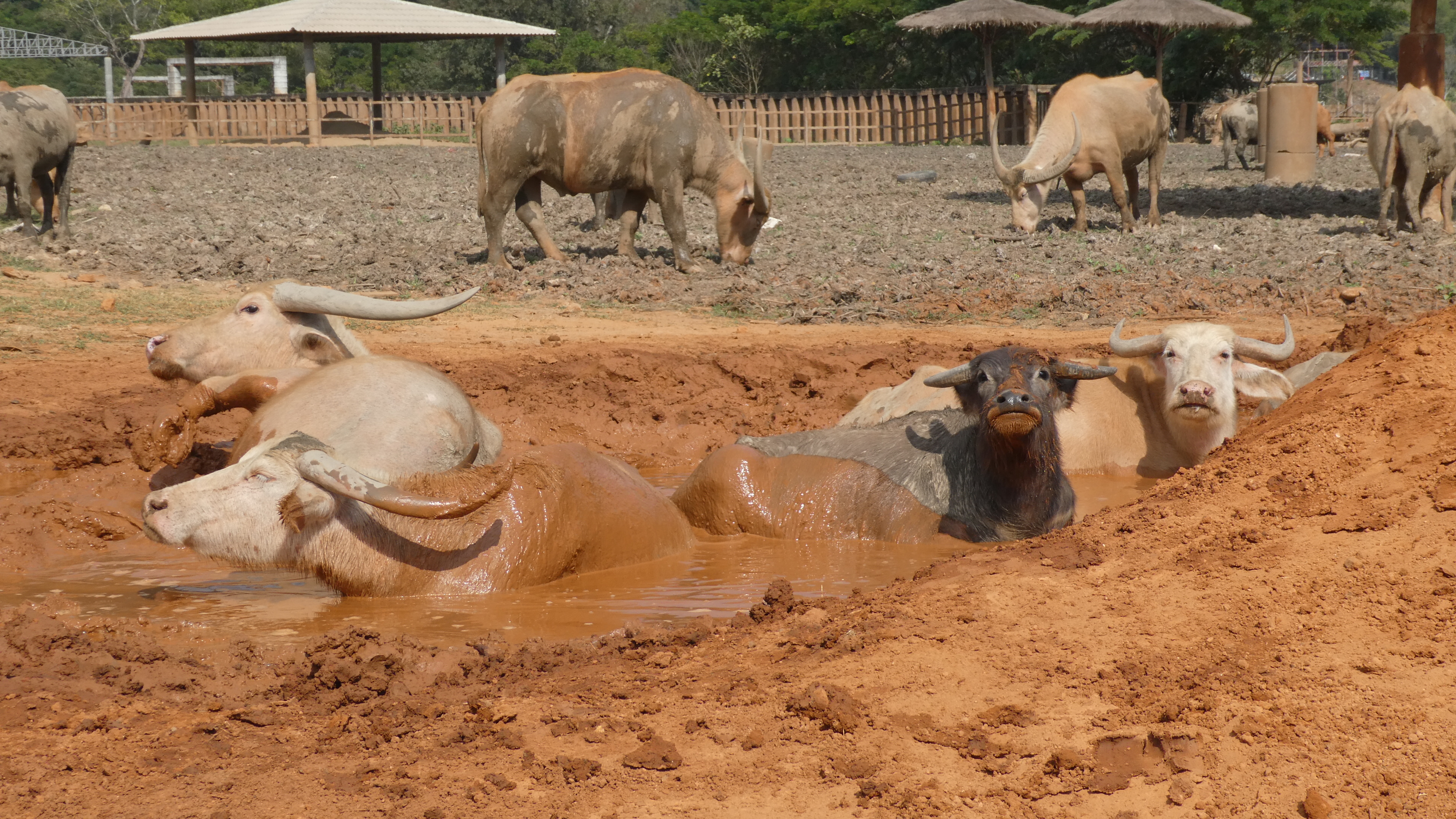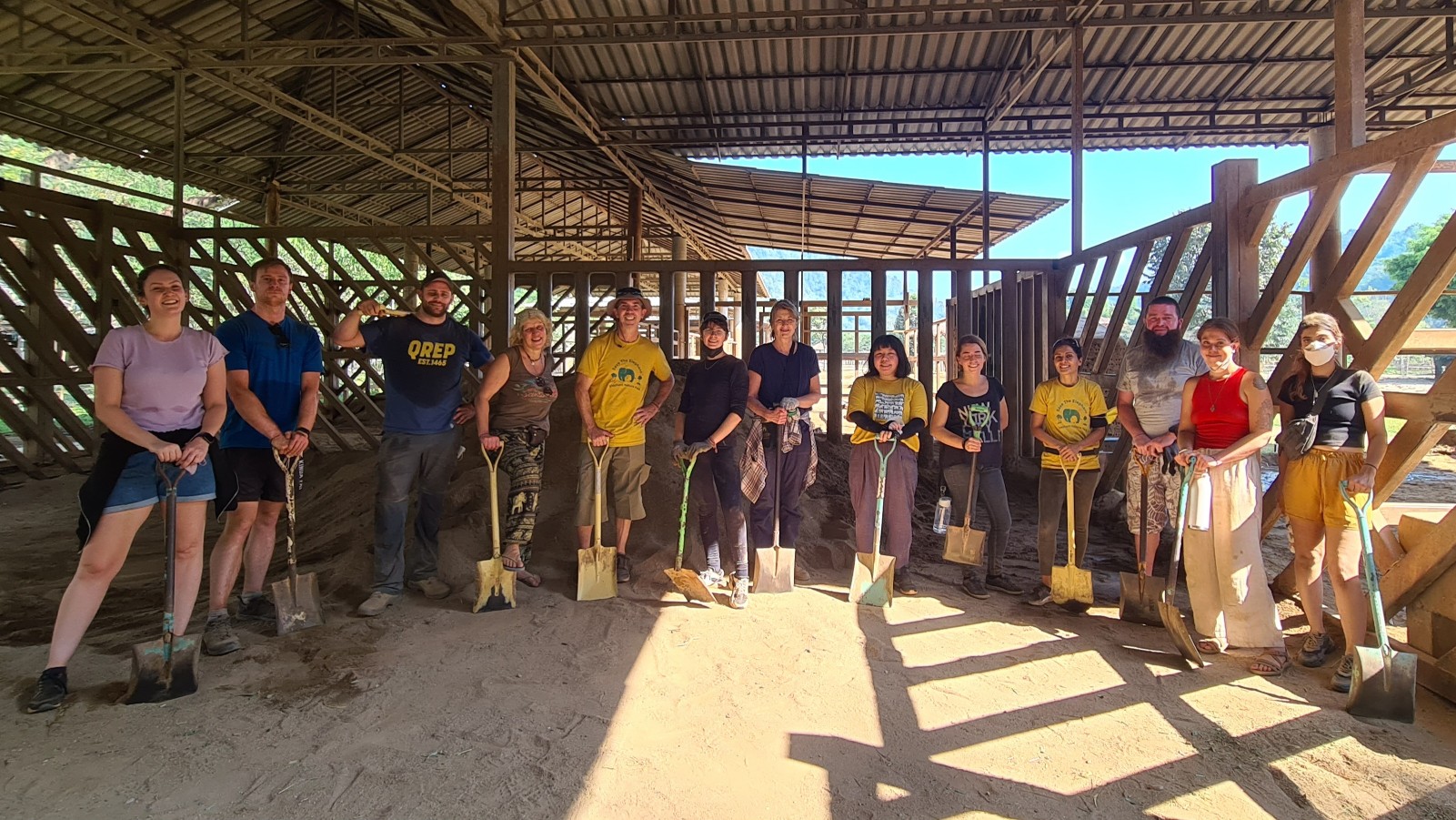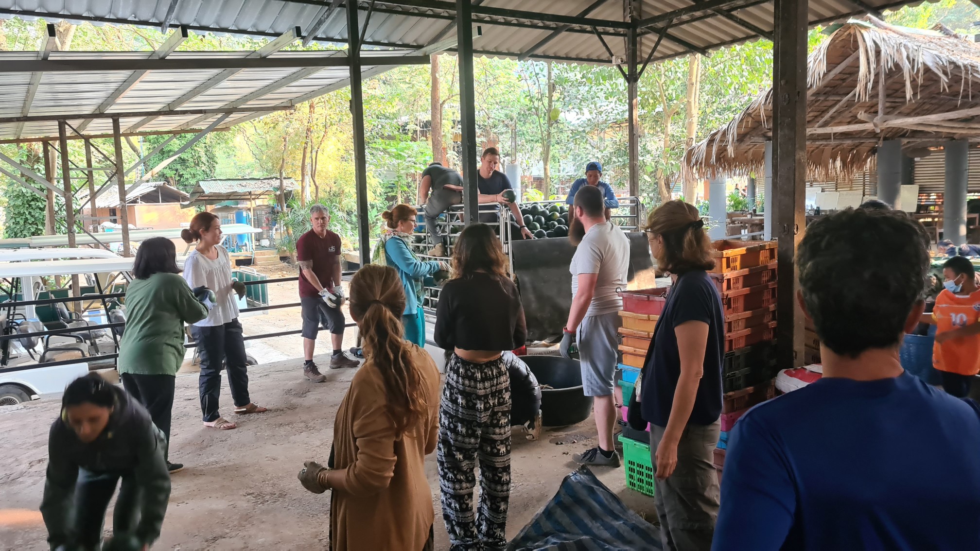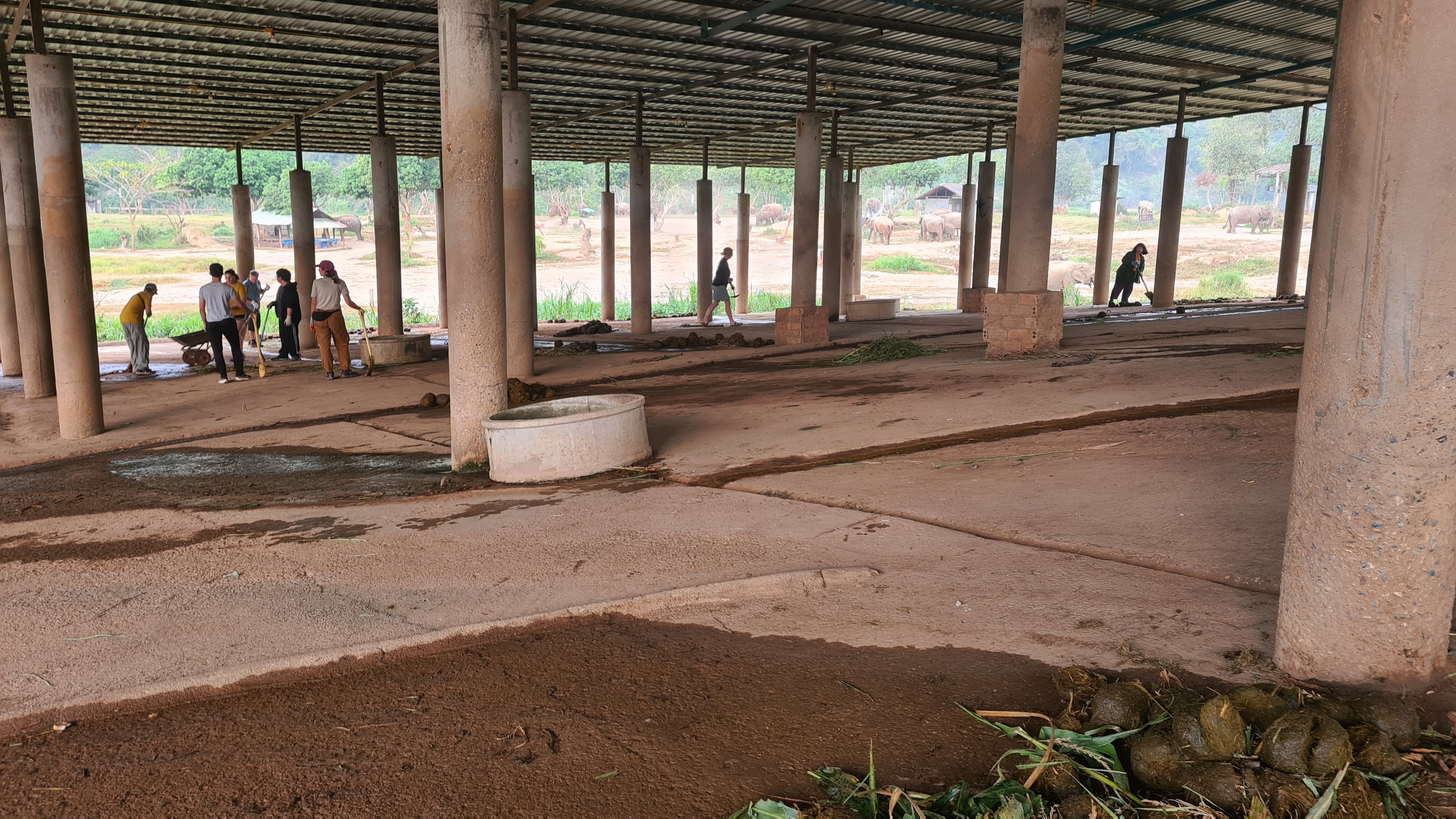 An Tag 4 unserer Volunteeringwoche fahren wir zur Unterstützung ins Nachbarcamp Chok Chai. Was es mit der Entwicklung des Camps auf sich hat, kann man super in der WDR-Doku verfolgen. Noch wird es einige Zeit dauern, bis das Camp, die Elefanten und ihre Mahouts die schlechten Zeiten sichtbar hinter sich gelassen haben. Wir sind jedenfalls schockiert über die „Elefanten-Parkgarage“, zu deren Reinigung wir hergekommen sind. Unvorstellbar, dass die armen Tiere hier früher Tag und Nacht auf dem abgeschrägten Betonboden zwischen ihrem eigenen Kot und Urin standen, ohne jeglichen Zugang zu Wasser und Futter.
