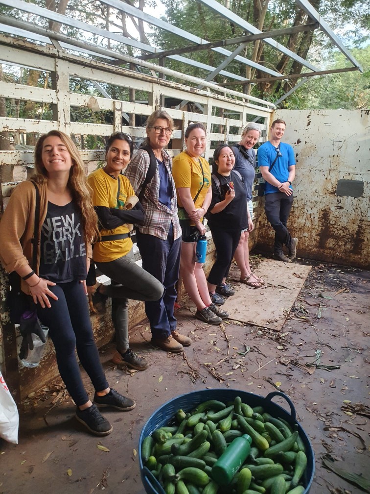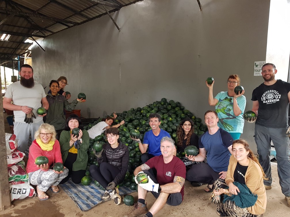 Ah, wir sehen es schon von unserem Frühstücksplatz aus – der Melonen-Truck ist vorgefahren. Also, auf, auf, an die Arbeit! Eins ist gewiss: In einer Volunteering-Woche im ENP erübrigt sich jedes Fitnessstudio. Selbst mit vereinten Kräften und mit durchdachter Systematik dauert es eine Weile, bis die Fracht abgeladen ist und die Melonen kullersicher und platzsparend gestapelt sind.