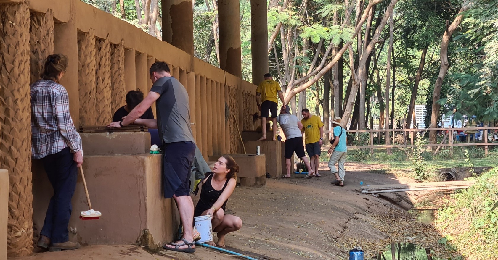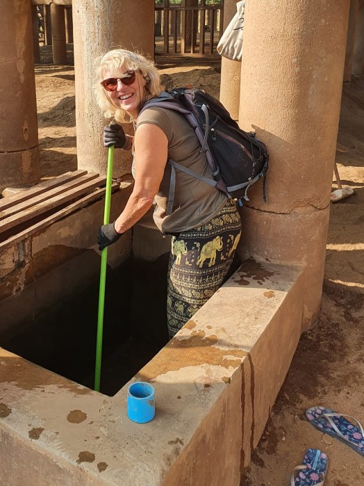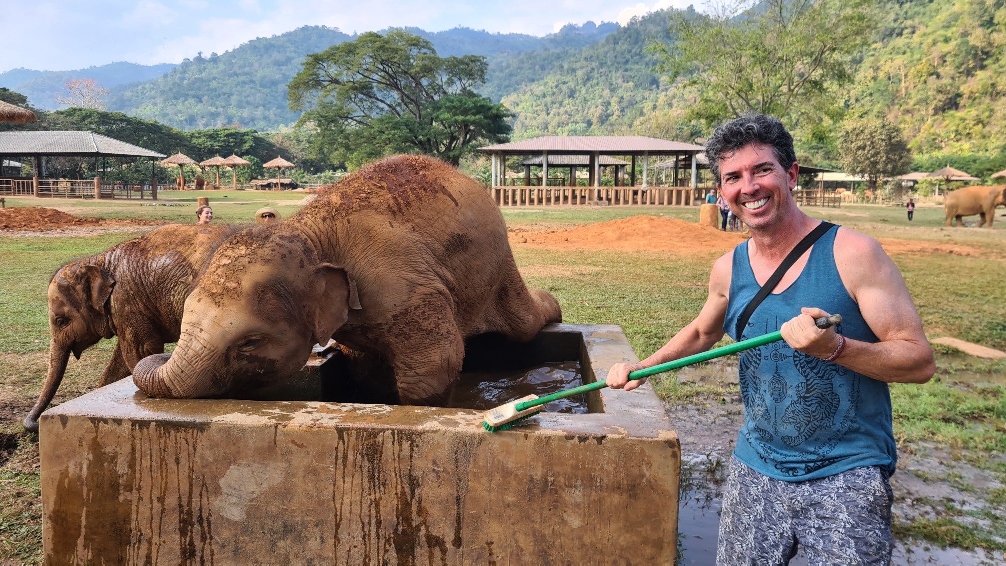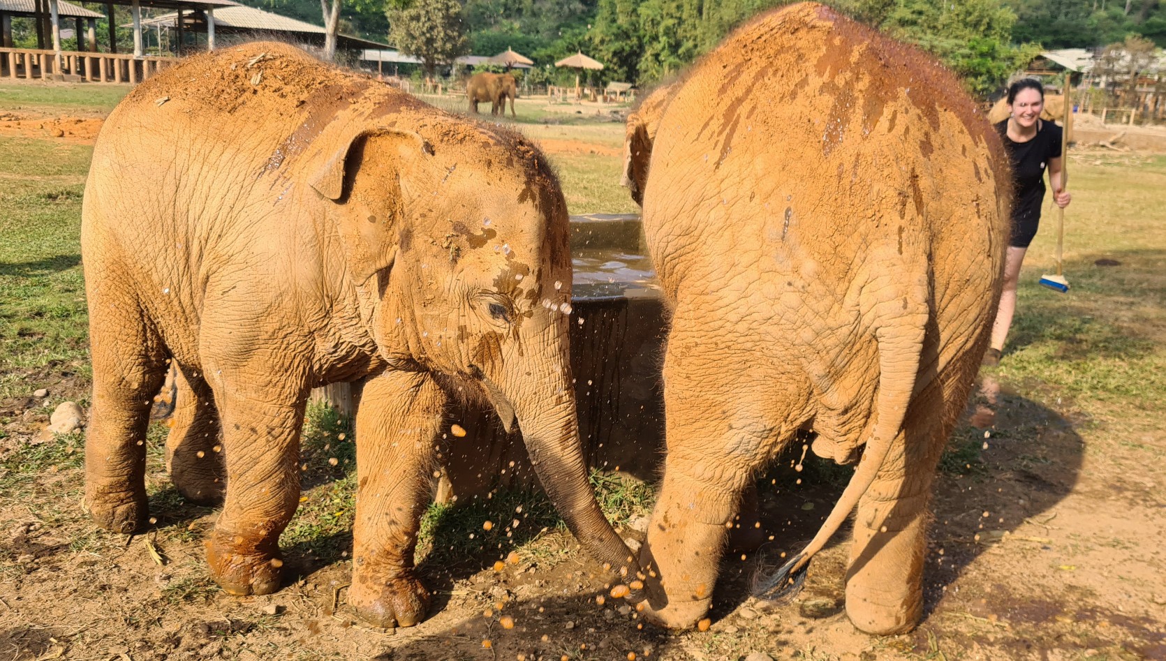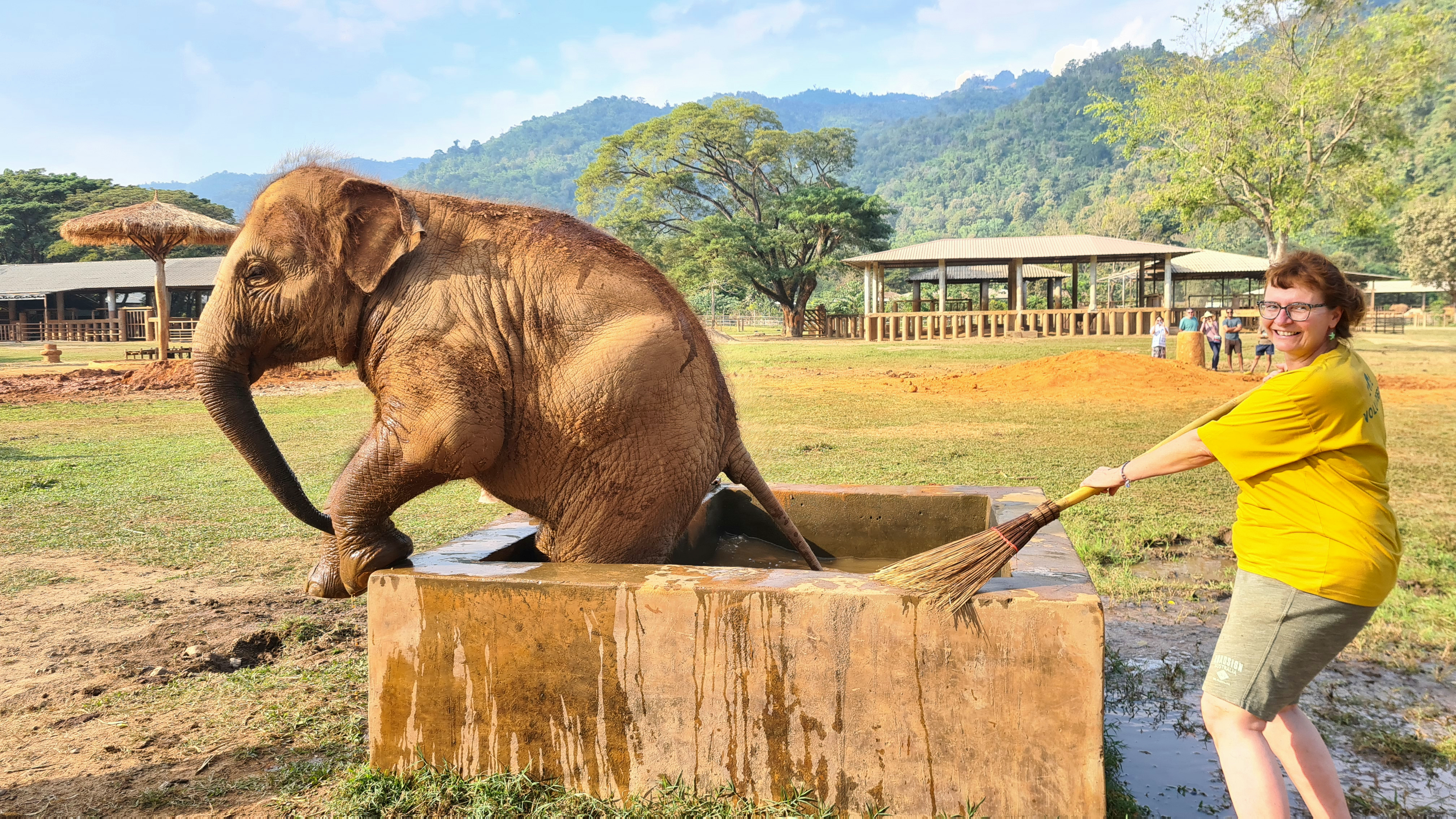Frisch gestärkt wartet am Nachmittag Teil 2 unseres Volunteering-Jobs auf uns: Wasserbassins reinigen. Das ist wiederum mühevoller als es klingt, denn die großen Bassins zum Trinken veralgen sehr schnell und müssen tatsächlich mit Wurzelbürste und Schrubber gewienert werden. Aber dank der elefantösen Unterstützung von PyiMai und ChaBa wird uns diese superlustige Putzaktion in ewiger Erinnerung bleiben.