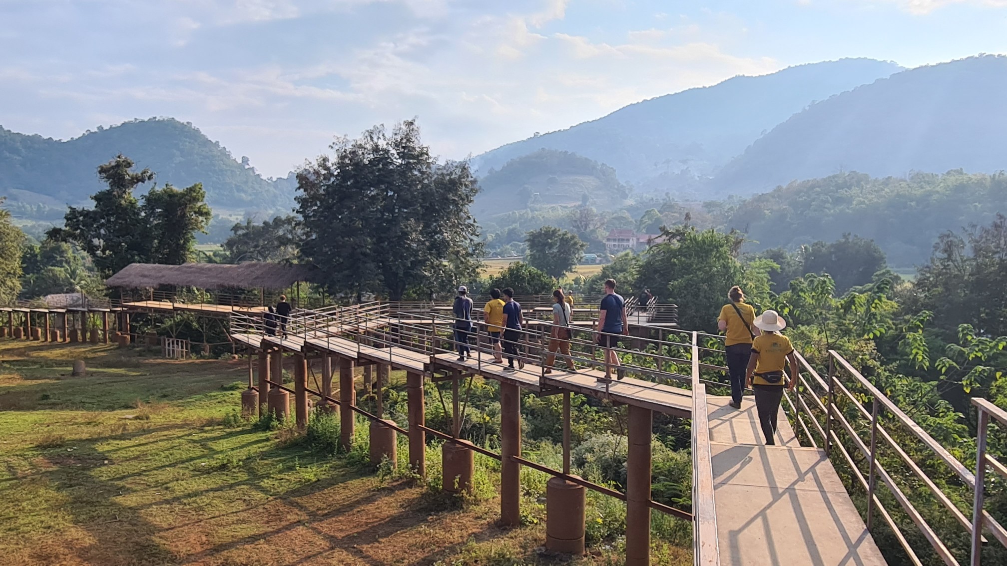 Nachdem wir ein paar Elefanten glücklich gemacht haben, besuchen wir mit Lom noch die Elefanten der KhamLa-Gruppe, die in einem Areal weiter oben am Fluß den Tag verbringen und jeden Abend durch den Fluss watend zurück in den Park kommen. Rund um die Anlage ist ein Skywalk installiert. Ist nun Geschmacksache, gewährleistet aber, dass man die Tiere gut beobachten kann und auf jeden Fall in Ruhe lässt.