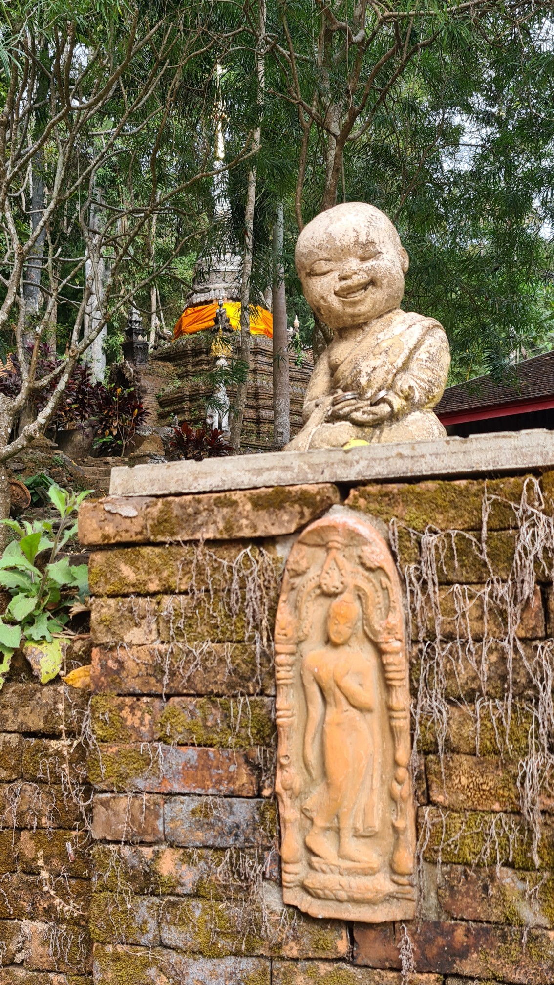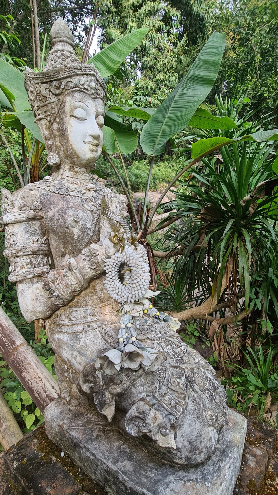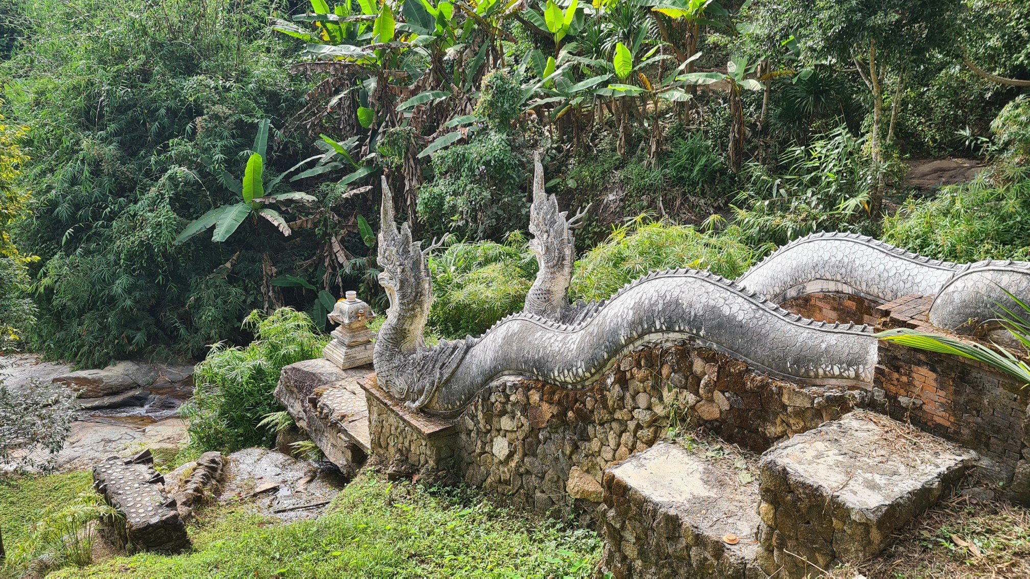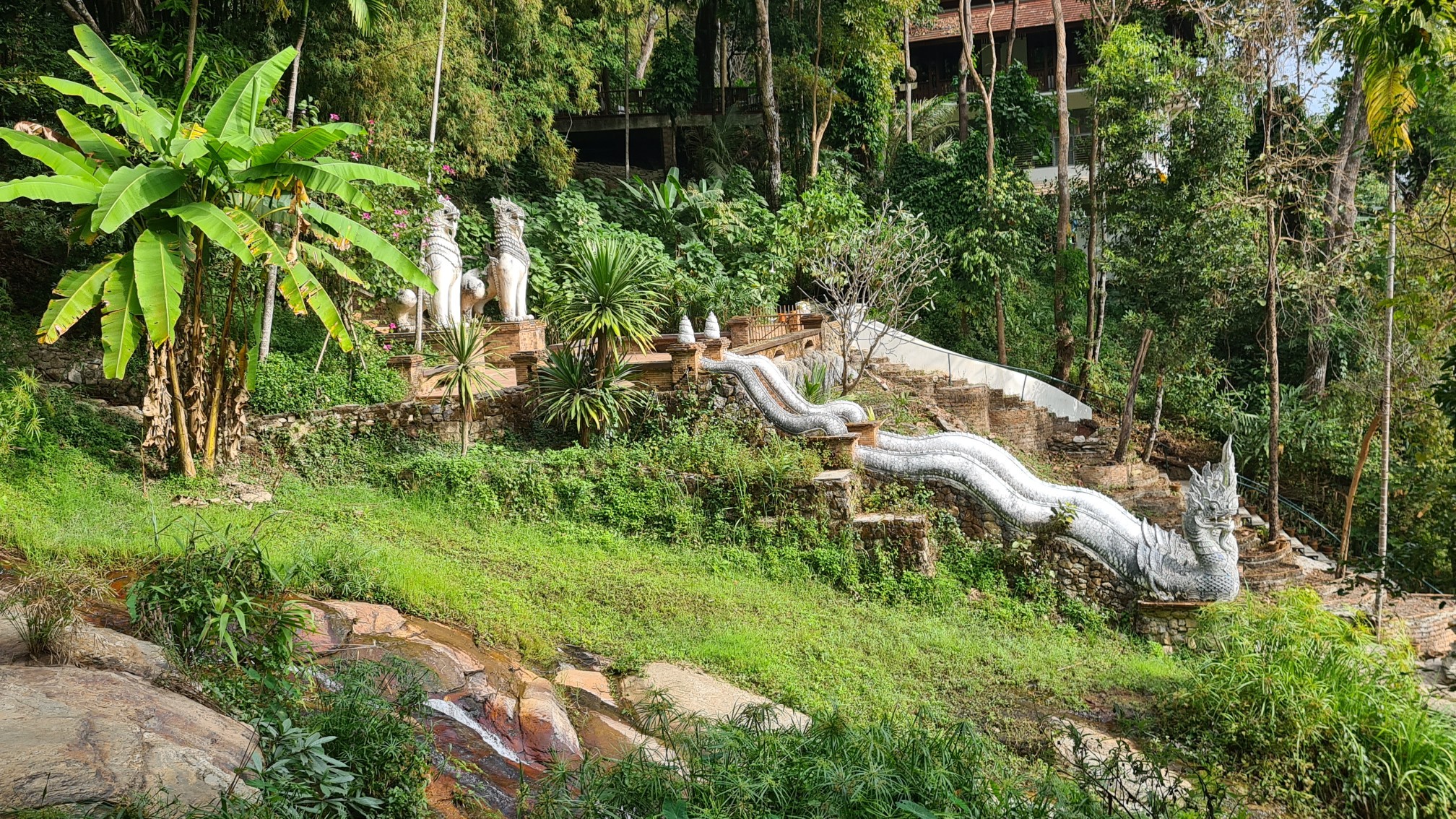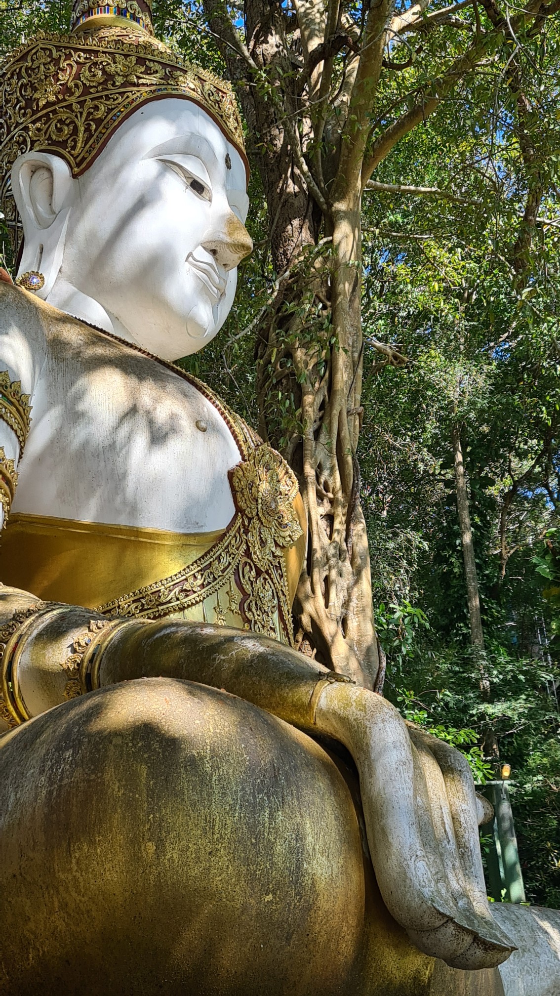 In Muse wandele ich also über die kleinen Brücken, über den Wasserfall mit einem Wahnsinnsblick auf Chiang Mai und durch die kleinen gepflasterten Wege, entdecke hier eine überwucherte Gebetshalle, dort einen verwilderten Chedi und viele kleine liebevolle Statuen, aber auch große, respekteinflößende Gestalten. Da kommt sogar ein bisschen Indiana-Jones-Feeling auf.
