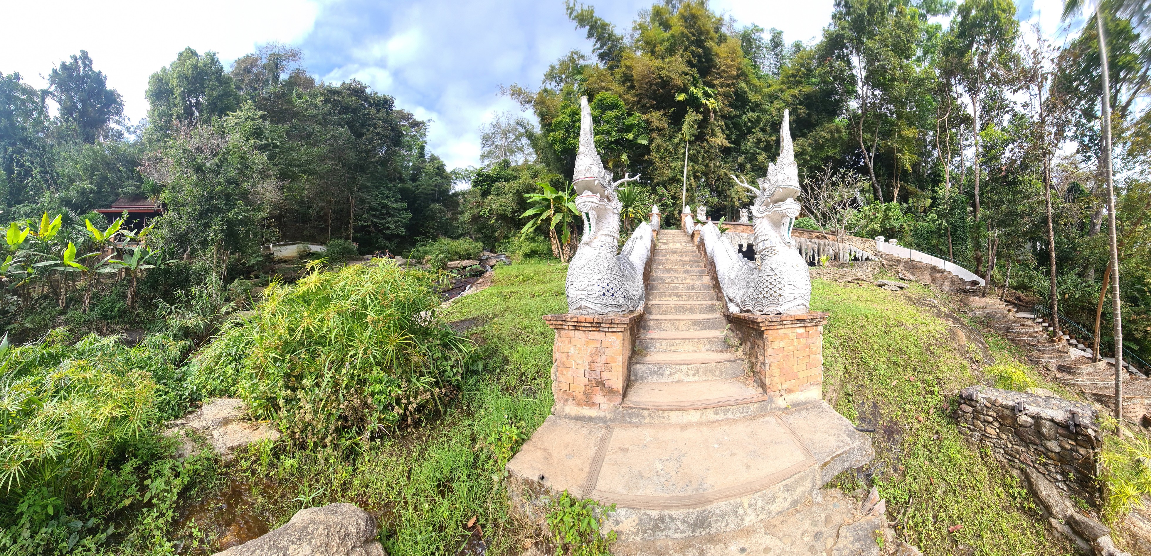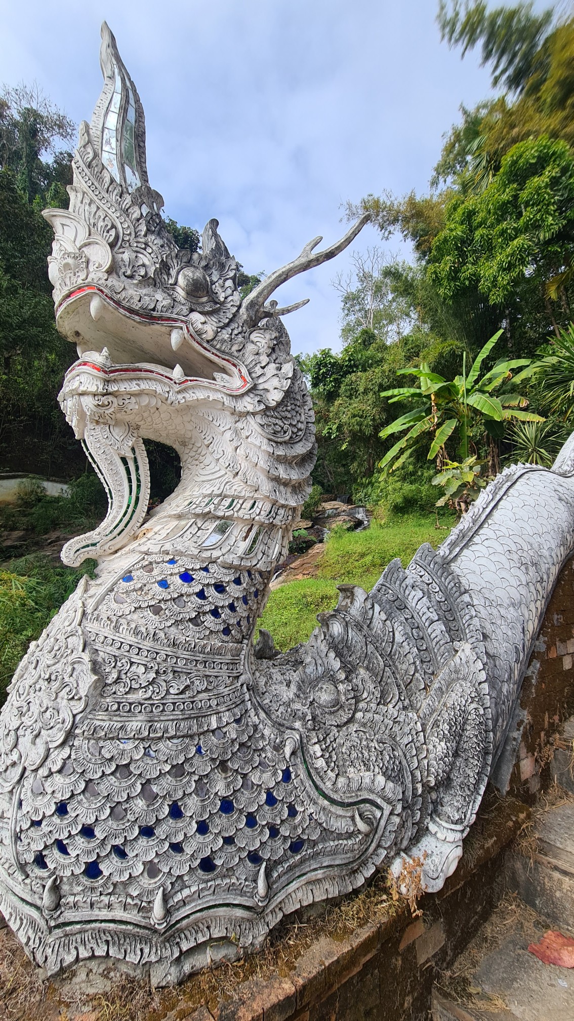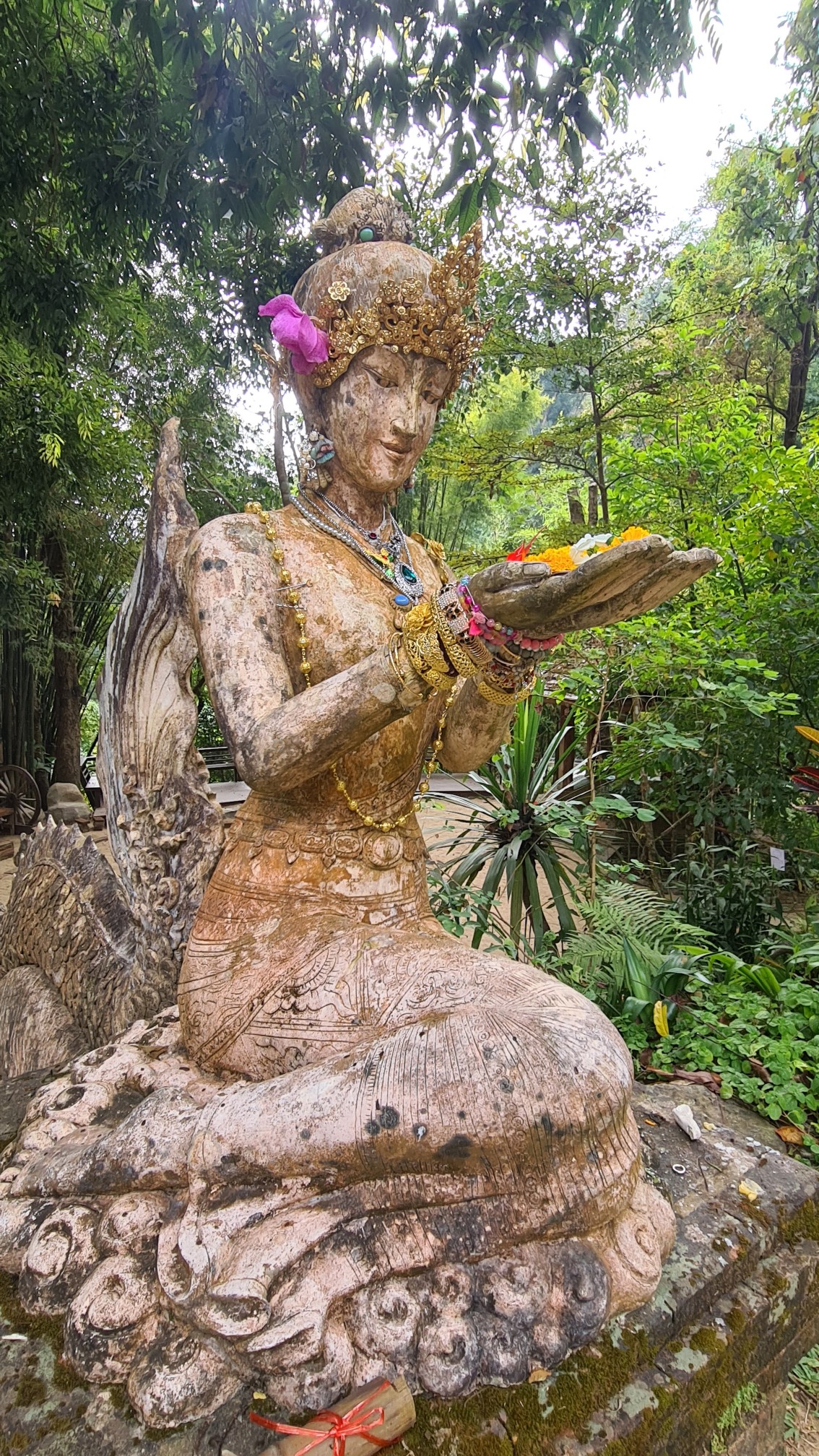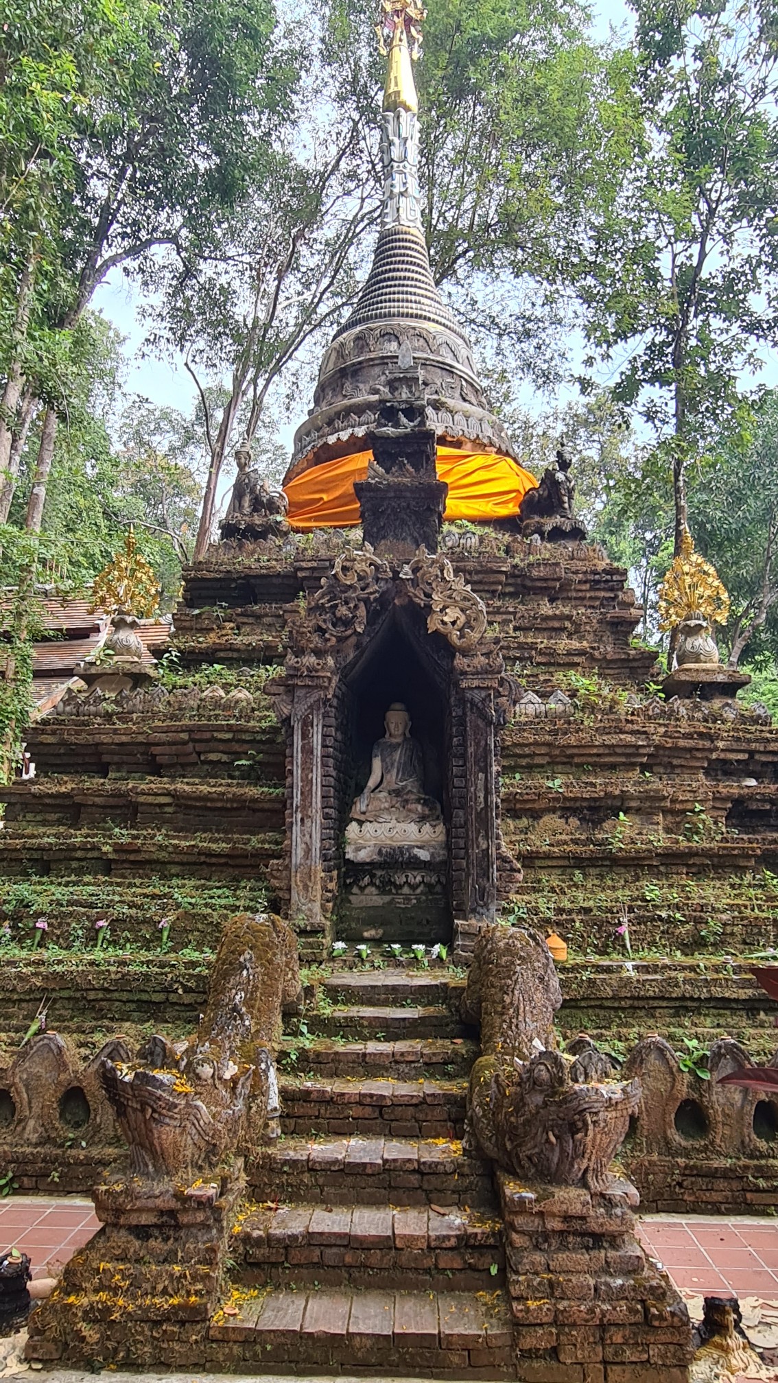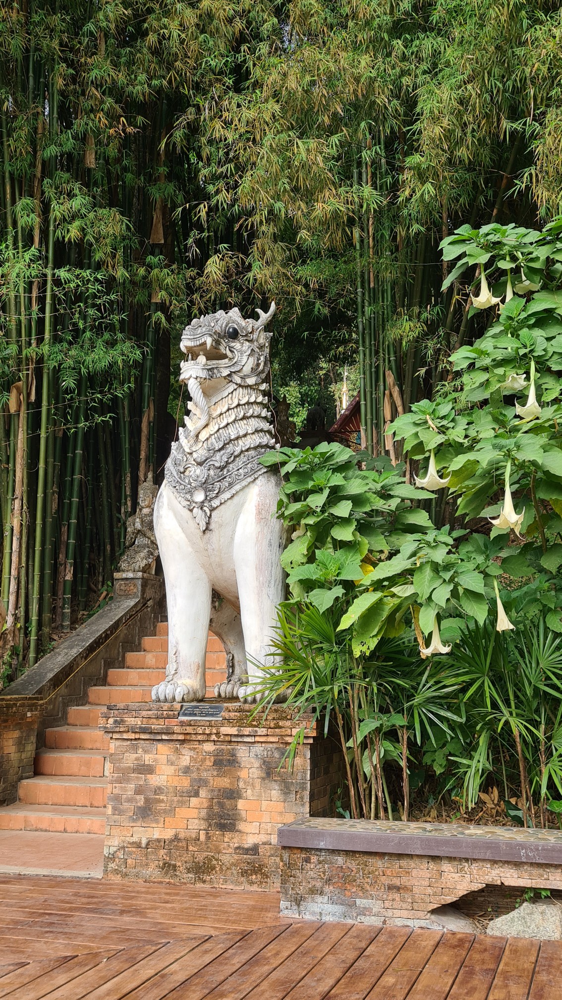 In Muse wandele ich also über die kleinen Brücken, über den Wasserfall mit einem Wahnsinnsblick auf Chiang Mai und durch die kleinen gepflasterten Wege, entdecke hier eine überwucherte Gebetshalle, dort einen verwilderten Chedi und viele kleine liebevolle Statuen, aber auch große, respekteinflößende Gestalten. Da kommt sogar ein bisschen Indiana-Jones-Feeling auf.