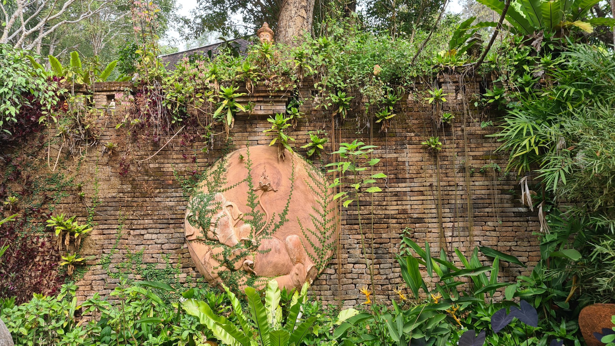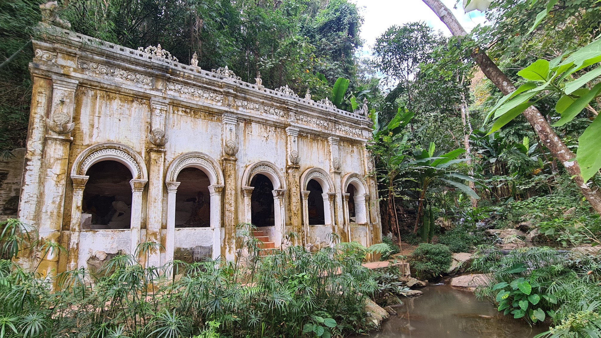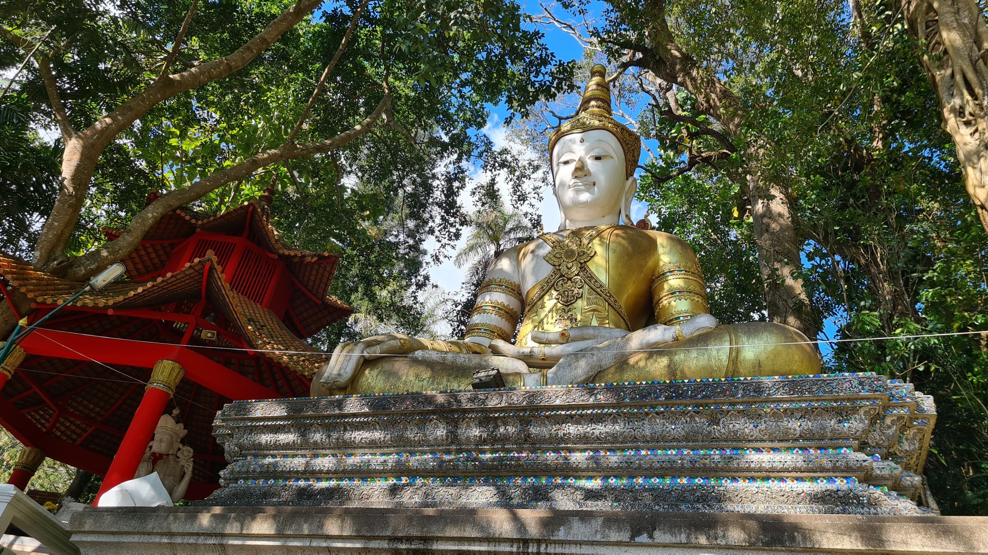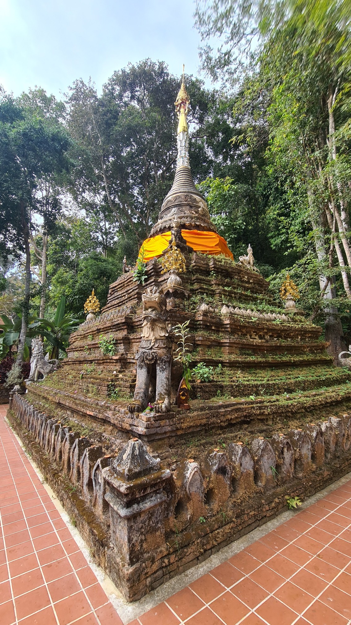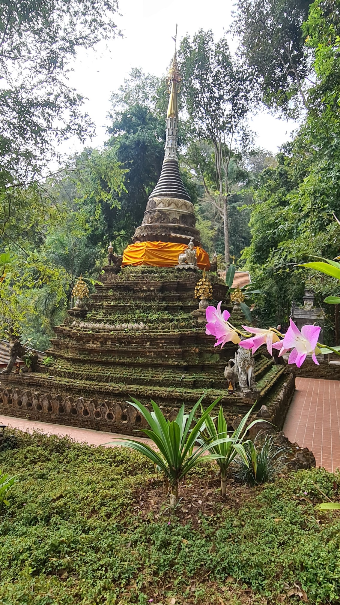 In Muse wandele ich also über die kleinen Brücken, über den Wasserfall mit einem Wahnsinnsblick auf Chiang Mai und durch die kleinen gepflasterten Wege, entdecke hier eine überwucherte Gebetshalle, dort einen verwilderten Chedi und viele kleine liebevolle Statuen, aber auch große, respekteinflößende Gestalten. Da kommt sogar ein bisschen Indiana-Jones-Feeling auf.