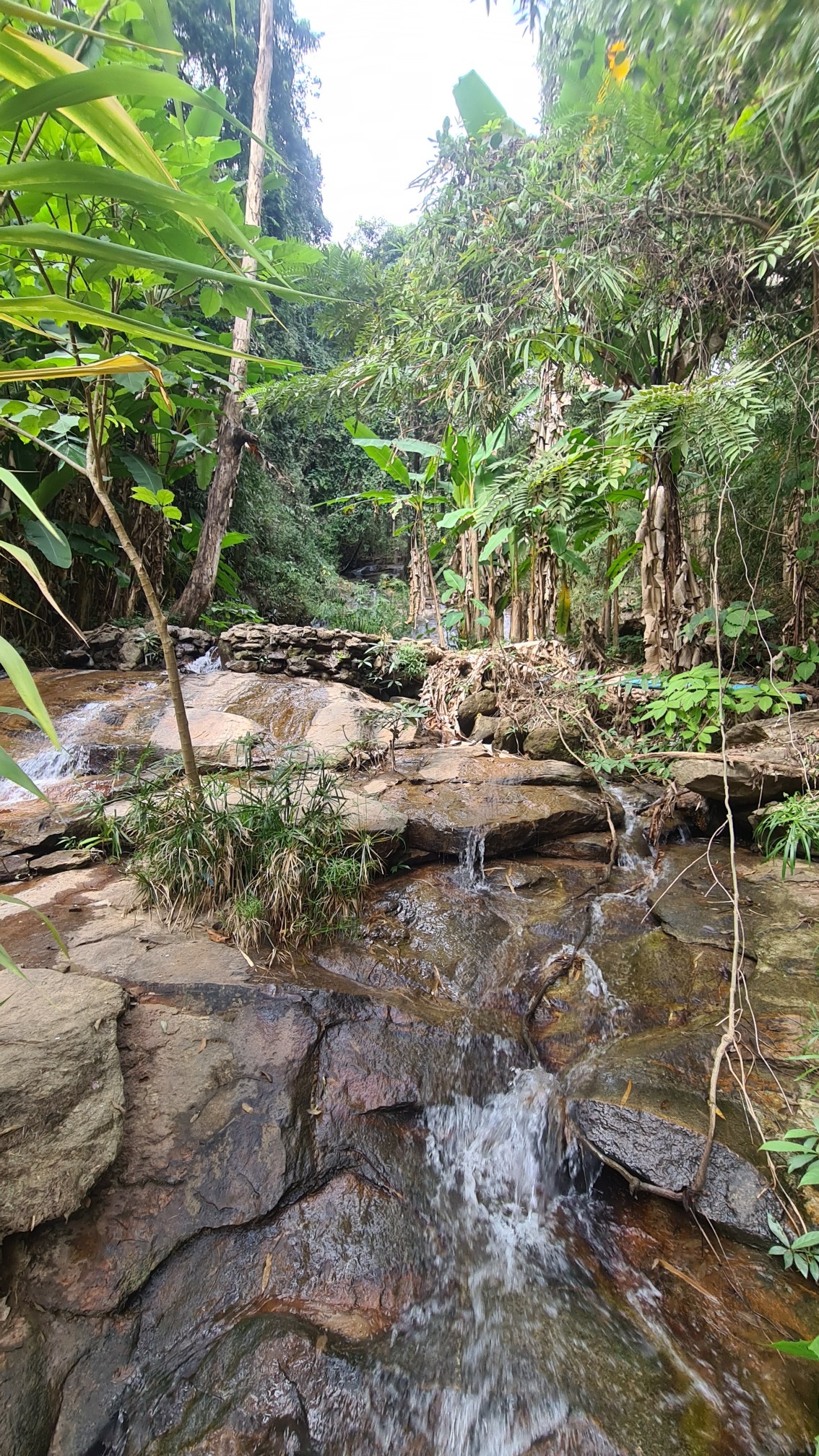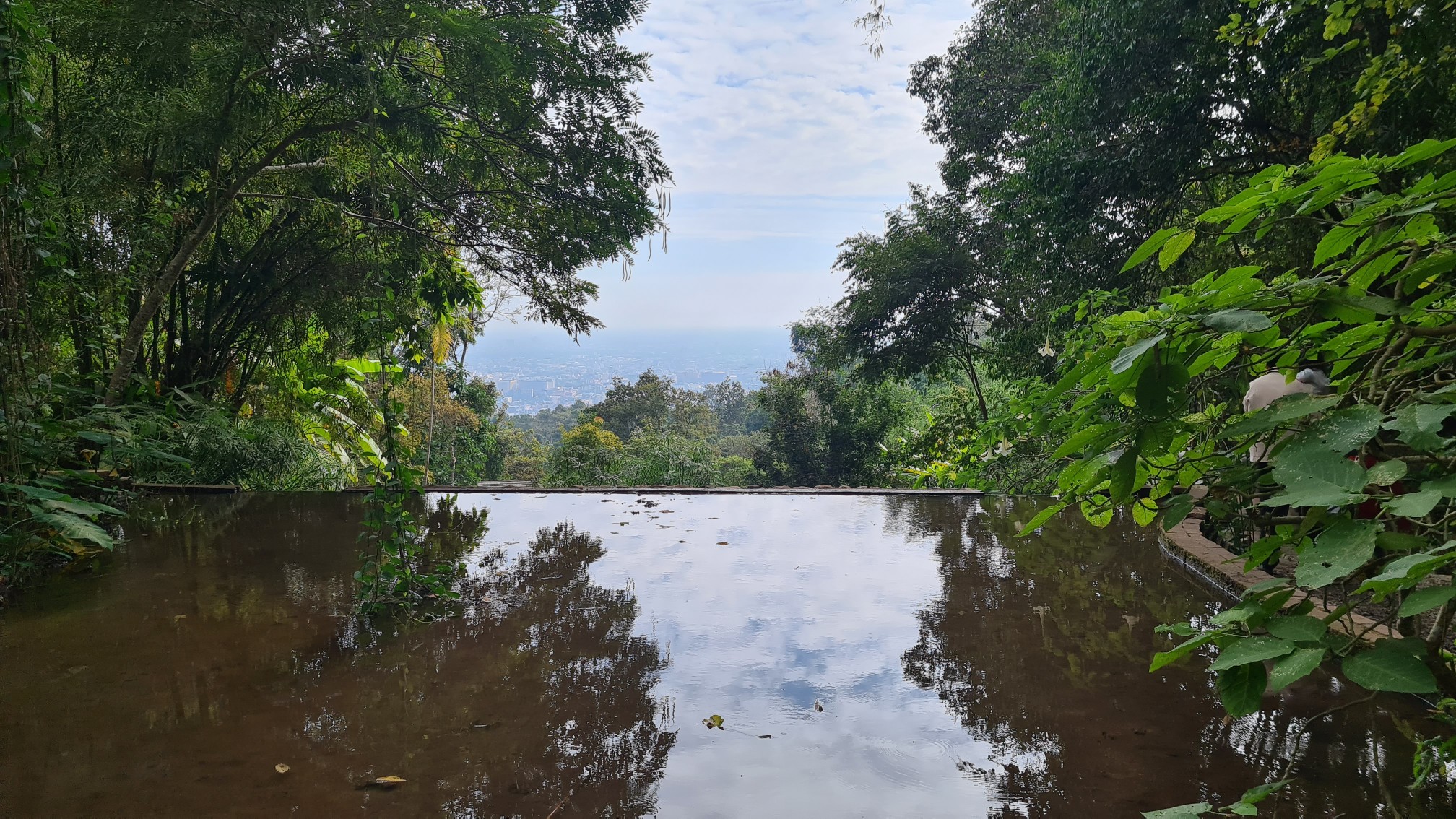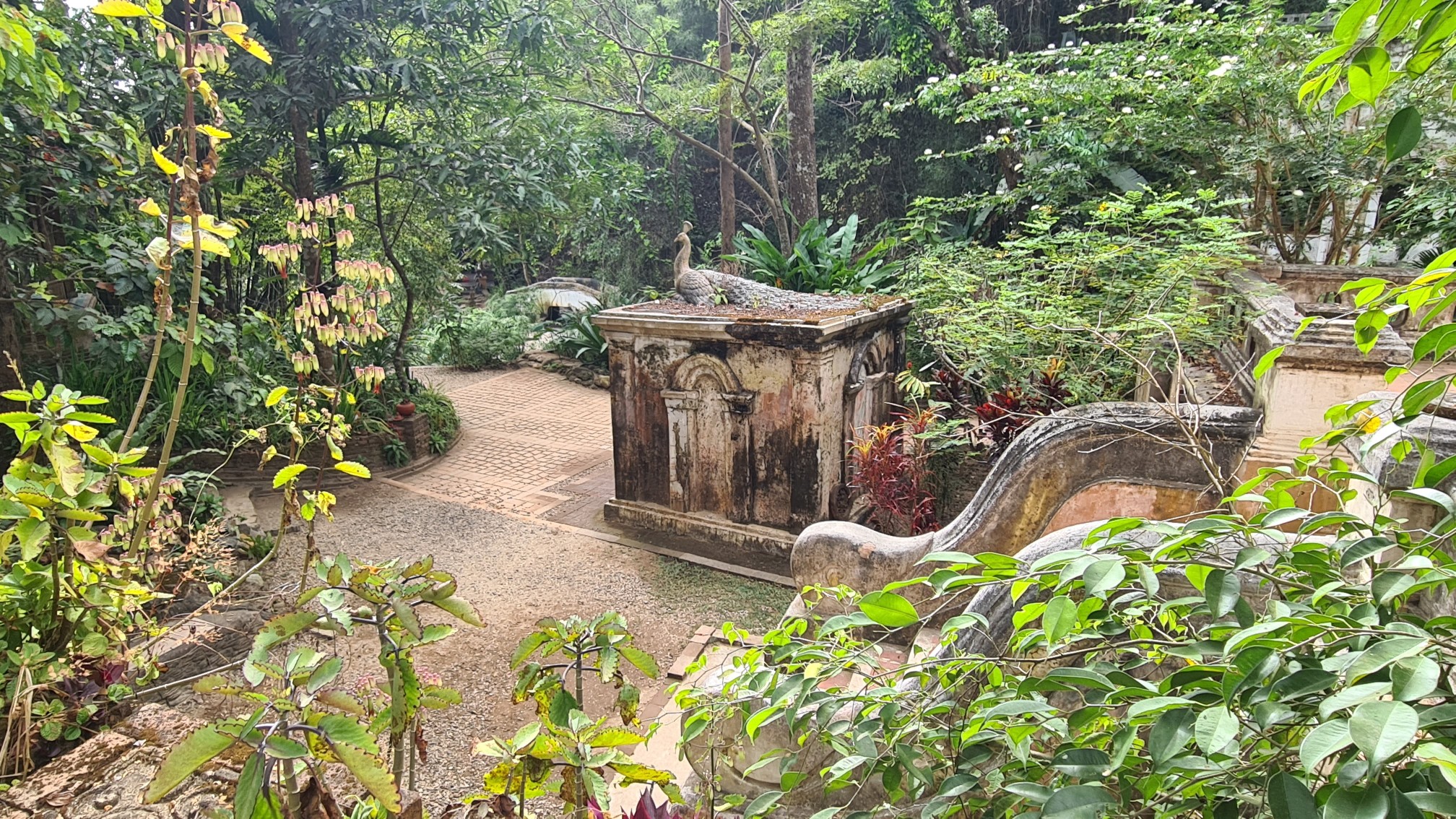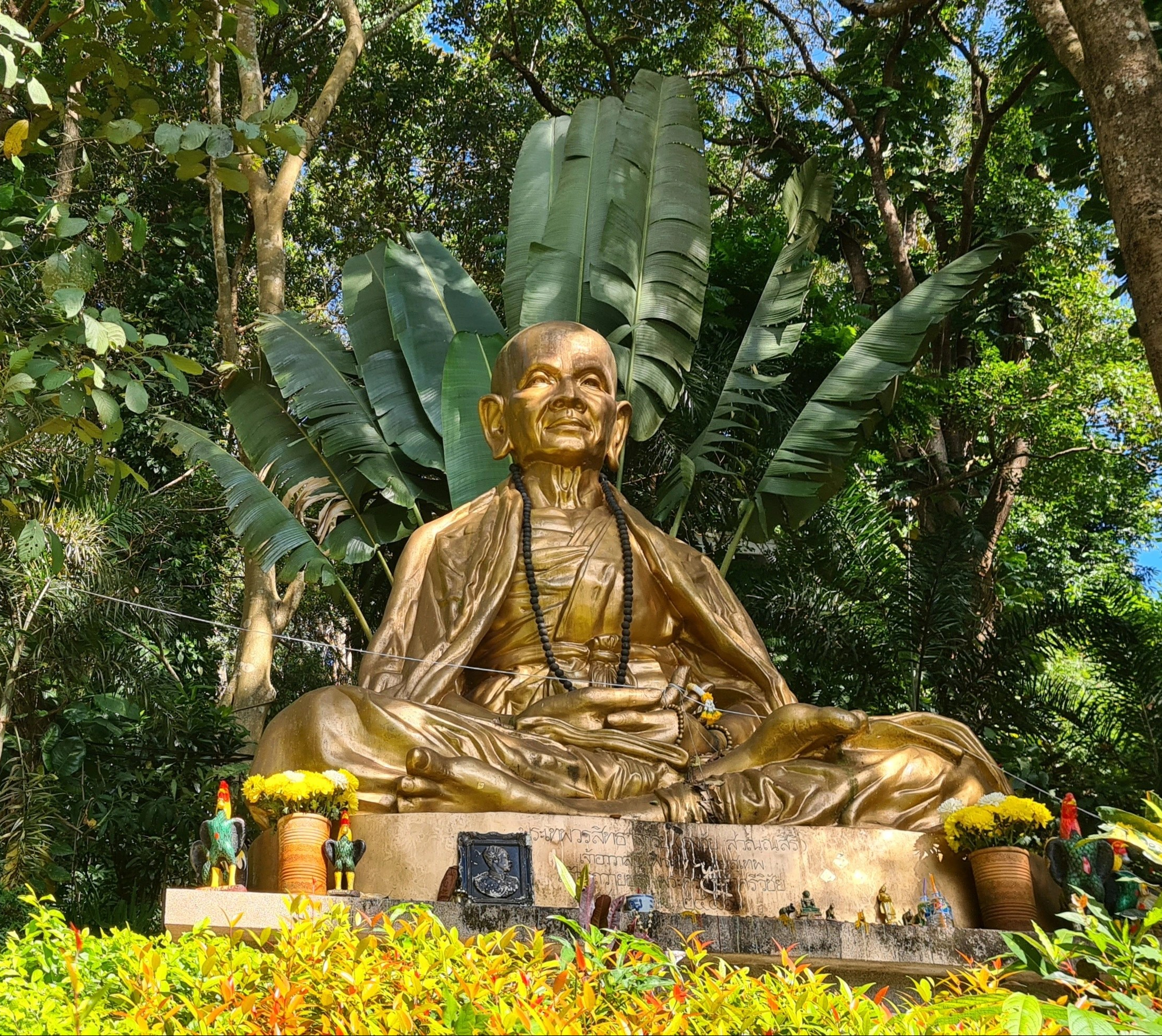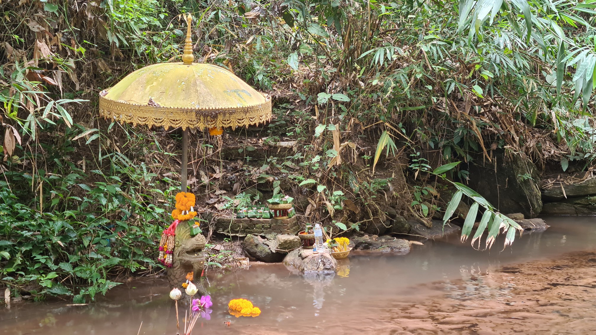 In Muse wandele ich also über die kleinen Brücken, über den Wasserfall mit einem Wahnsinnsblick auf Chiang Mai und durch die kleinen gepflasterten Wege, entdecke hier eine überwucherte Gebetshalle, dort einen verwilderten Chedi und viele kleine liebevolle Statuen, aber auch große, respekteinflößende Gestalten. Da kommt sogar ein bisschen Indiana-Jones-Feeling auf.
