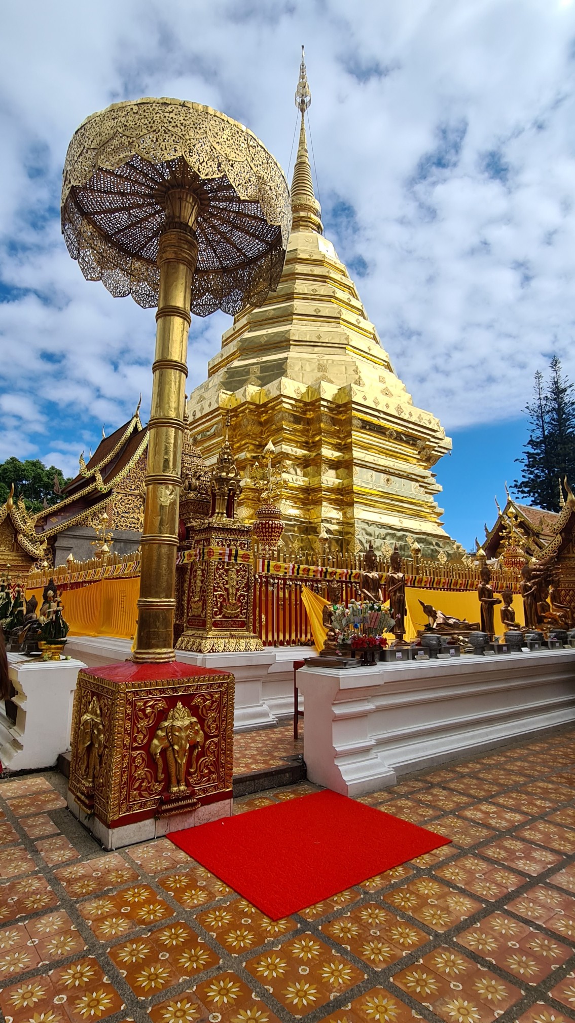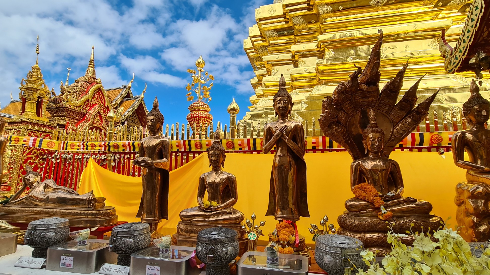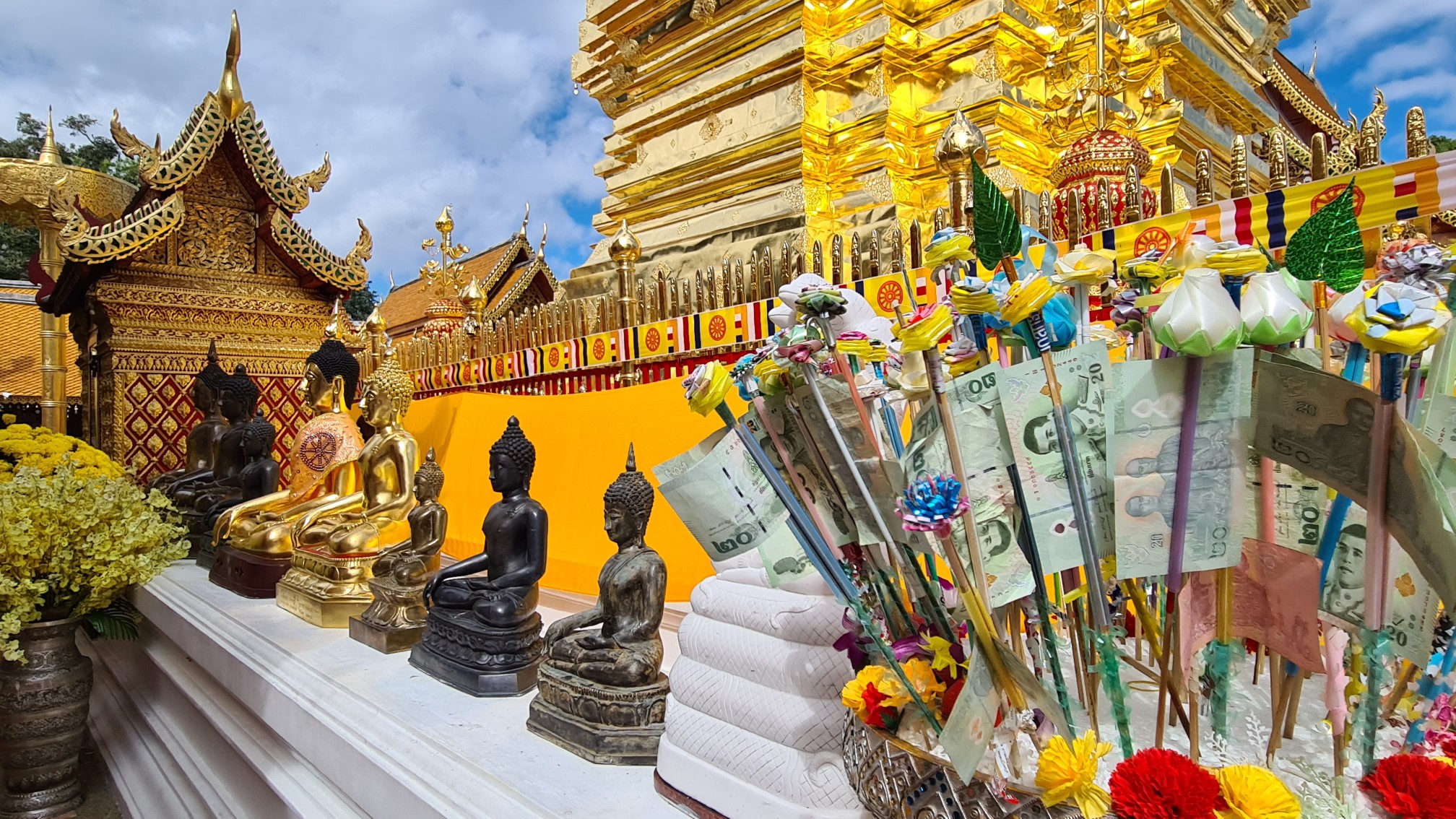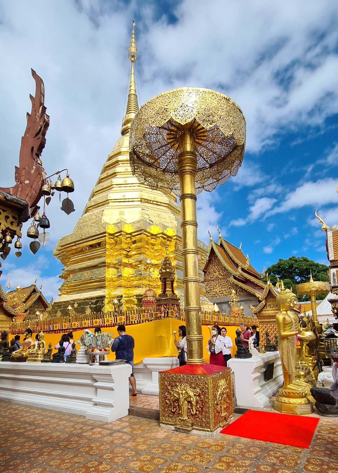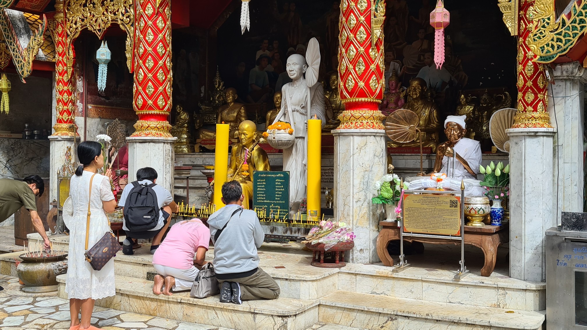 Heutzutage ist es hier nicht mehr ganz so einsam, also reihe ich mich ein in die Schar der mit den roten Songthaew rangekarrten Gläubigen und Touristen, erklimme die Anhöhe und ergehe mich in der belebten, goldigen Anlage. Welch ein Kontrast zu dem – im Nachhinein betrachtet – doch sehr stillen Waldtempel! Das Beobachten der Menschen und Rituale ist mindestens so spannend und unterhaltsam, wie das Bestaunen der detailreich geschmückten Buddhas, Altäre, Gabentische und des großen, goldenen Chedi, um den die Buddhisten – und manch verirrter Tourist – Gebete und Fürbitten murmelnd ihre Runden ziehen.