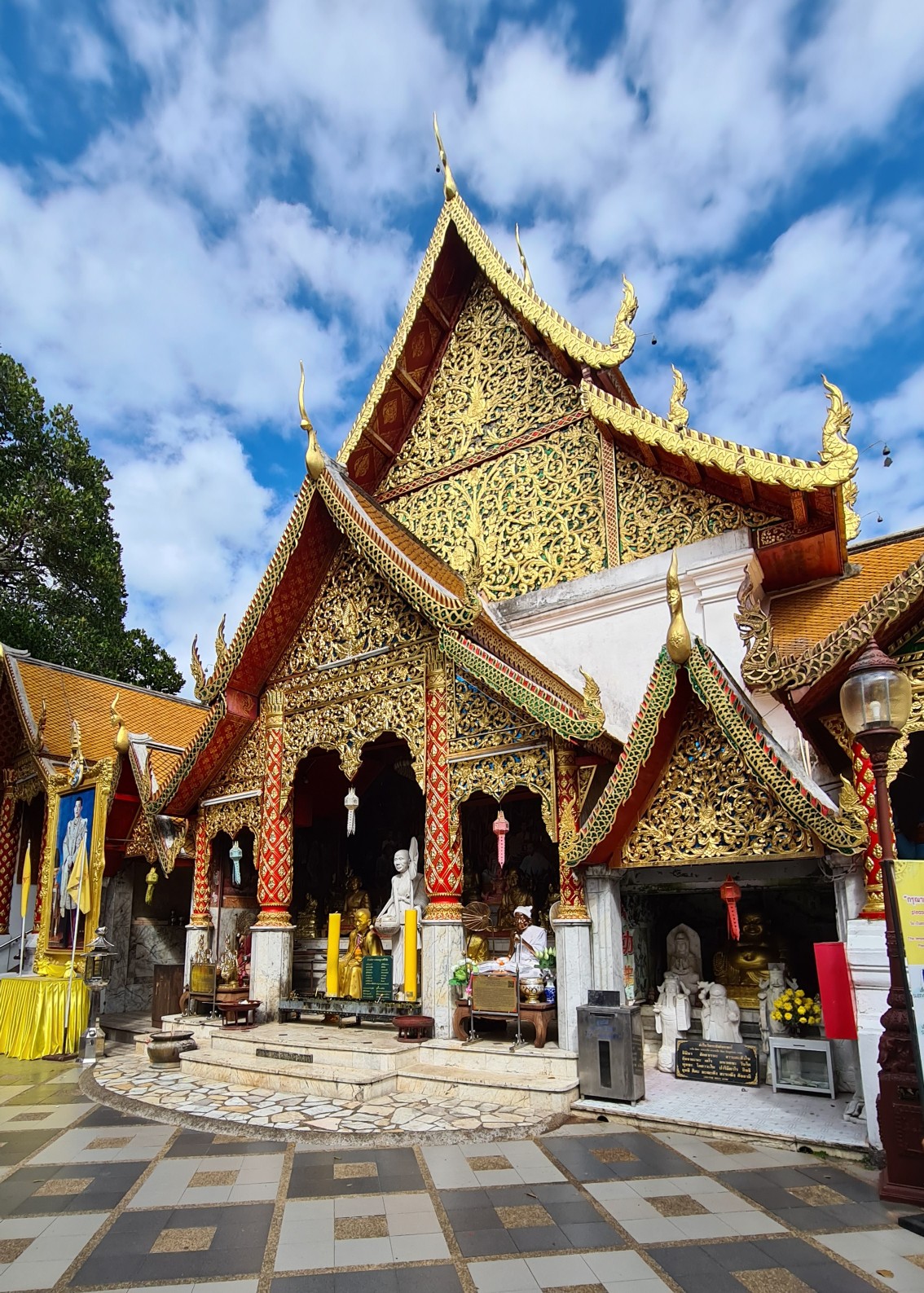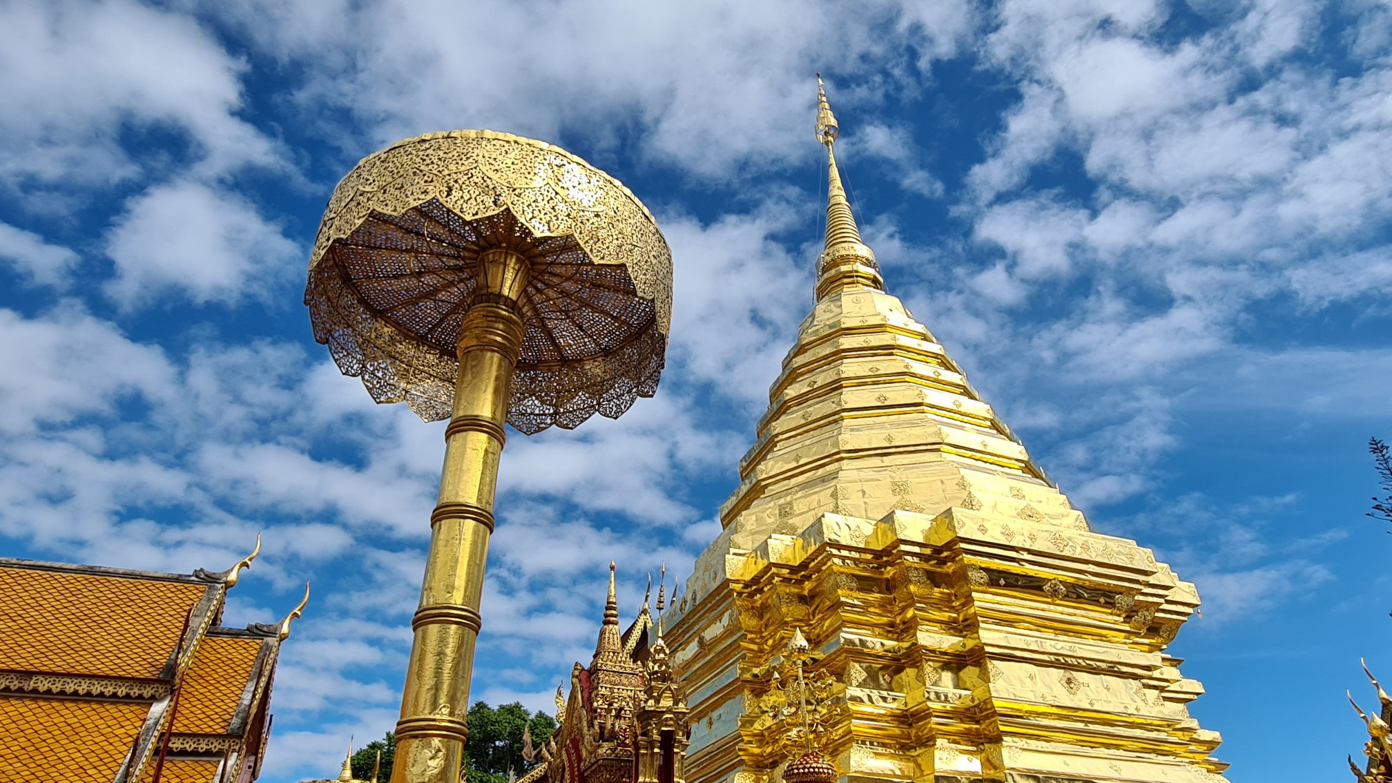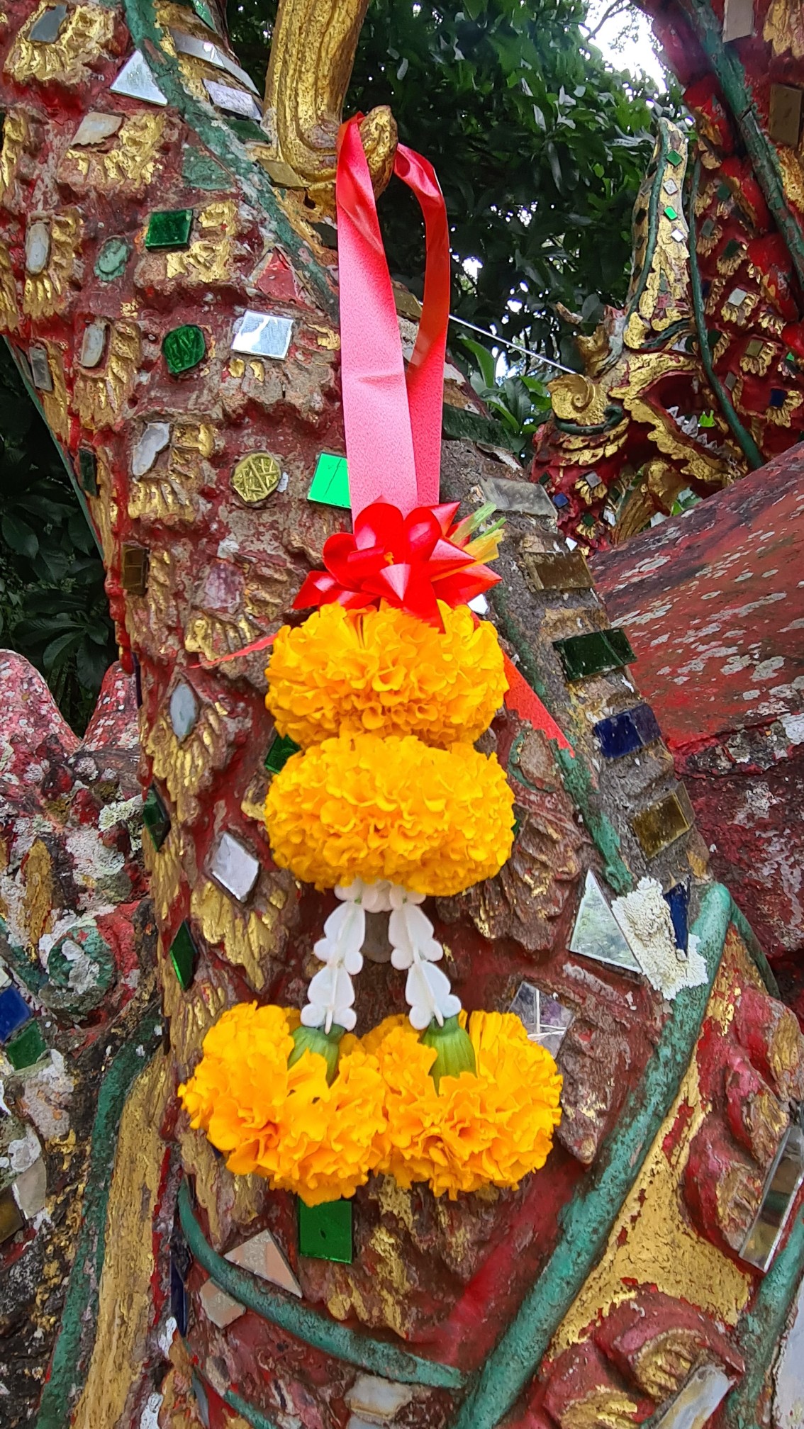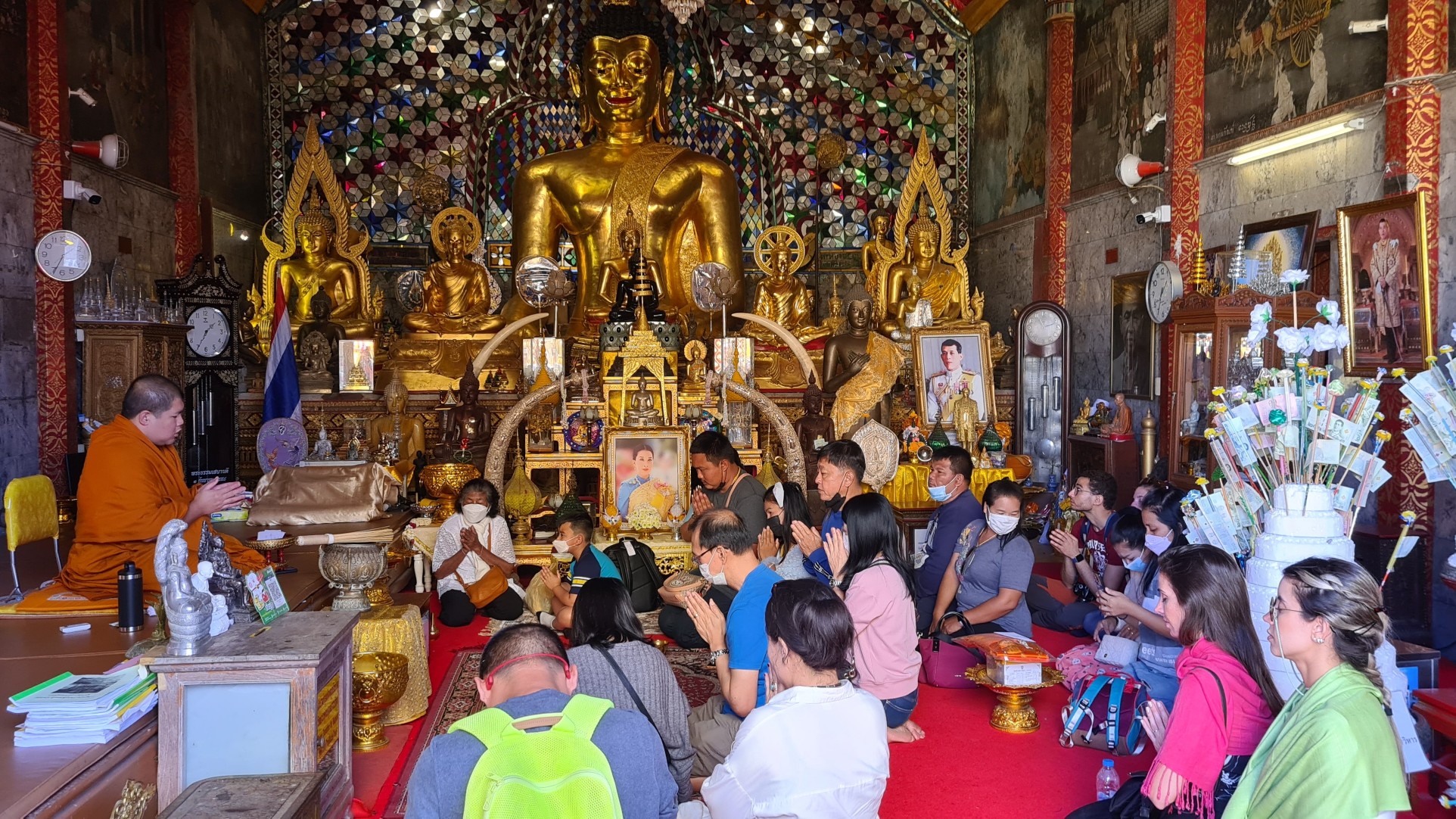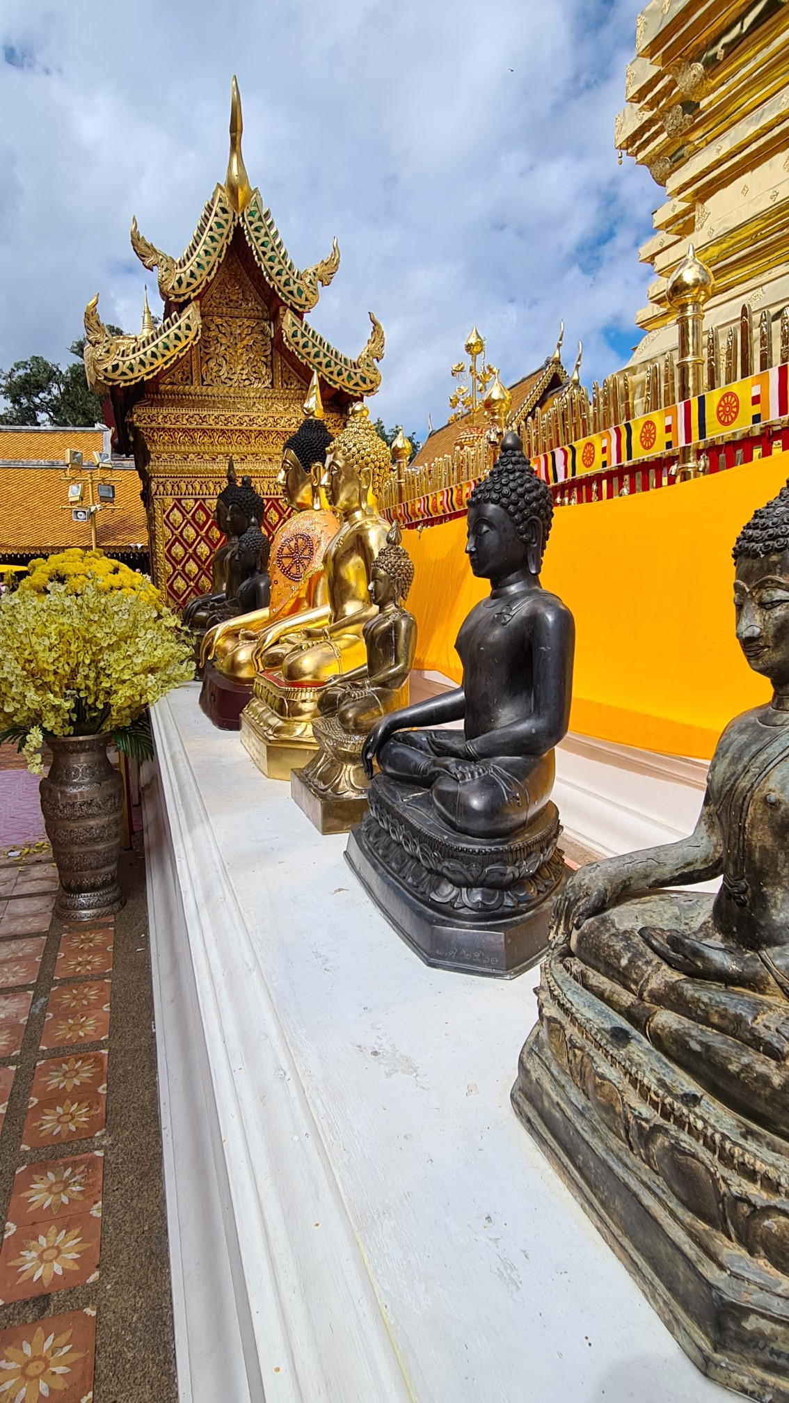 Heutzutage ist es hier nicht mehr ganz so einsam, also reihe ich mich ein in die Schar der mit den roten Songthaew rangekarrten Gläubigen und Touristen, erklimme die Anhöhe und ergehe mich in der belebten, goldigen Anlage. Welch ein Kontrast zu dem – im Nachhinein betrachtet – doch sehr stillen Waldtempel! Das Beobachten der Menschen und Rituale ist mindestens so spannend und unterhaltsam, wie das Bestaunen der detailreich geschmückten Buddhas, Altäre, Gabentische und des großen, goldenen Chedi, um den die Buddhisten – und manch verirrter Tourist – Gebete und Fürbitten murmelnd ihre Runden ziehen.