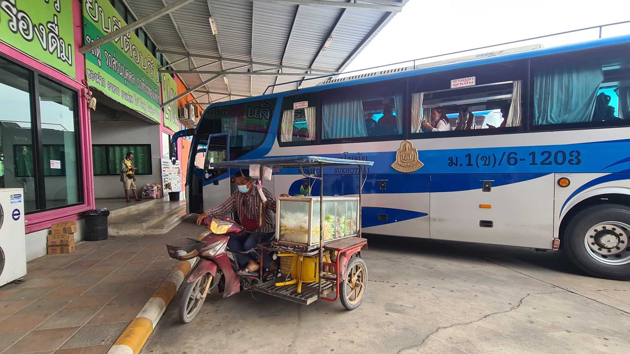 Zum ersten Mal ein schicker Bus mit durchsichtigen (also nicht blinden) und sauberen Fenstern. Auch das Wetter ist fürs Reisen wieder perfekt: Gestern war der Himmel strahlend blau, heute ist es bedeckt. Bei unserem Stopp in Neu-Sukhothai stellt die freundliche Stewardess fest, dass ich mich versehentlich auf den Fensterplatz D4 anstatt eine Reihe davor auf D3 gesetzt habe. Aber kein Problem, sie weist der Mitreisenden einfach den vorderen Sitz zu, die sich die Zweierbank mit einer genauso dürren Sitznachbarin teilt. In Kamphaeng Phet fahren wir direkt durch den Historical Park, Sightseing quasi im Vorbeifahren abgehakt! Dann wird die Kiste am dortigen Busterminal richtig voll und der Typ neben mir ist zu meinem Leidwesen ziemlich „platzeinfordernd“, insbesondere wenn er während der Weiterfahrt immer wieder geräuschvoll einnickt und zu mir rüberkippt. Dem rundlichen Herrn ist das zwar peinlich und er versucht auch mit mir zu flirten und gute Stimmung zu verbreiten, spricht aber kein Wort Englisch. Das wird mir dann doch zu anstrengend und ich schenke ihm deshalb auch während der Mittagspause im bahnhofshallenartigen Kantinenrestaurant keine Beachtung.