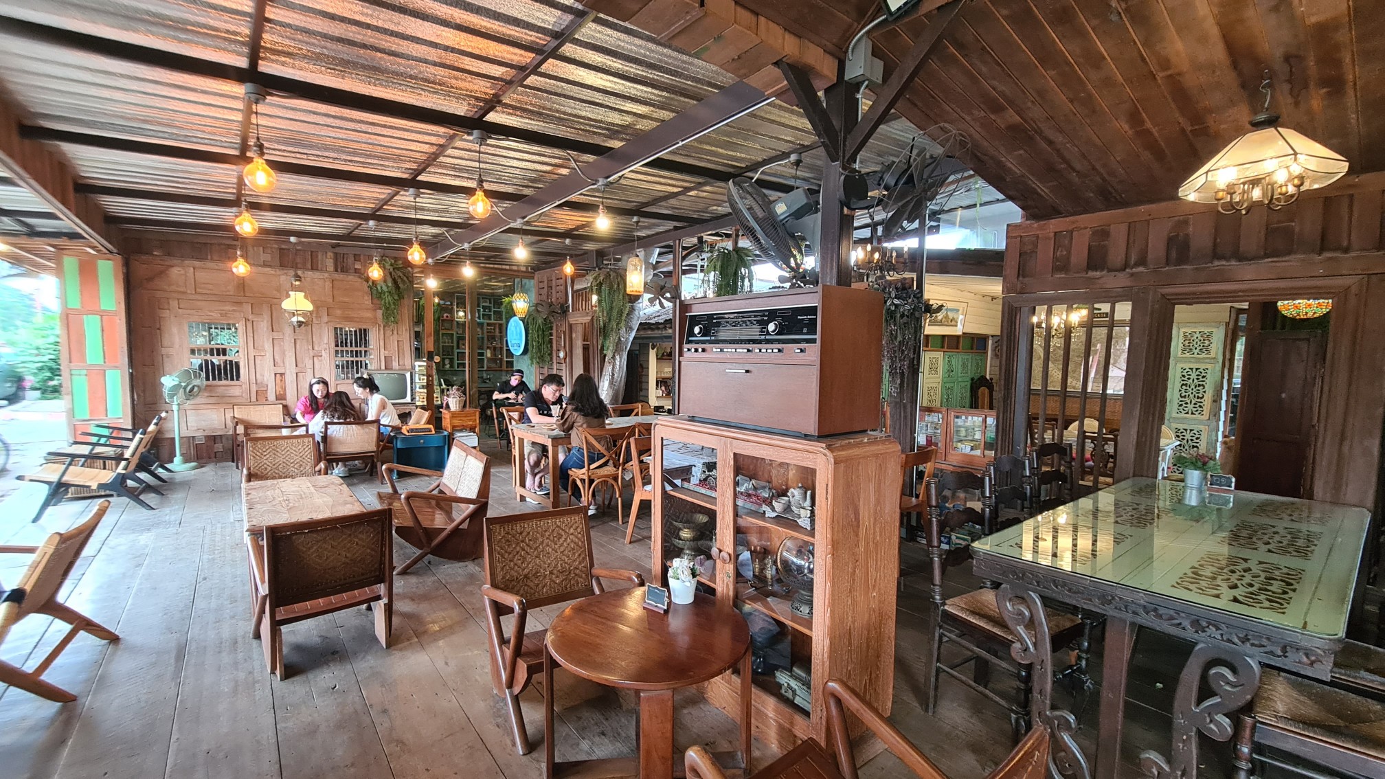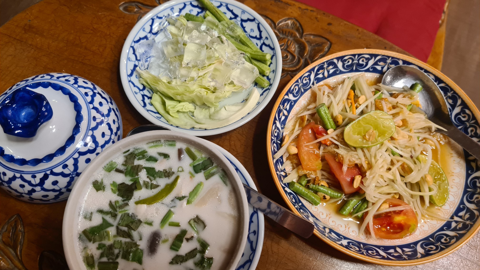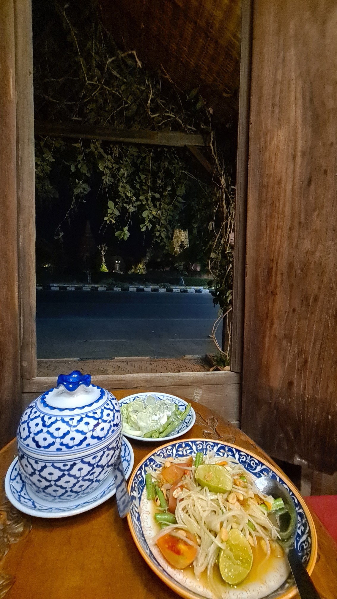 Sieben Stunden war ich heute mit dem Rad unterwegs – Ufff! Nach der Dusche, dem Packen für die morgige Weiterreise und einem ausführlichen Austausch mit der jungen deutschen Reisenden über mir gehe ich heute zielsicher auf die große Terrasse der Federbräu-Bar zum Abendessen. Entweder ist der Laden neu, die Kellner neu oder die Jungs sind ob einer Touristin in ihrer Lokalität sichtlich nervös und versuchen, mir jeden Wunsch von den Augen abzulesen … was mangels Englischkenntnissen auch die einzig mögliche Art der Kommunikation ist. Eine englische Speisekarte gibt es nicht und die thailändische ist nur zum Teil bebildert, weshalb ich erstmalig den Google Bild-Text-Übersetzer bemühe – mit durchschlagendem LACH-Erfolg!