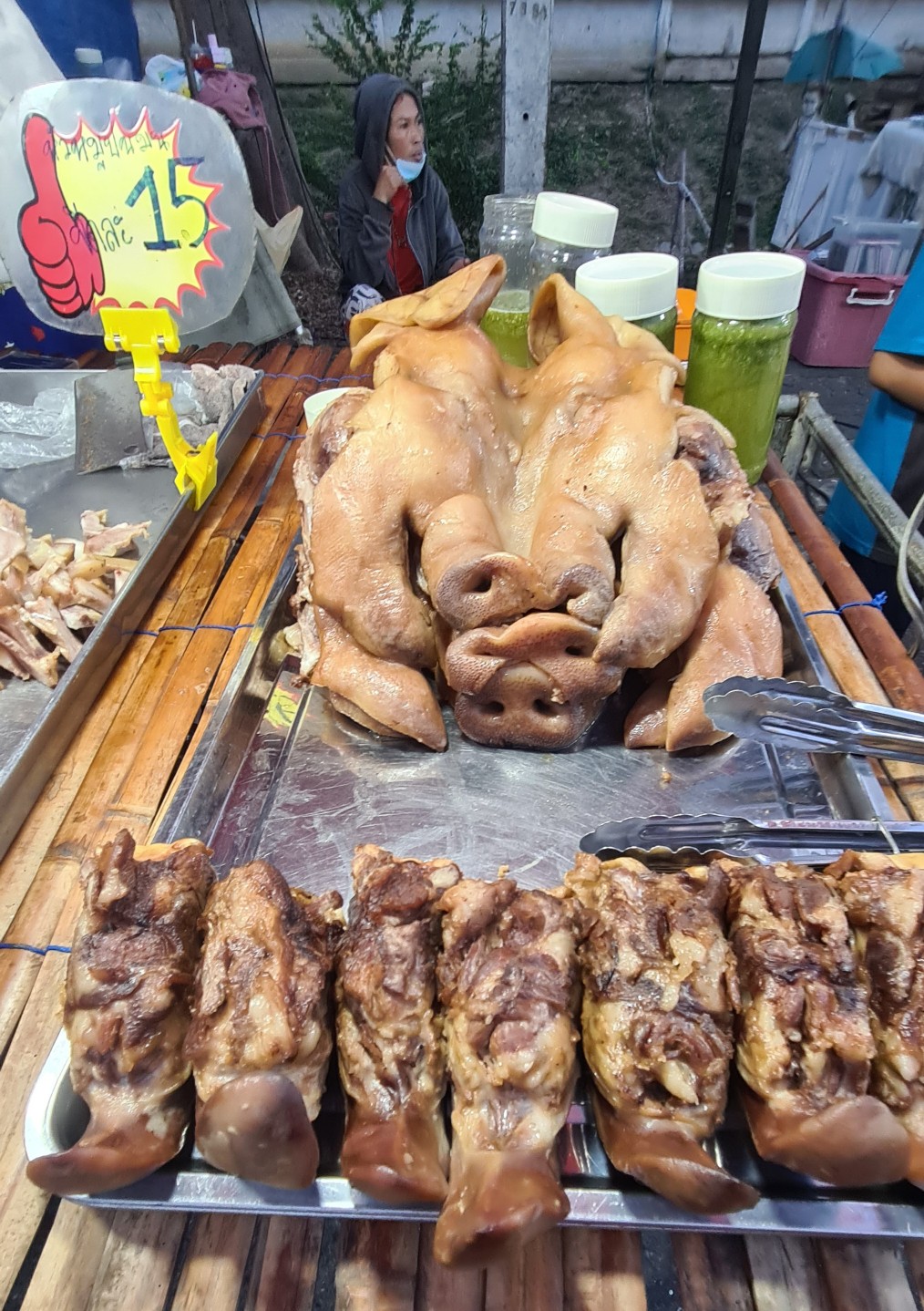Die wenigen Touristen sind auf Anhieb zu erkennen, denn es sind die Einzigen, die auf dem Markt keine Masken tragen – und zudem vereinzelt recht spärlich bis abstoßend bekleidet sind. Entsprechend dem lokalen Klientel sind die Essensangebote für europäische Geschmäcker und Augen gewöhnungsbedürftig. An den Fisch traue ich mich nicht ran, auch Sushi ist mir zu gewagt, zumal die Häppchen hier recht unorthodox mit allerlei garniert und gepimpt werden. Das Fleisch, auf dem im Markt die Fliegen spazieren gehen, weidet mich weder in gegarter noch in frittierter Form an. Hat man aus den Tütensuppen alle nicht essbaren Zutaten wie Zitronengras, Zitronenblätter, Ingwerscheiben herausgefieselt, bleibt mehr oder weniger gewürztes Wasser übrig. Nicht zuletzt angesichts des anfallenden Take-away-Plastiks entscheide ich mich dann doch für einen Restaurantbesuch: