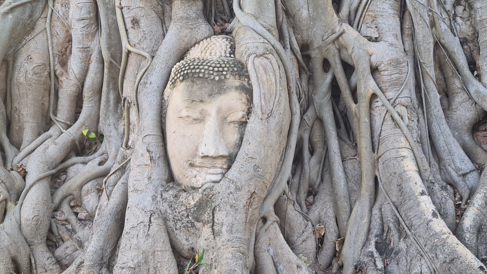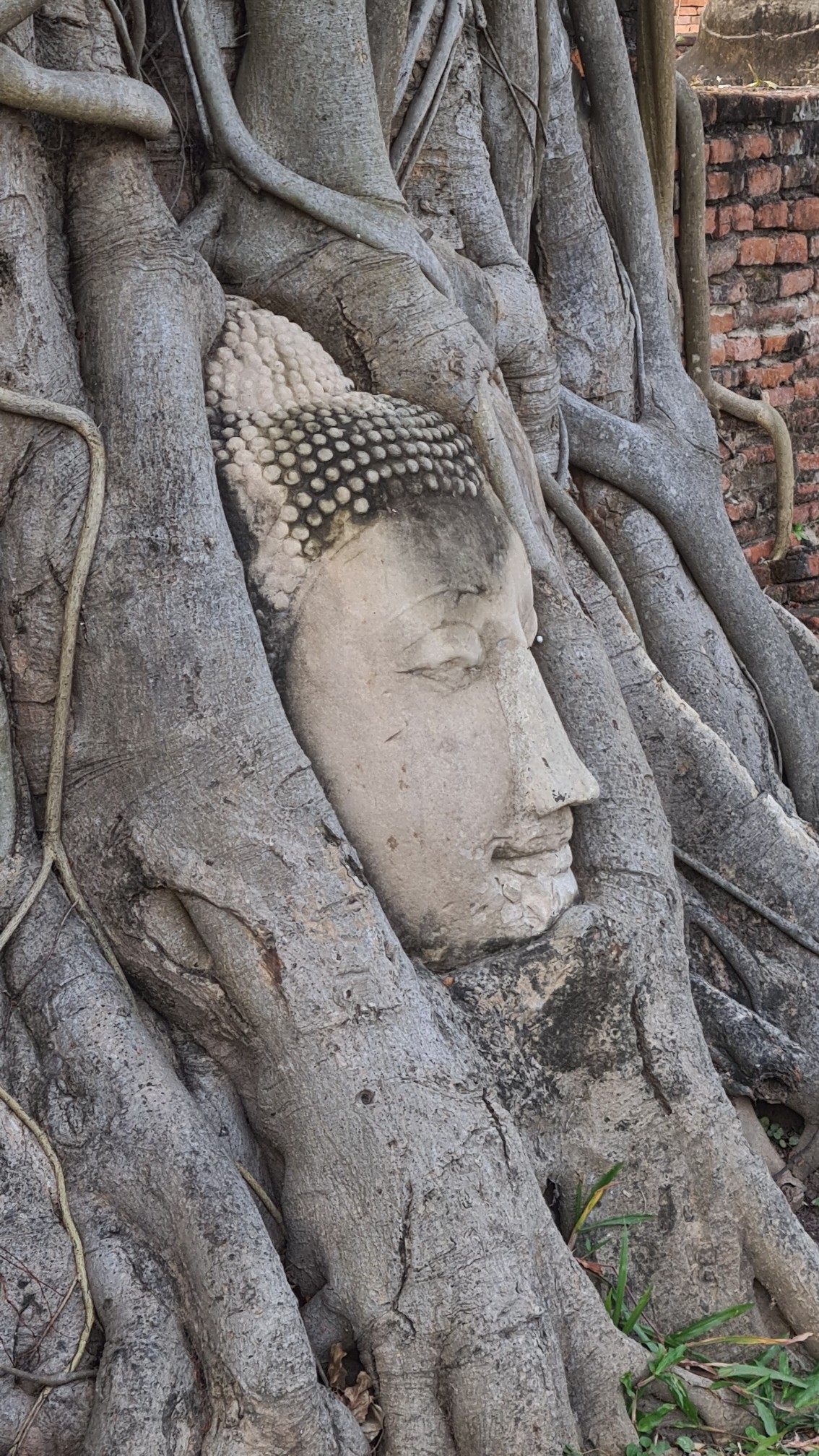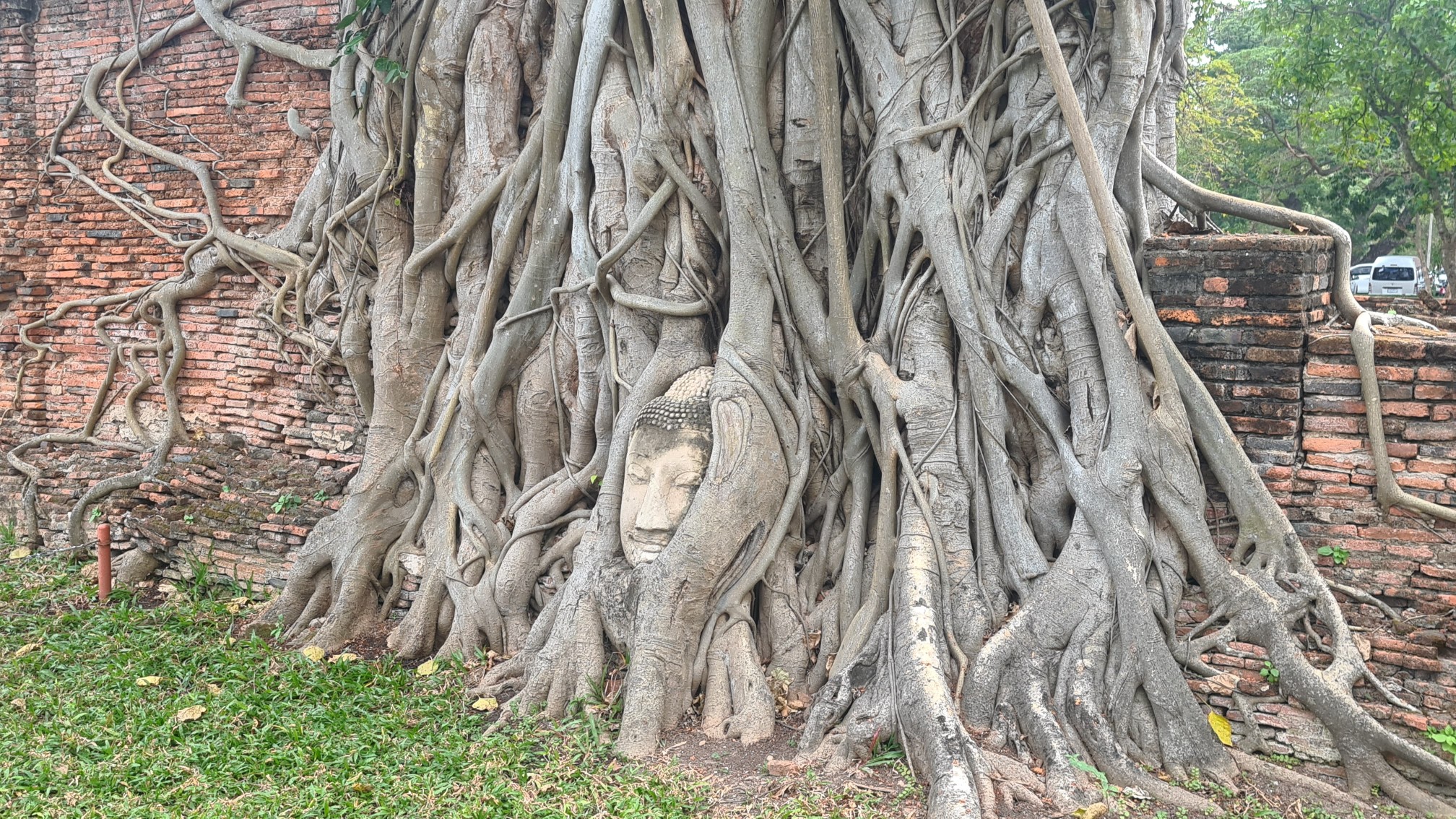 Bis zur Hauptattraktion des heutigen Ayutthaya, dem weltweit bekannten, in Baumwurzeln eingewachsenen Buddha-Kopf ist es nicht weit. Wie so oft ist man ein bisschen enttäuscht, wenn man an etwas besonders hohe Erwartungen hat. Der Kopf liegt nicht so mystisch versteckt irgendwo im Nirgendwo und ist auch kleiner als nach den Fotos vermutet. Aber trotzdem hübsch. Zum Fotografieren muss man bestimmte Verhaltensregeln einhalten, zum Beispiel knien, um zumindest aus gleicher Höhe und auf keinen Fall „von oben herab“ auf hochgeschätzten Buddha zu schauen.