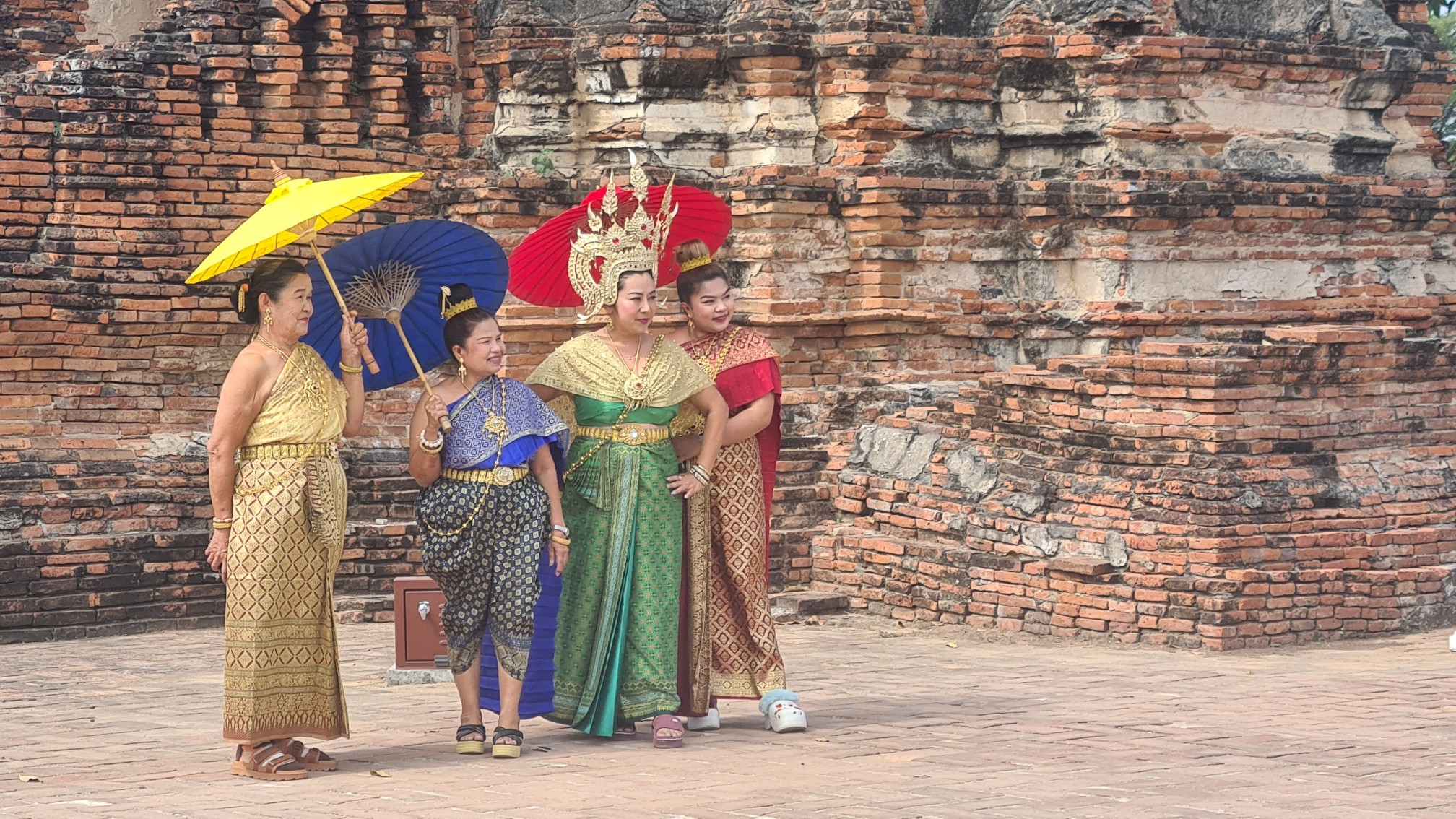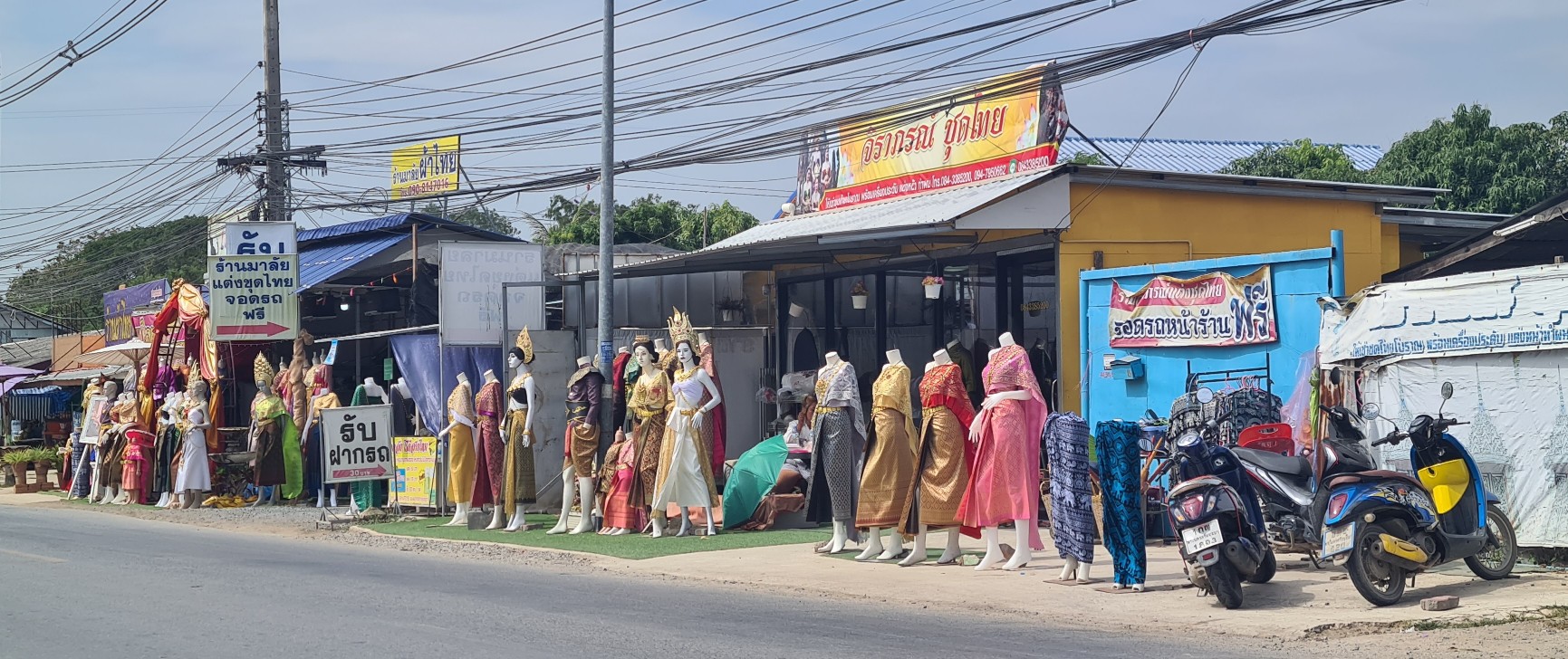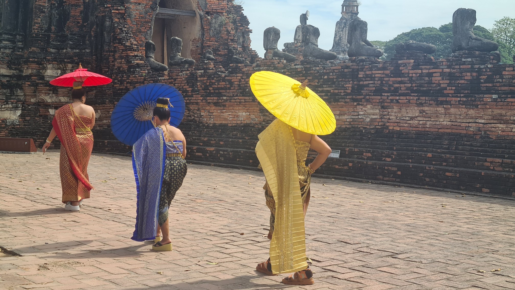 Idyllischer wird aber auch da das Radfahren nicht, ständig muss ich darauf achten, wie es weitergeht. Beim riesigen Wat Chaiwatthanaram fällt mir dann erneut die Kinnlade runter. Entlang der Straße reiht sich Kostumverleih an Kostümverleih. Das Angebot reicht von glitzernden Sarongs in Kleinkindgröße bis Herren-Pluderhosen, von goldenen Schals, Gürteln und Haarkronen bis hin zum obligatorischen Papierschirm. Was nicht im Ausleihumfang enthalten ist, sind die passenden Schuhe. Nachdem die Füße, insbesondere die Fußsohlen unrein sind im Buddhismus, werden vermutlich die Füße auf den Fotos „weggeschnitten“. Und ich bin wieder einmal fassungslos, für was der Mensch Geld ausgibt.