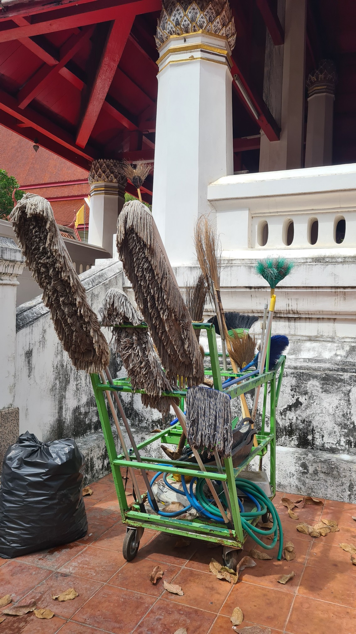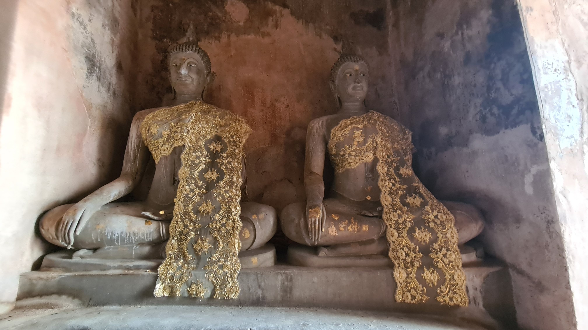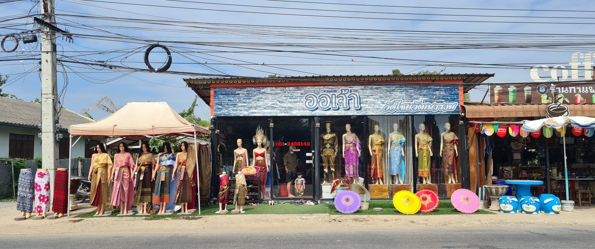 Idyllischer wird aber auch da das Radfahren nicht, ständig muss ich darauf achten, wie es weitergeht. Beim riesigen Wat Chaiwatthanaram fällt mir dann erneut die Kinnlade runter. Entlang der Straße reiht sich Kostumverleih an Kostümverleih. Das Angebot reicht von glitzernden Sarongs in Kleinkindgröße bis Herren-Pluderhosen, von goldenen Schals, Gürteln und Haarkronen bis hin zum obligatorischen Papierschirm. Was nicht im Ausleihumfang enthalten ist, sind die passenden Schuhe. Nachdem die Füße, insbesondere die Fußsohlen unrein sind im Buddhismus, werden vermutlich die Füße auf den Fotos „weggeschnitten“. Und ich bin wieder einmal fassungslos, für was der Mensch Geld ausgibt.