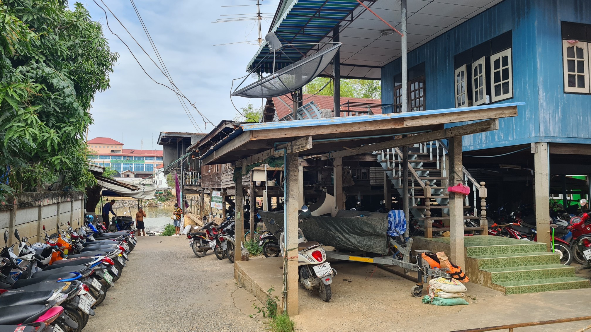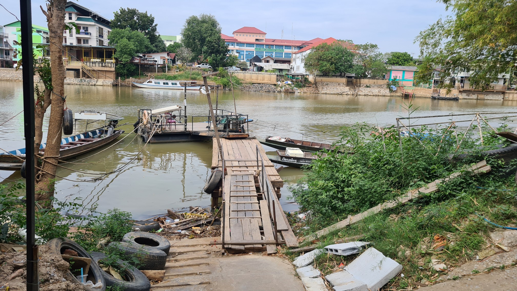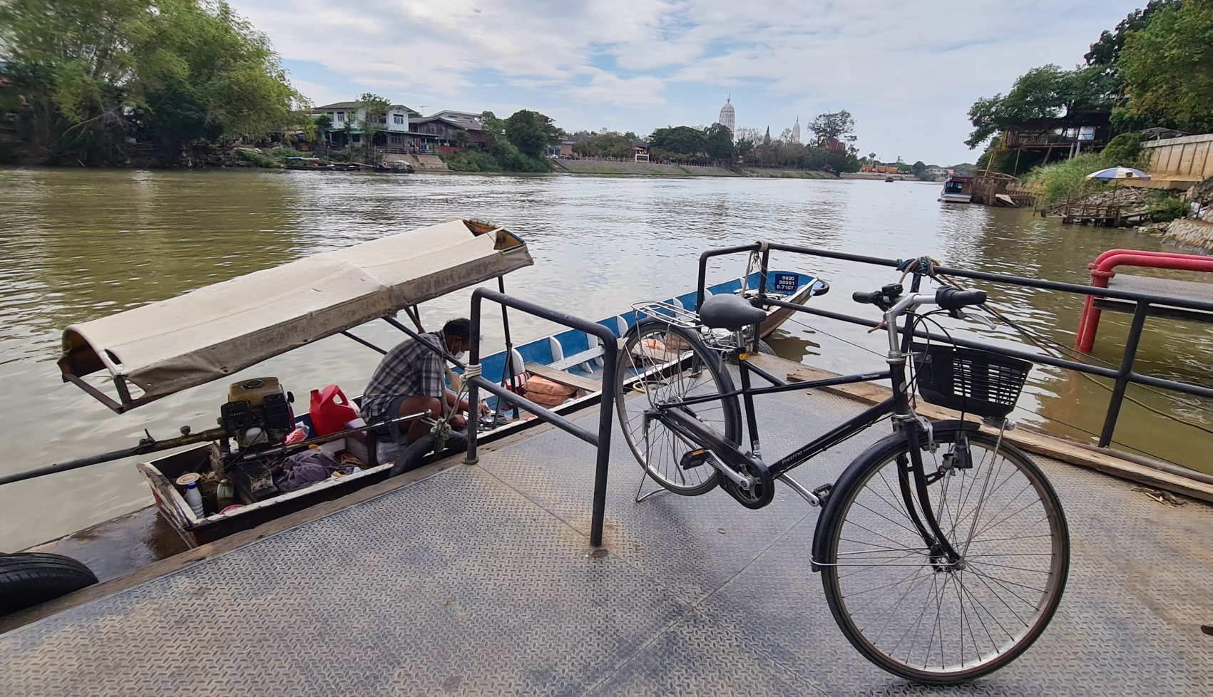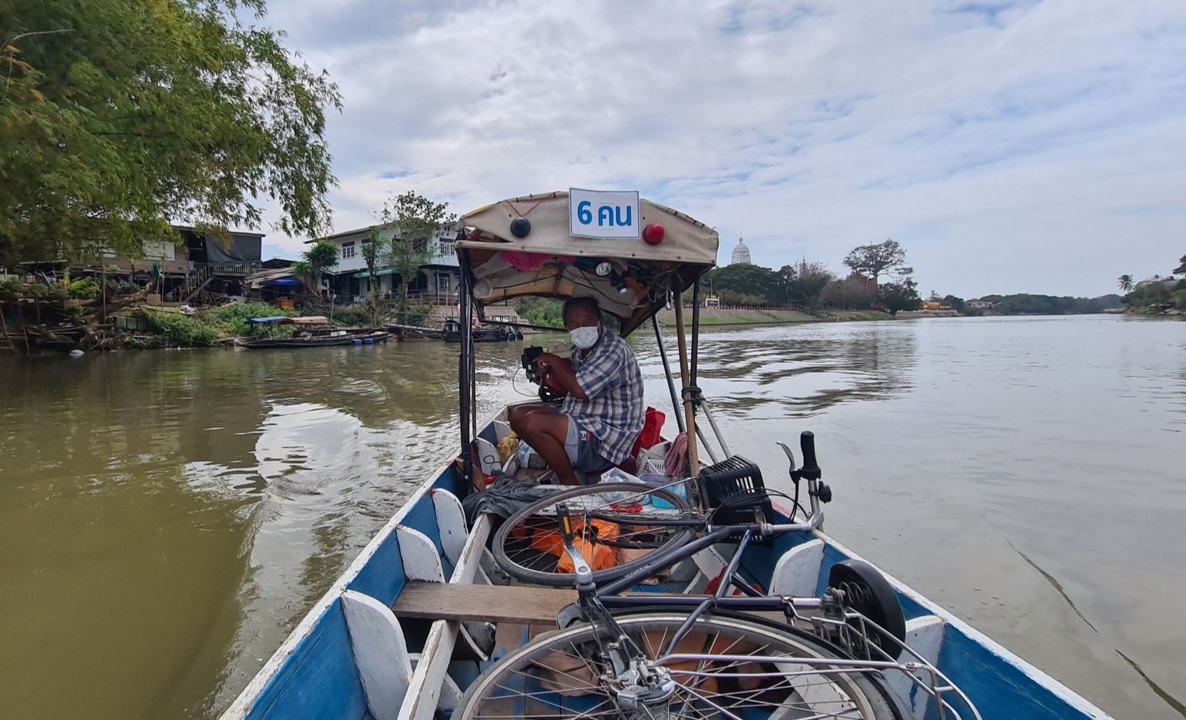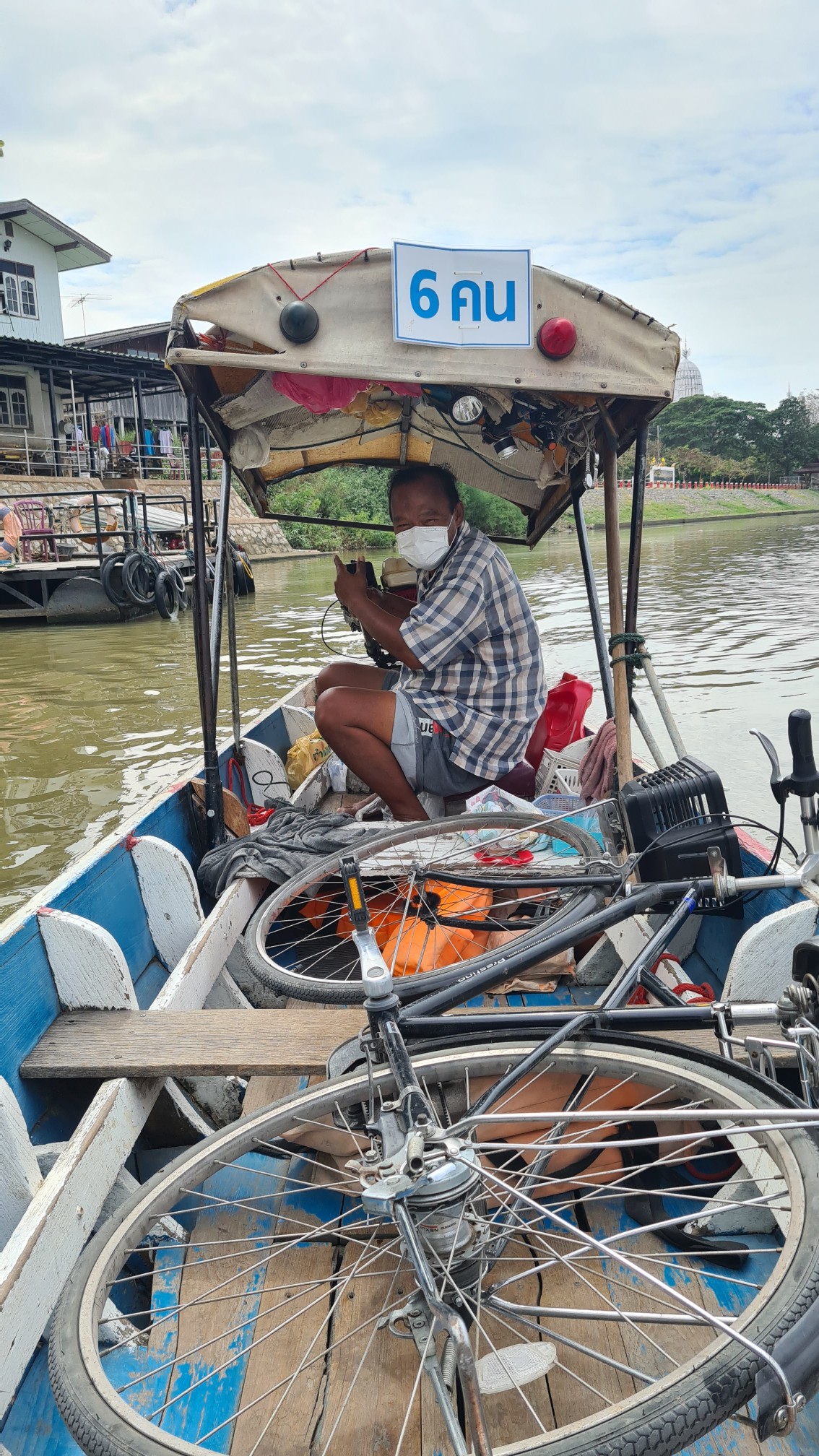 Ich schlage mich in die angegebene Richtung, folge noch zuversichtlich einem Wegweiser mit Boot und komme durch kleine, verarmte Gassen schließlich zum Flussufer. Aha, über diesen Bretterverschlag soll es also auf die Fähre gehen? Mein fragender Blick zu den herumlungernden Männern wird mit einem wohlmeinenden Nicken und der Geste, weiter zur Plattform zu gehen, beantwortet. Tatsächlich liegt hier ein kleiner, unscheinbarer Kahn samt maskiertem Fährmann. Ja, klar bringt er mich für 10 THB (noch nicht einmal 30 Cent!) rüber auf die andere Seite, aber das Fahrrad ein- und ausladen gehört nicht zum Leistungsumfang. Irgendwie schaffe ich es, meinen Drahtesel – ohne selbst über Bord zu gehen – zu laden und am Ziel wieder auszuladen. Meine Freude und Begeisterung über dieses Mini-Abenteuer erheitert auch den sympathischen Fährmann hinter seiner Corona-Maske. Es war fürwahr das lustigste und authentischste Erlebnis des ganzen Tages!!