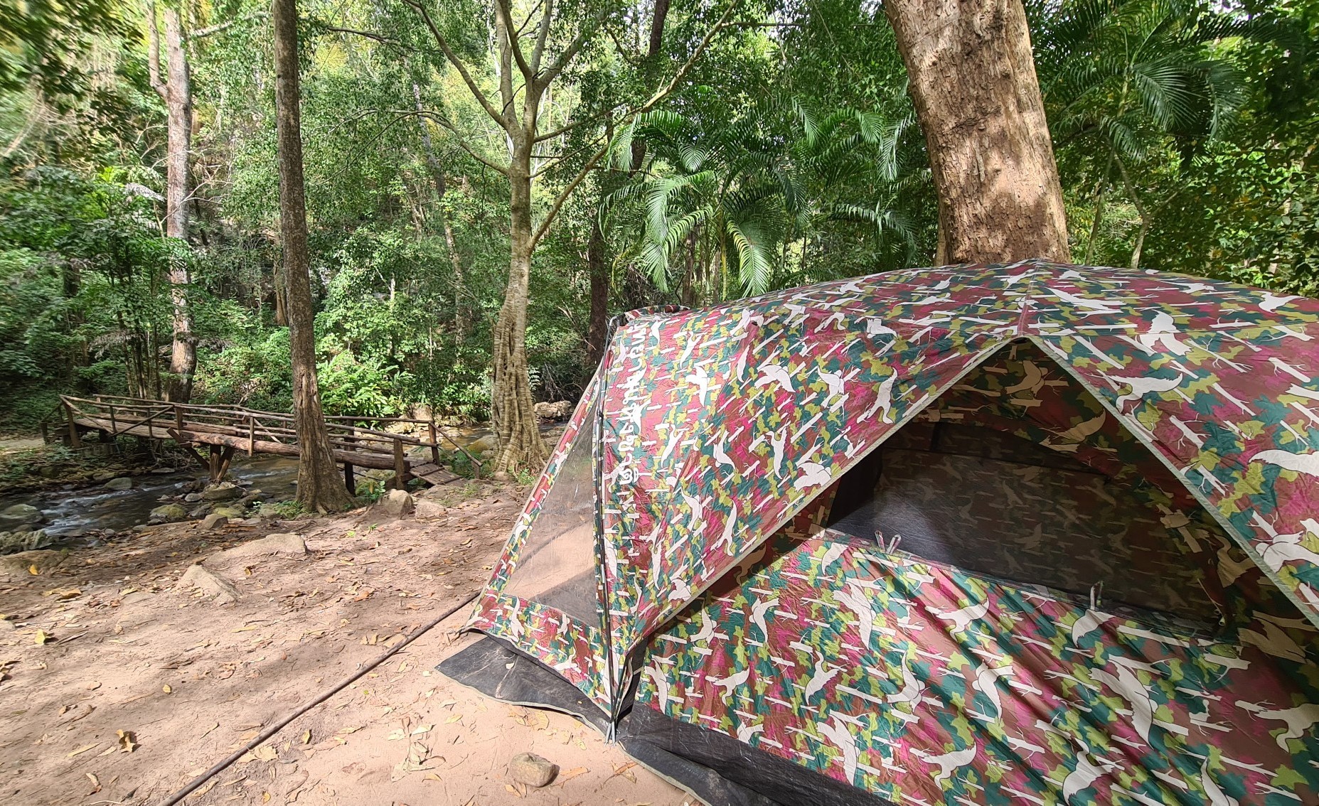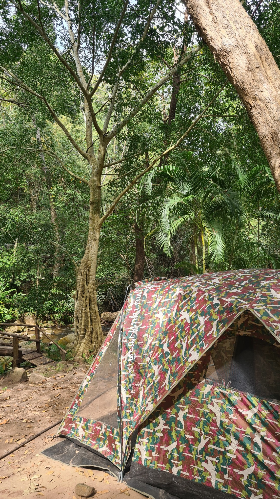 Hier geht es weitaus touristischer zu als im entlegenen Chaloem Rattanakosin. Es gibt riesige Märkte mit Streetfood, Busparkplätze und ein großes Ticketoffice, wo ich meine Eintrittskarte für zwei Tage löse. Danach ist es noch ein gutes Stück bis zum Campingplatz, der schon im NP-Gelände liegt. Auf der kurvigen schmalen Zufahrtsstraße kommen mir links und rechts die ganzen Tagesgäste entgegen, die nach einem Bad in einem der Wasserfall-Pools den letzten Bus nach Kanchanaburi erwischen wollen.