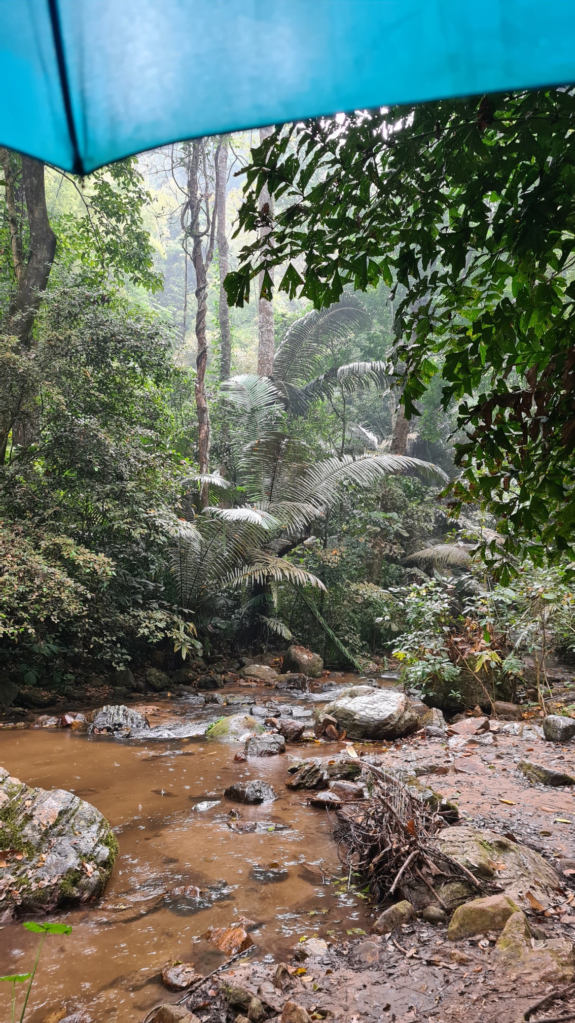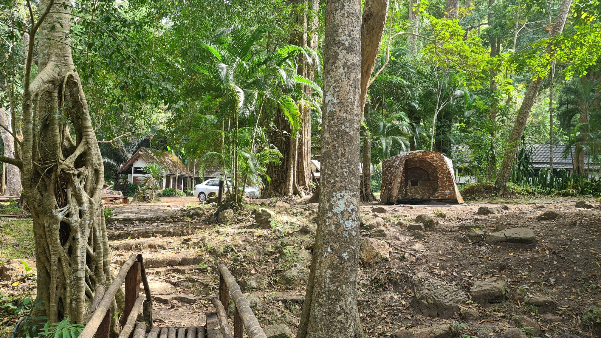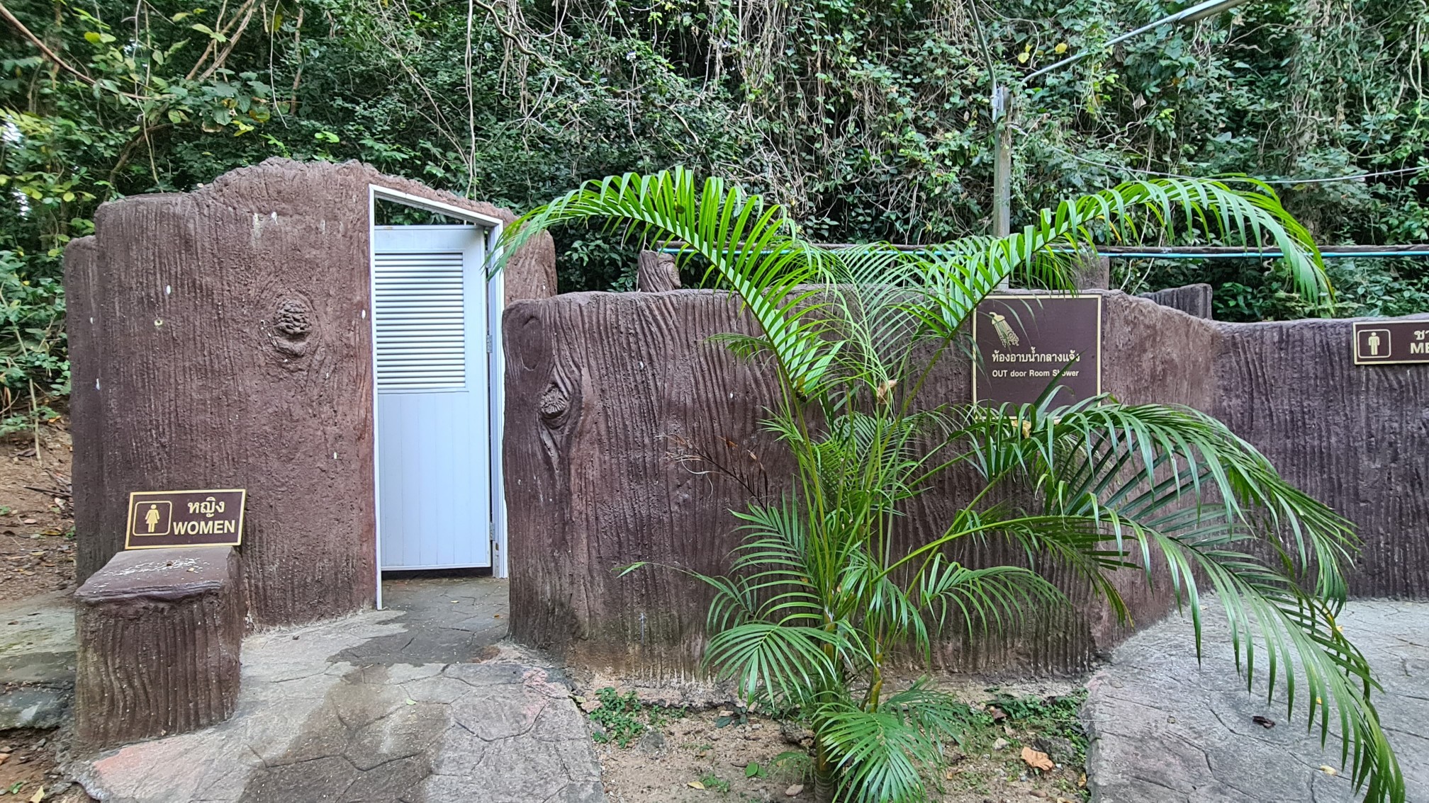 Die Sanitäranlagen sind vorbildlich und mal richtig cool finde ich die DIY-Outdoor-Regendusche: So eine simple Konstruktion und es macht so viel Spaß hier zu duschen!! Am frühen Abend erkunde ich noch ein bisschen Flora und Fauna rund um den Campingplatz und latsche vor zum Head-Office, um in einer der Garküchen noch etwas Warmes zu essen und einen Mango Sticky Rice fürs Frühstück zu kaufen. Glück gehabt, denn die Shops am Parkeingang schließen zwischen 18-19 Uhr, wenn die Tagesbesucher alle weg sind. Dann hätte ich mit dem Auto bis zur Ortschaft fahren … oder hungern müssen.