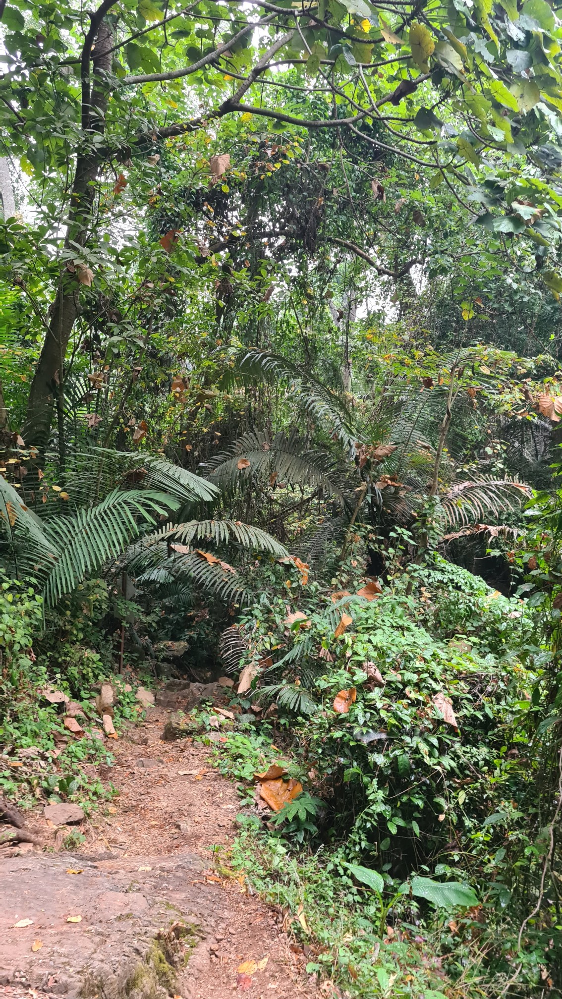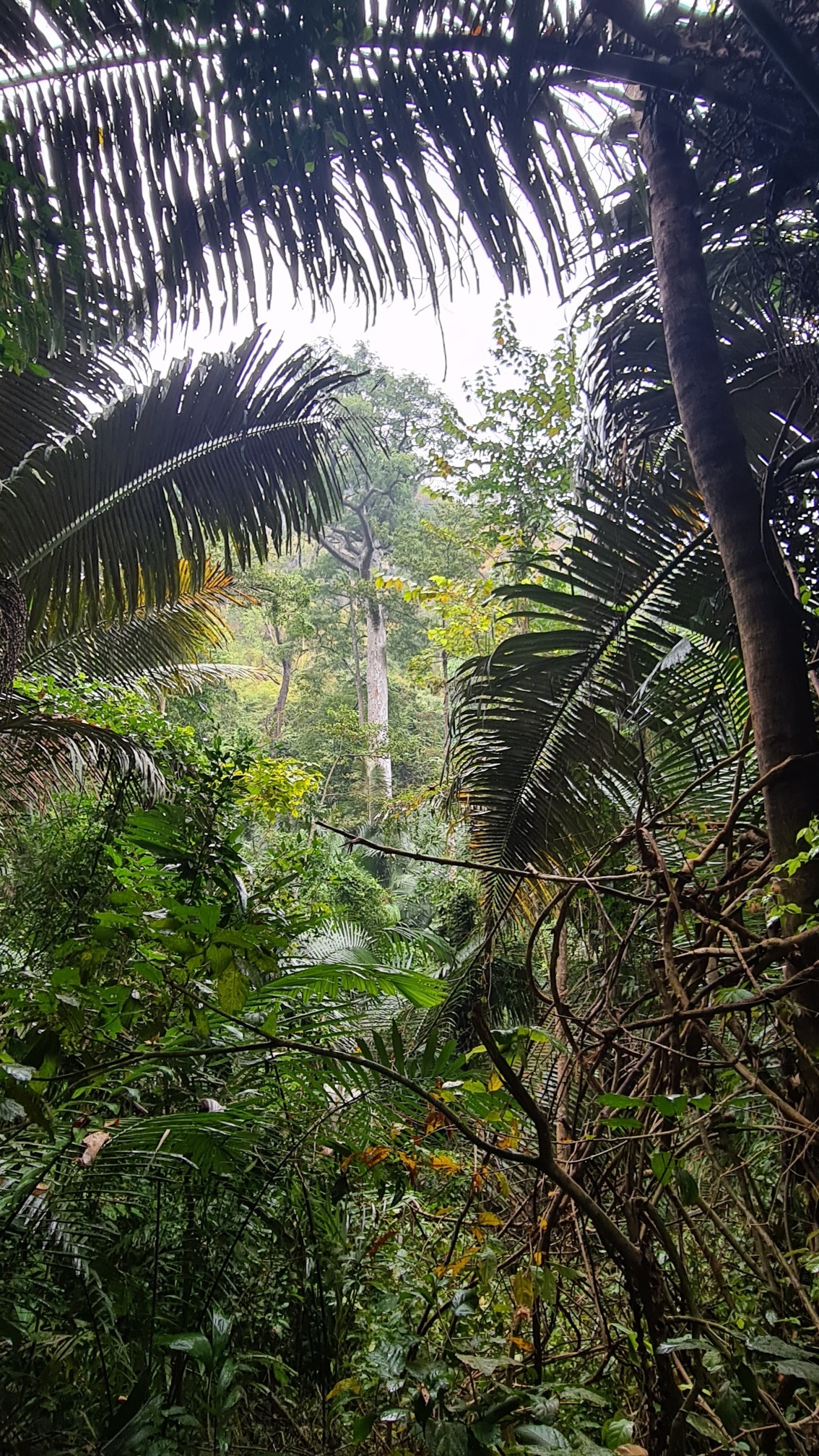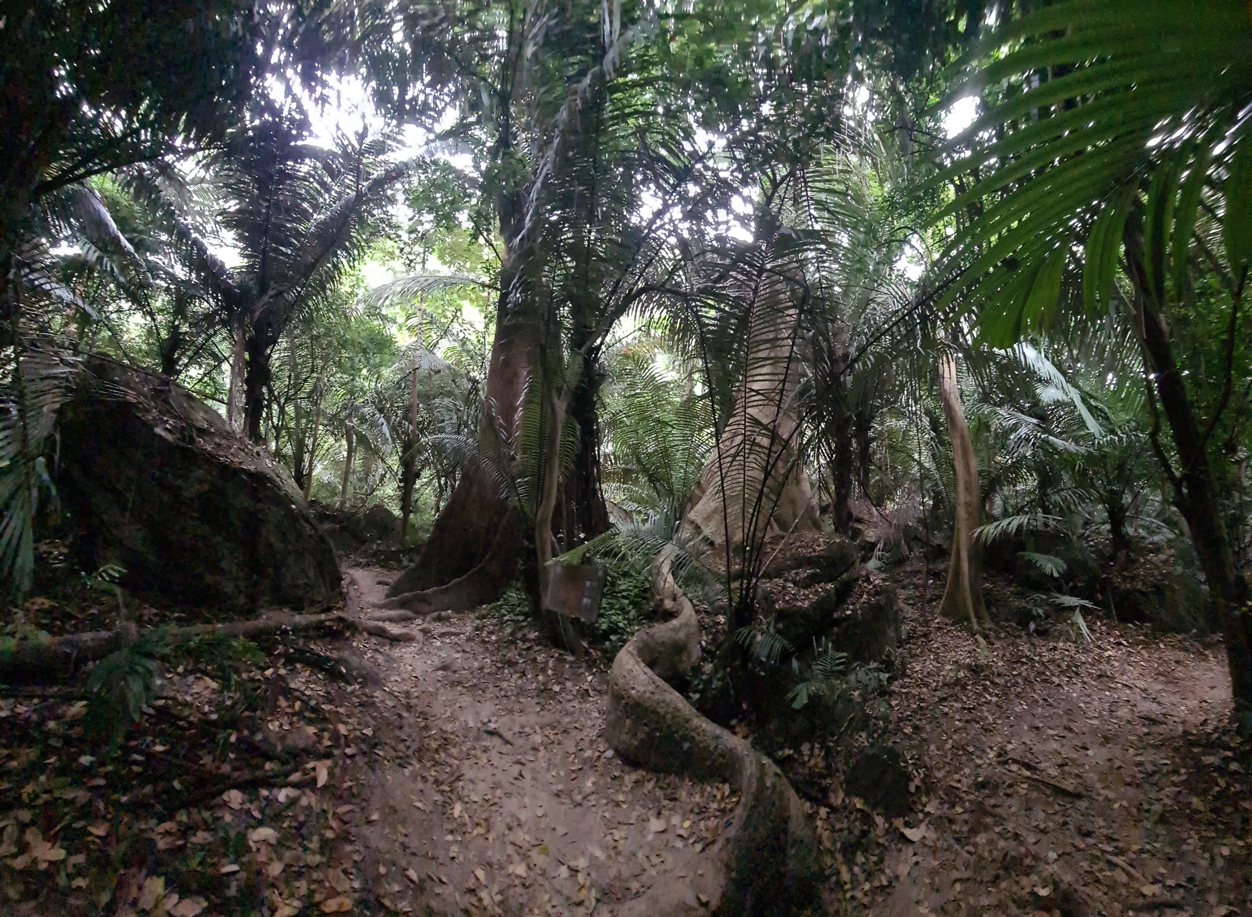 Am hinteren Ende tritt man dann hinaus in eine wilde Dschungelhölle mit Trampelpfad. Es hat leicht angefangen zu regnen, aber das macht auf diesem Trail im Regenwald nicht wirklich viel aus. Ich genieße meine Wanderung, lausche den Geräuschen und begutachte Pflanzen und Bäume.