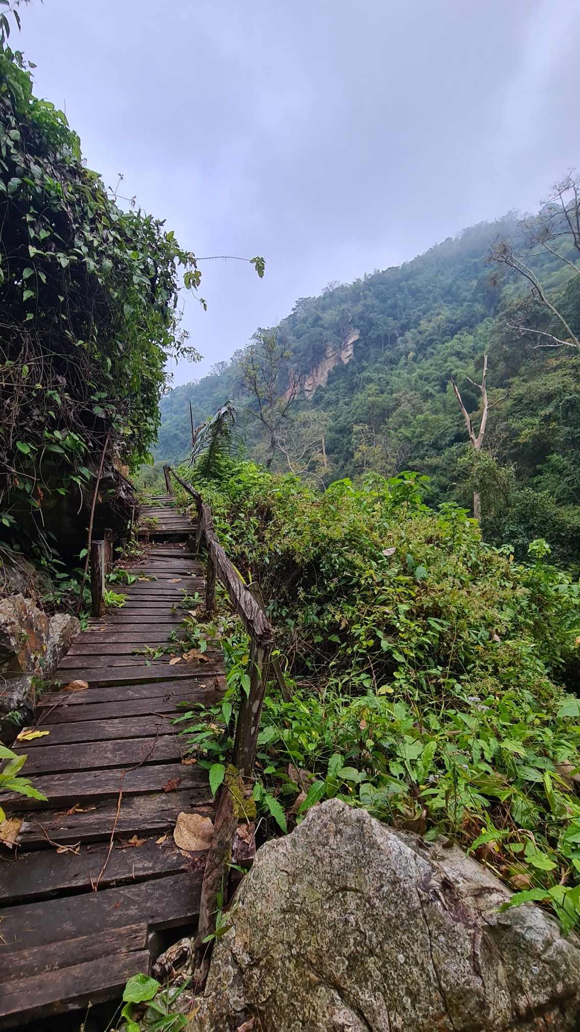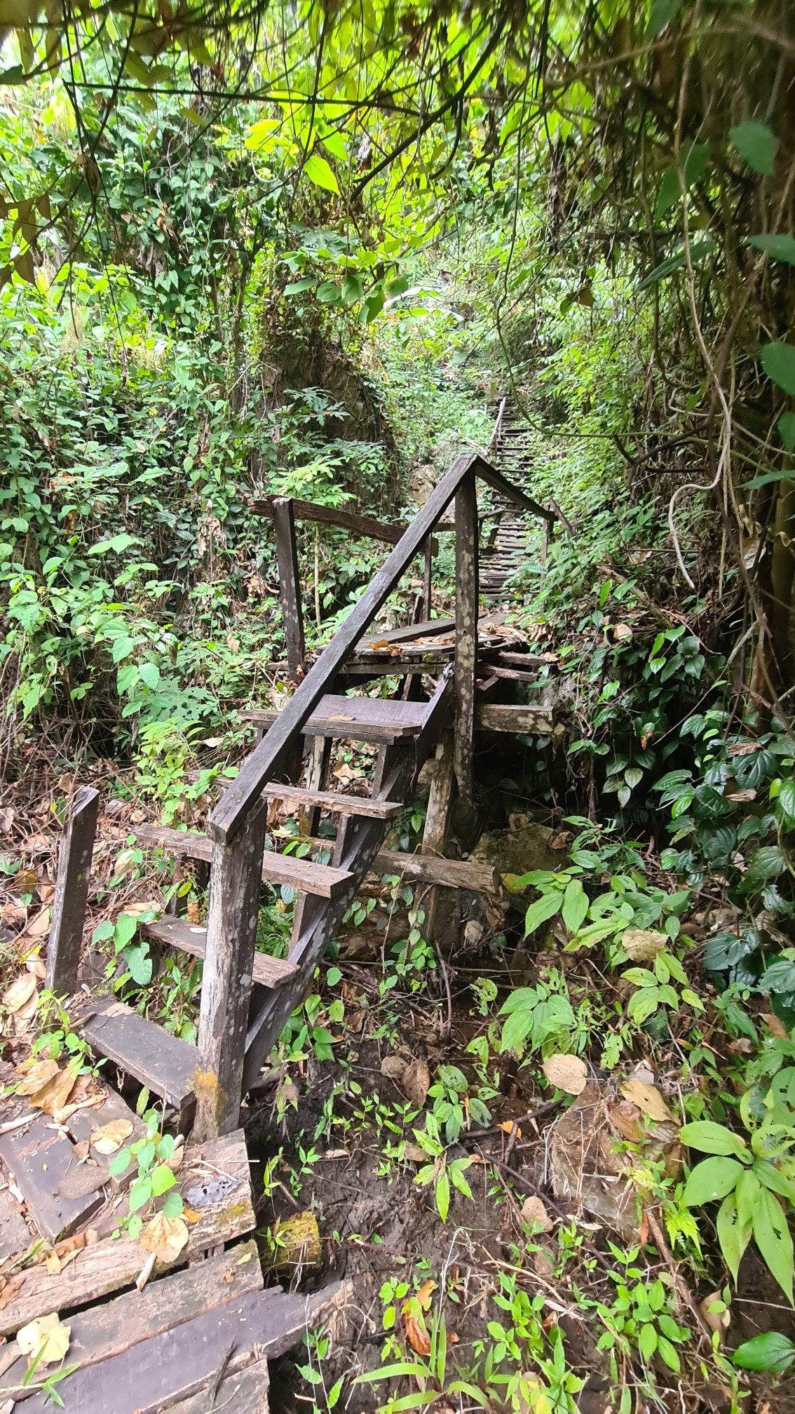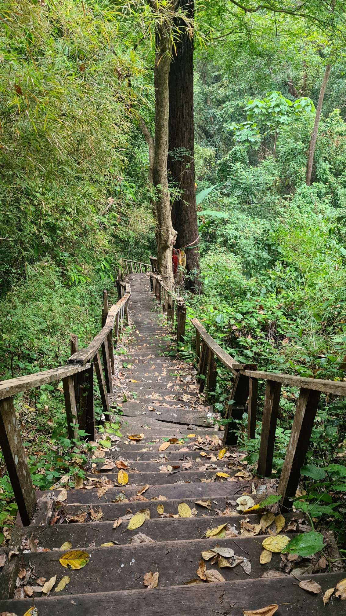 Ah, so liebe ich das: allein mit mir im Nirgendwo, überschaubar abenteuerlich. Nach rund 1,5 Stunden Gehzeit gelange ich zu dem gesperrten Abschnitt, der noch steiler durch den Wald zur Tham Than Lot Yai führen soll. Ich hatte mir dazu Videos auf YouTube angeschaut, da waren allerdings die Treppen und Brücken noch alle top in Schuss, was man aktuell nicht wirklich behaupten kann. Irgendwie scheint das alles in den letzten Jahren der Natur überlassen worden zu sein und ist dabei völlig verwittert. Noch eine ganze Weile wage ich mich über morsche Bretter, entlang wackliger Geländer mit verrosteten Nägeln weiter bergauf. Dabei wird der Weg immer abenteuerlicher, steiler und einsam ist er sowieso. Irgendwann entscheide mich mich, dass das jetzt genug Wagnis und Abenteuer war für heute. Bis hinauf werde ich mich auf diesem maroden Pfad eh nicht trauen. Und wenn dann doch etwas passiert hier im eigentlich gesperrten Wegabschnitt, dann hätte ich wohl die A-Karte gezogen.