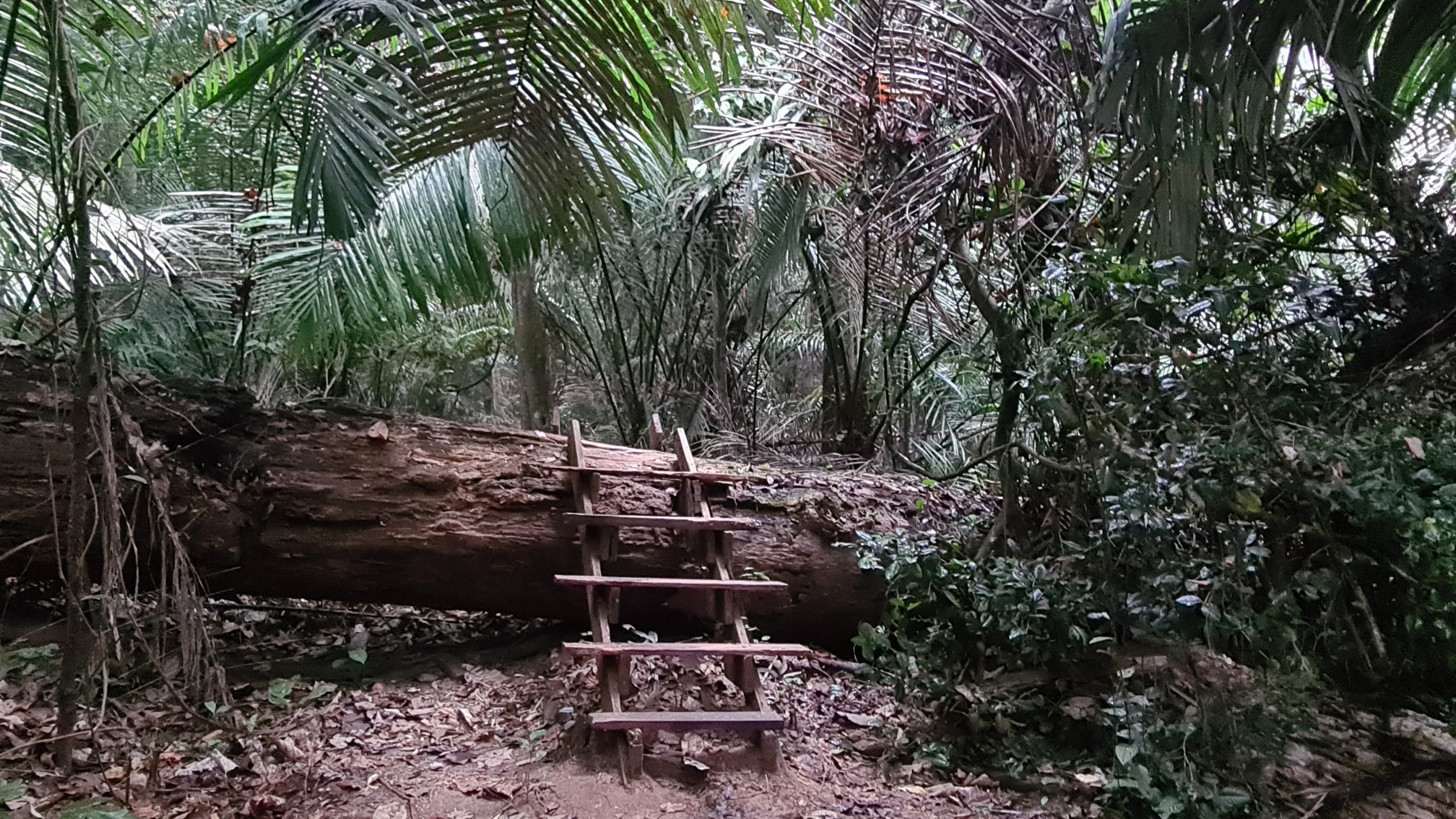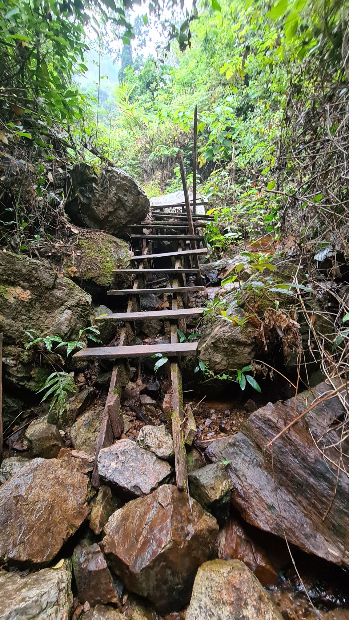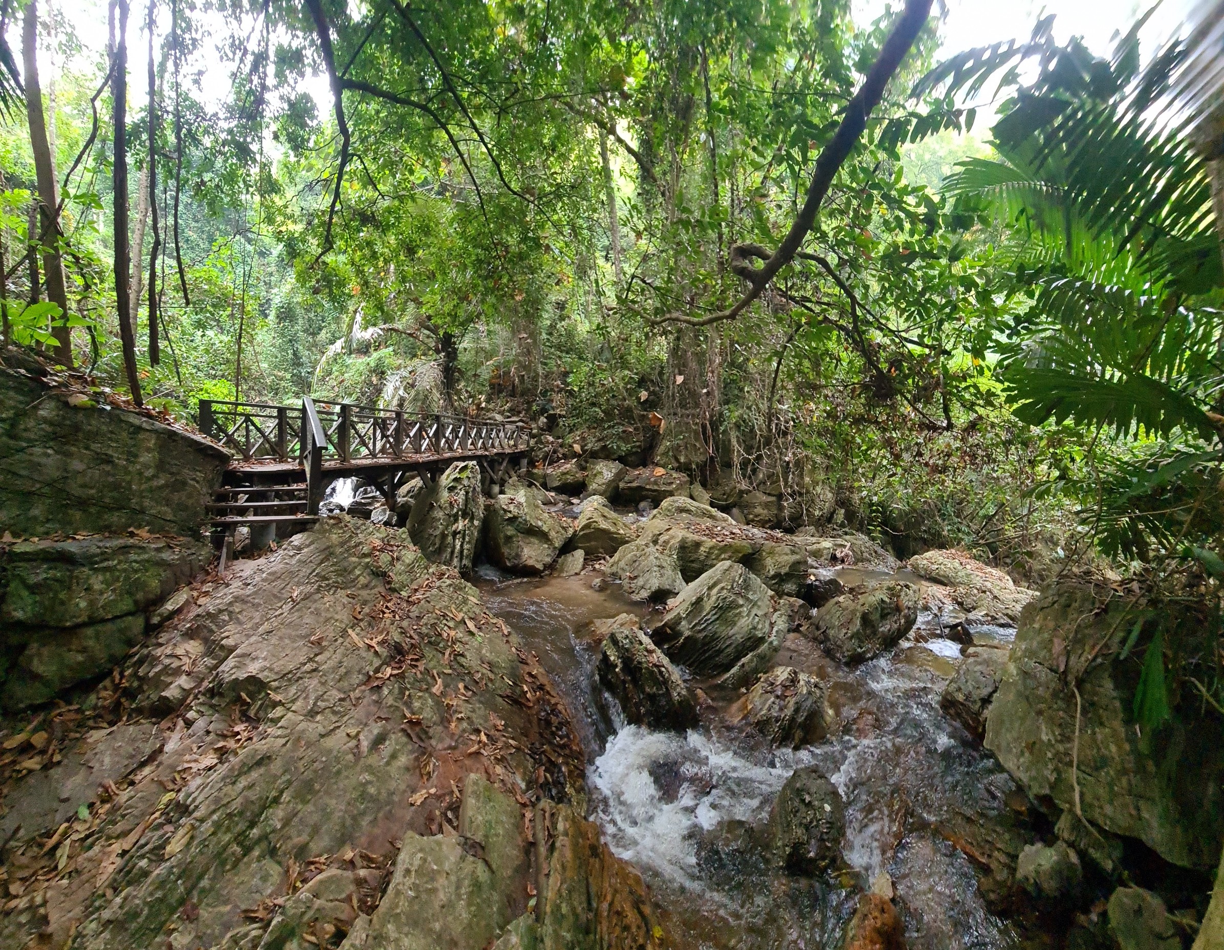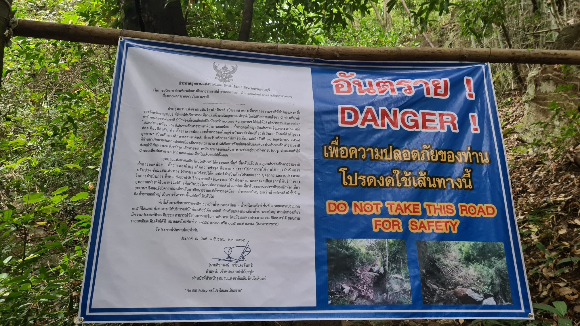 Ah, so liebe ich das: allein mit mir im Nirgendwo, überschaubar abenteuerlich. Nach rund 1,5 Stunden Gehzeit gelange ich zu dem gesperrten Abschnitt, der noch steiler durch den Wald zur Tham Than Lot Yai führen soll. Ich hatte mir dazu Videos auf YouTube angeschaut, da waren allerdings die Treppen und Brücken noch alle top in Schuss, was man aktuell nicht wirklich behaupten kann. Irgendwie scheint das alles in den letzten Jahren der Natur überlassen worden zu sein und ist dabei völlig verwittert. Noch eine ganze Weile wage ich mich über morsche Bretter, entlang wackliger Geländer mit verrosteten Nägeln weiter bergauf. Dabei wird der Weg immer abenteuerlicher, steiler und einsam ist er sowieso. Irgendwann entscheide mich mich, dass das jetzt genug Wagnis und Abenteuer war für heute. Bis hinauf werde ich mich auf diesem maroden Pfad eh nicht trauen. Und wenn dann doch etwas passiert hier im eigentlich gesperrten Wegabschnitt, dann hätte ich wohl die A-Karte gezogen.