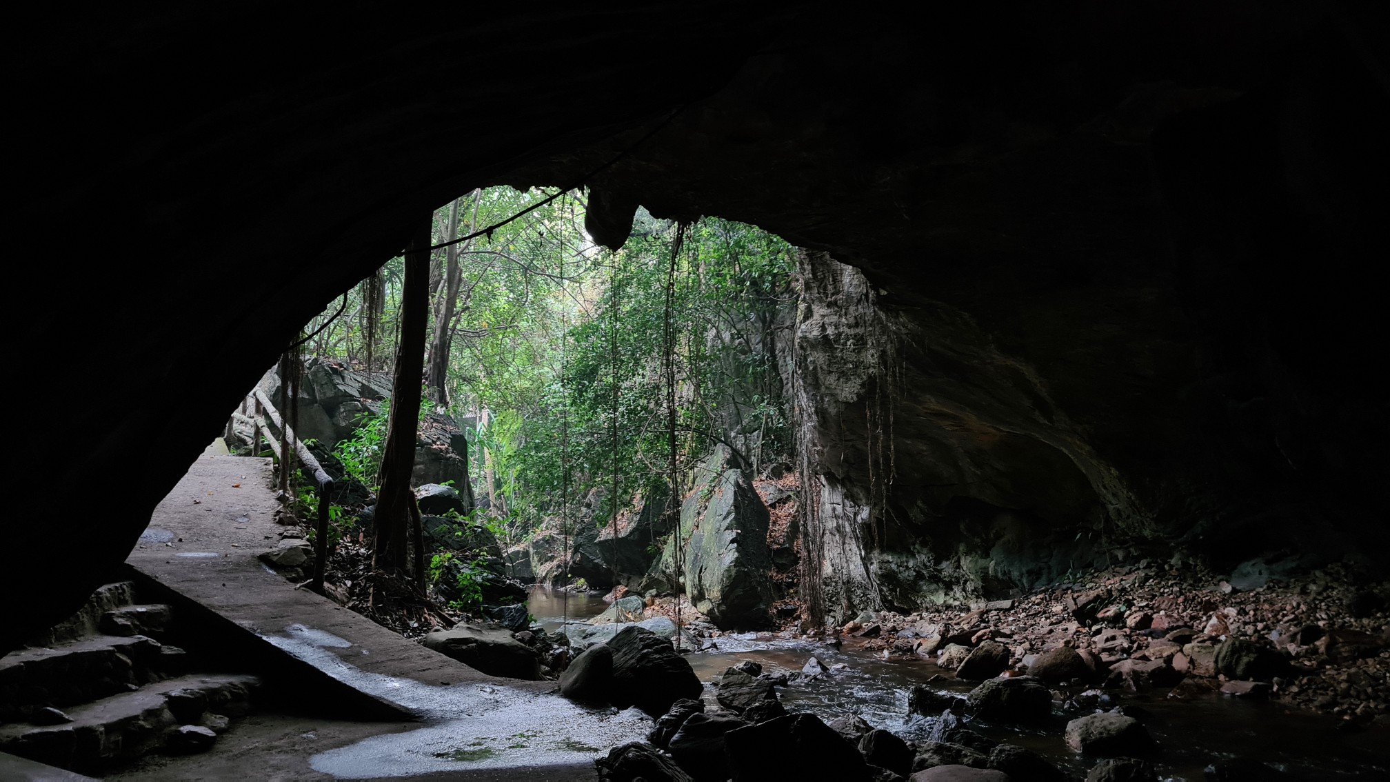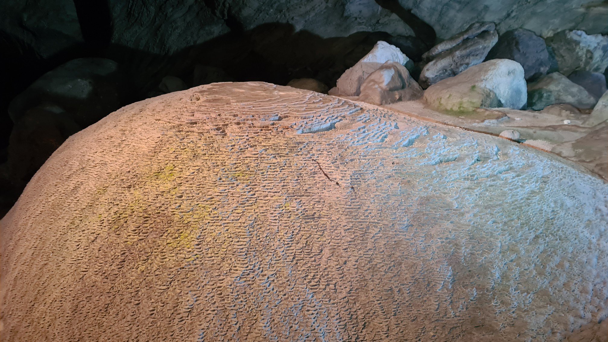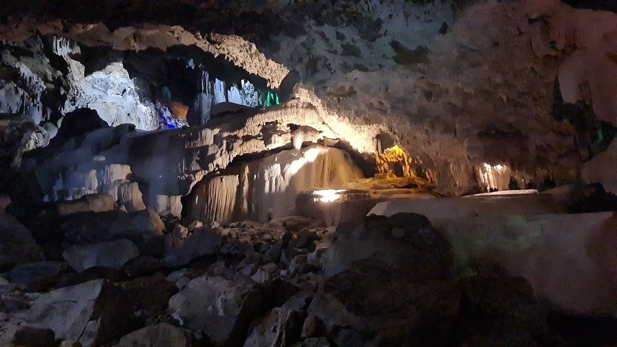 Es ist schön, bei der ersten Durchquerung der Höhle einen Guide an der Seite zu haben, auch wenn die Tham Than Lot Noi selbst für einen Höhlenphobisten wie mich gut zu begehen ist. Ein Fußwegs etwas erhöht entlang des Flussbetts ist durchwegs betoniert ist und die Stalakmiten, Stalaktiten und sonstigen Ablagerungen werden tagsüber stimmungsvoll beleuchtet. Eine Taschenlampe ist dennoch hilfreich, um auch Spinnen, Schlangen und die hier lebenden Fledermauskolonien zu beobachten.
