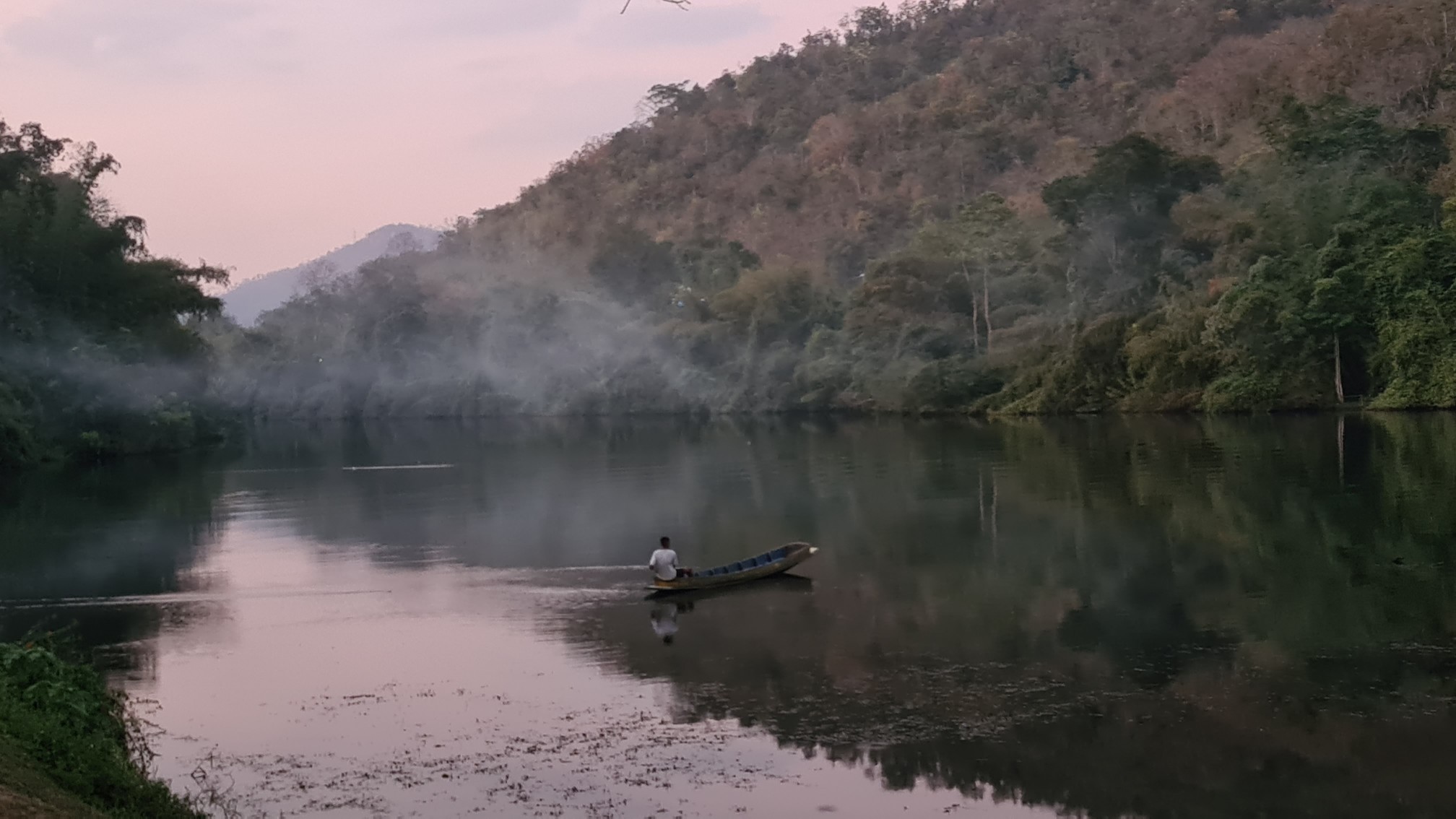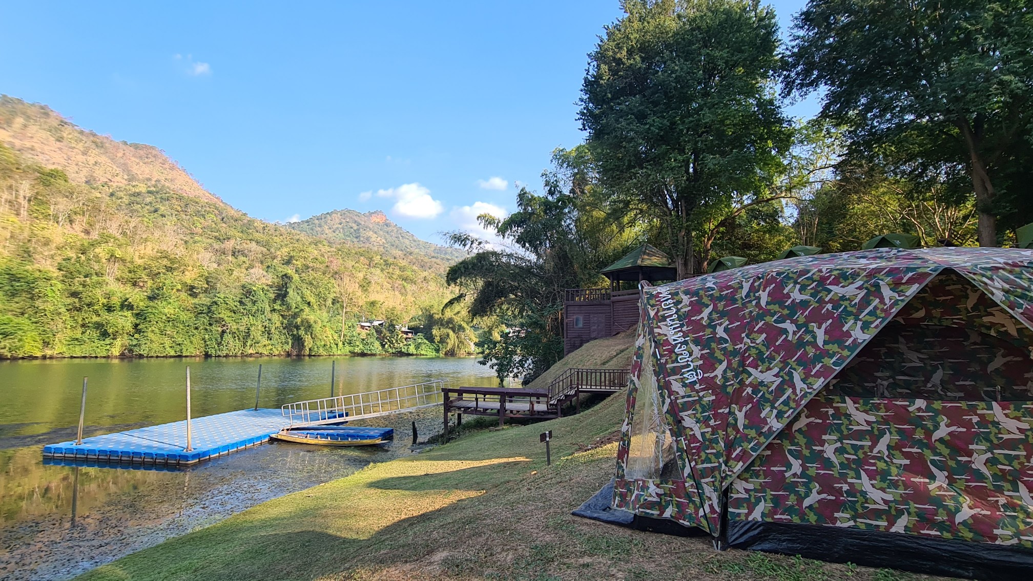 Der Campingplatz im Erawan NP ist „erste Sahne“, die mietbaren Zelte sind ebenfalls neu und liegen herrlich direkt am Ufer des Khwae Yai Flusses – Baden ist allerdings nicht erlaubt. Ich darf mir eines der Zelte in Reih und Glied aussuchen, da alle noch leer sind. Die Thais lieben das Campen und so hausen auf der großen Wiese nebenan auch ein paar Pärchen und Gruppen, die ihre eigenen Zelte aufgeschlagen haben. Auch eine Art Herberge mit Schulungszentrum für Jugendgruppen und Schulklassen gibt es im Naturpark.