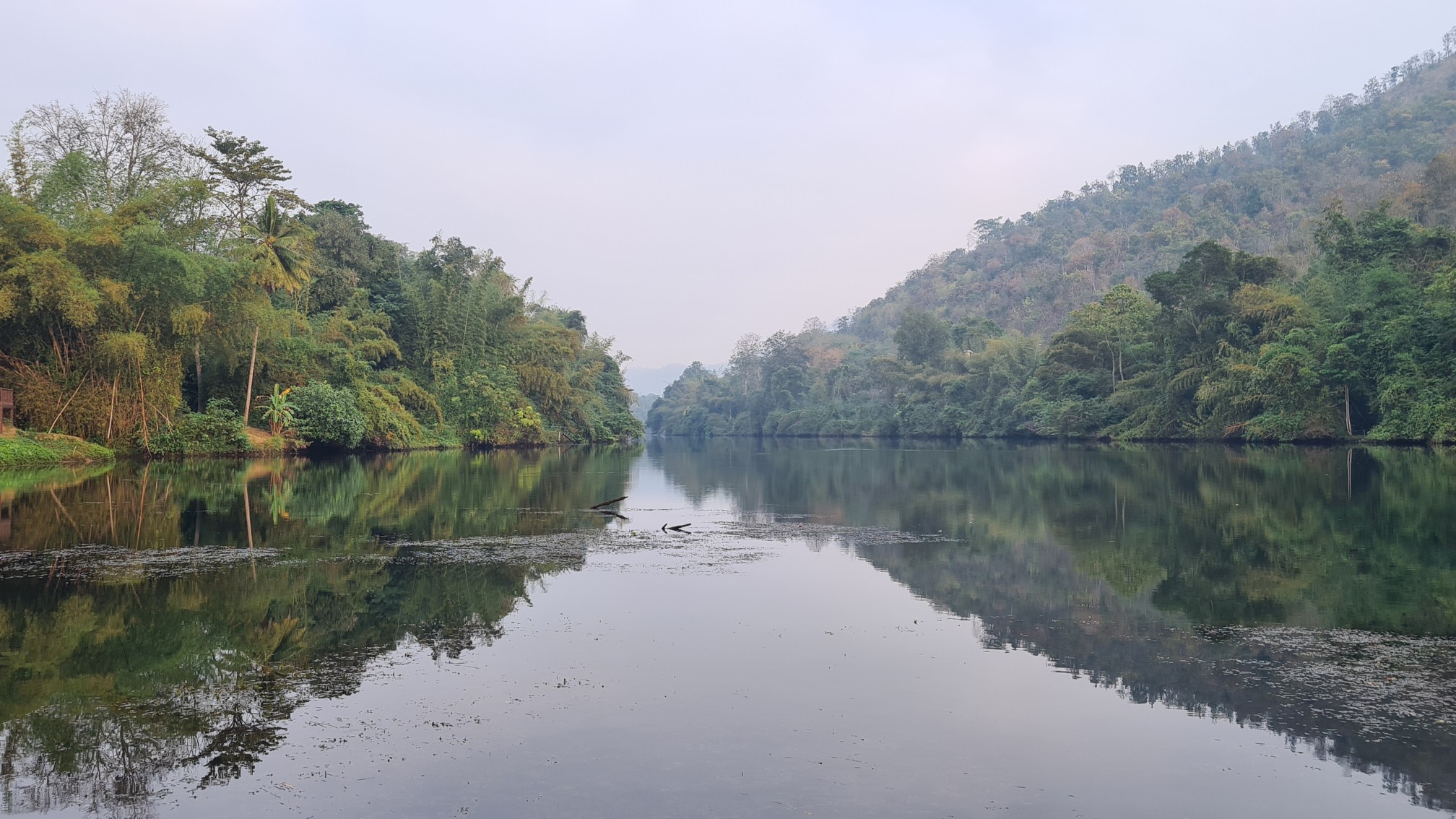 Hoch konzentriert und noch etwas angespannt meistere ich die Ausfallstraßen, Ampeln und Kreisverkehre Kanchanaburis, auch wenn ich dabei öfter den Scheibenwischer anstelle des Blinkers zum Einsatz bringe, und fahre dann auf sehr breiten und nahezu leeren Straßen gen Norden zum Nationalpark Chaloem Rattanakosin, in dem ich morgen eine 5-stündige Wanderung machen möchte.