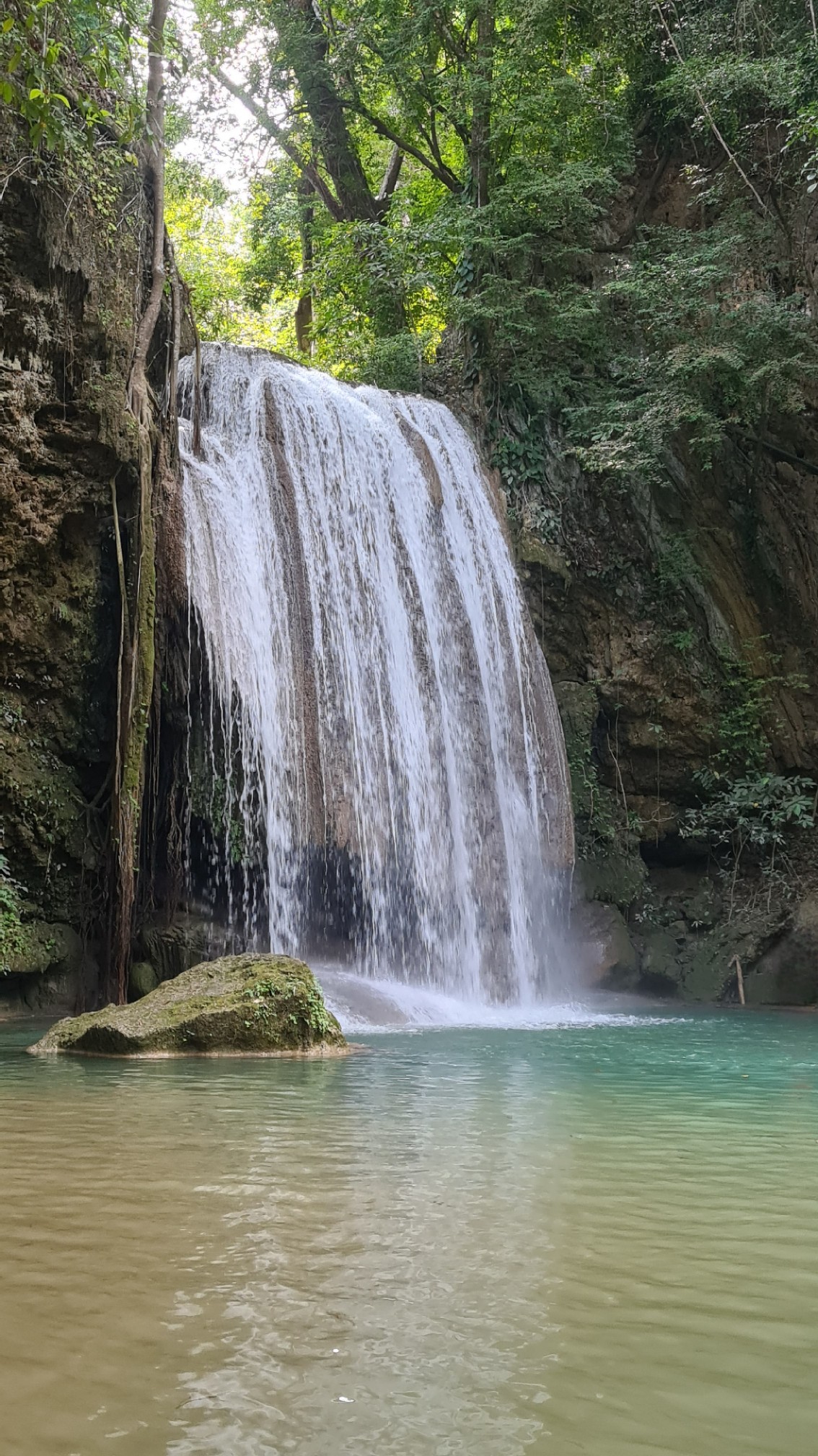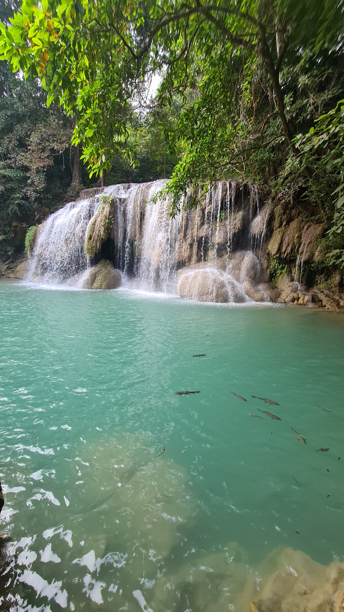 Also laufe ich relativ zügig, abgesehen von einigen Irrwegen wegen Falschinterpretation der Wegweiser, über einfache Wege und Treppen in 1,5 Stunden hinauf zum 7. Wasserfall und teile mir doch tatsächlich das eisblaue, coole (durchaus auch im Sinne von „kühle“) Schwimmbecken unterhalb des hohen Erawan-Wasserfalls für knappe 20 Minuten nur mit den gefräßigen Spa-Fischen. Wie immer bin ich bestens ausgestattet mit Bikini, Wasserschuhen, Microfaser-Handtuch und Wetbag – auch für mein Smartphone. Lustig ist zu beobachten, dass die meisten Young Traveller entweder nichts dabei haben, die Fisch-Pediküre fürchten, ihnen die Steine zu klitschig oder das Wasser zu kalt ist. So dippen die Meisten nur mit viel „Ah, Oh und Ih“ mit den Zehenspitzen ins Wasser oder tauchen allemal nur kurz für das nötige Instagram-Foto mit Victory-Zeichen ins kühle Nass, um dann ganz zackig auf allen Vieren wieder aus dem Bassin herauszukriechen.