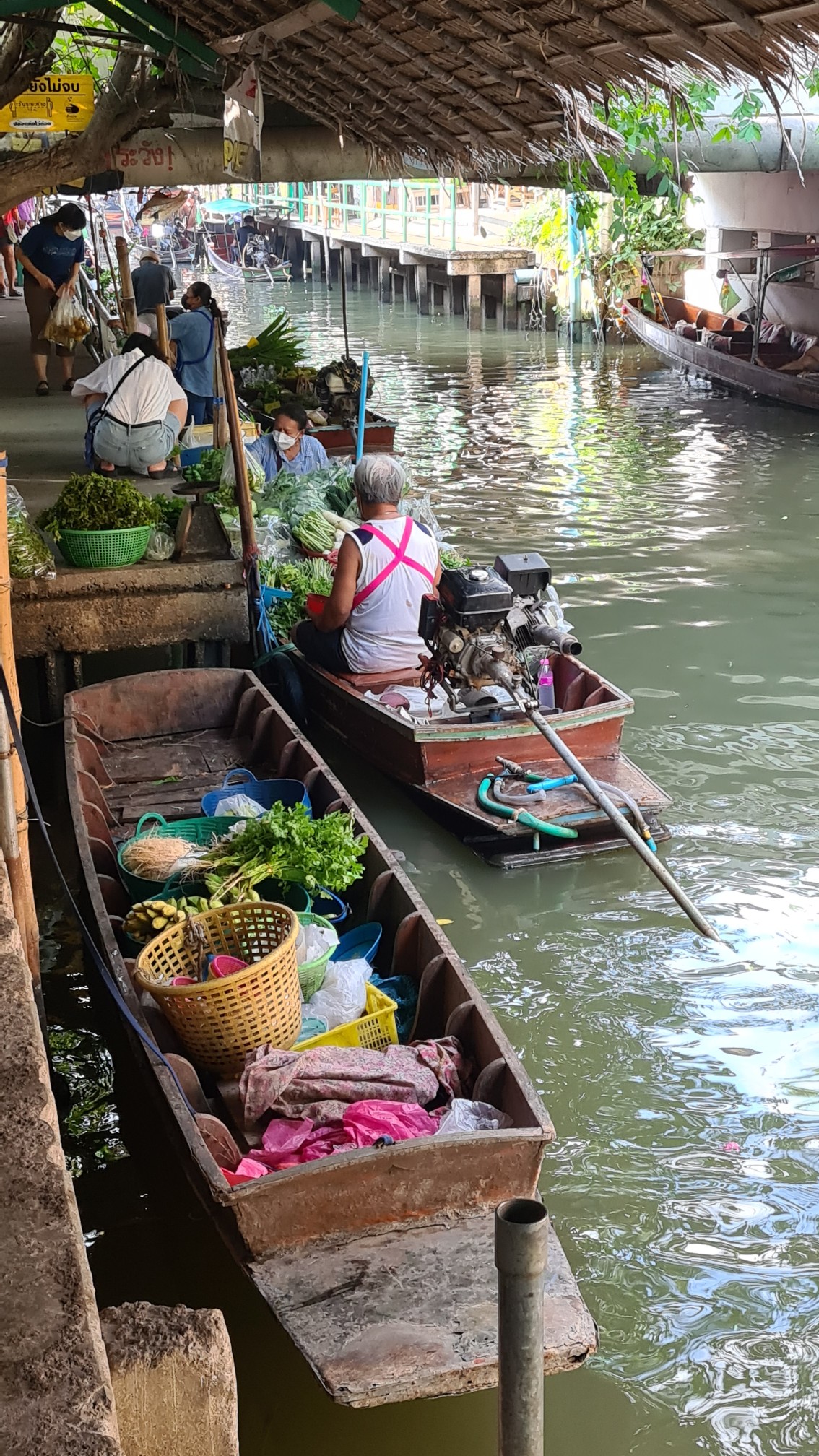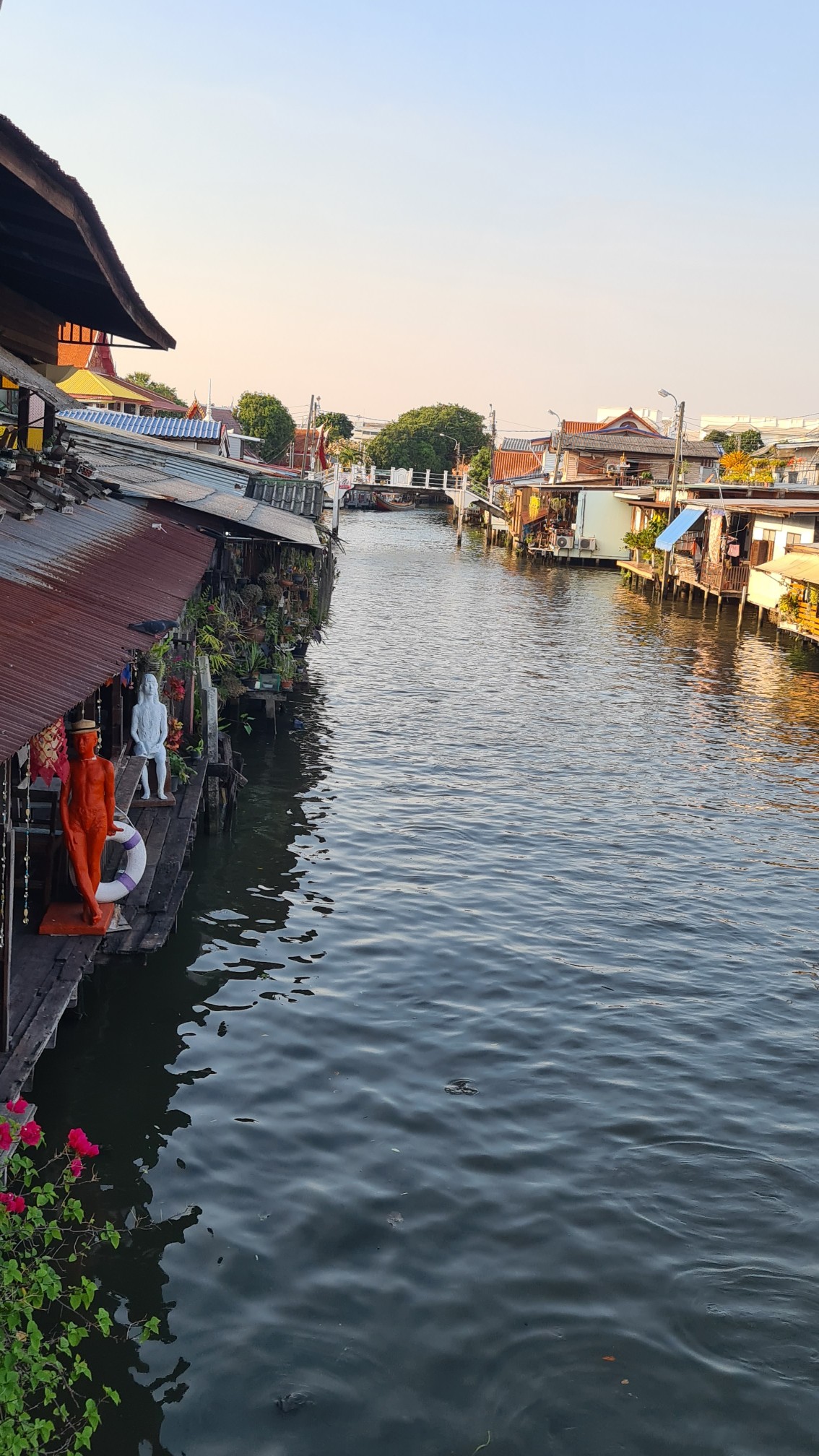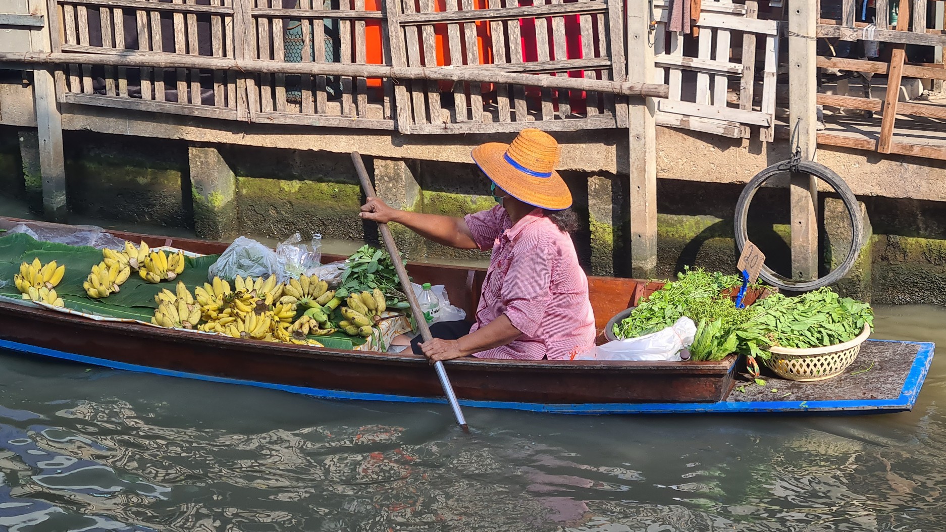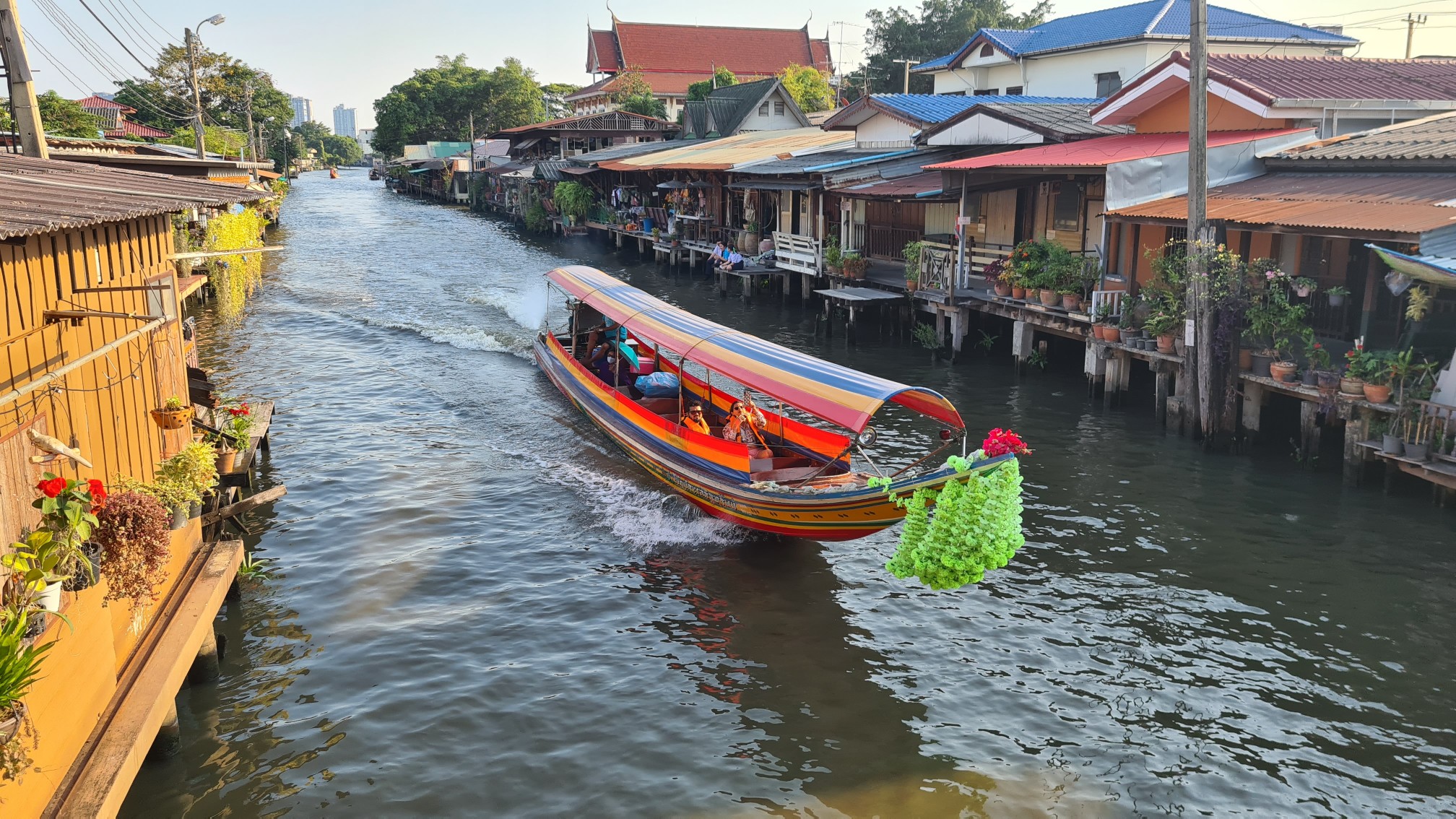 Das ist ja mal ein Tapetenwechsel! Aus den einsamen Zelt-Camps in den wilden, grünen Nationalparks Kanchanaburis bringt mich der Bus am Freitag, den 13.01.2023, zurück in die engen Häuserschluchten und pulsierenden Straßen Bangkoks. Dieses Mal komme ich am Southern Bus Terminal an, das liegt noch auf der Thonburi-Seite, also westlich des Chao Phraya Flusses, wo ich die nächsten zwei Tage die Khlongs und die schwimmenden Märkte auf eigene Faust erkunden will. Diese zusätzliche Visite Bangkoks hatte ich ursprünglich gar nicht geplant. Aber nachdem ich mit dem geleasten Auto in Kanchanaburi viel zeitsparender von A nach B gekommen bin und mich Bangkok schon zu Beginn meiner Reise total fasziniert hat, kam mir das Zeitfenster wunderbar gelegen.