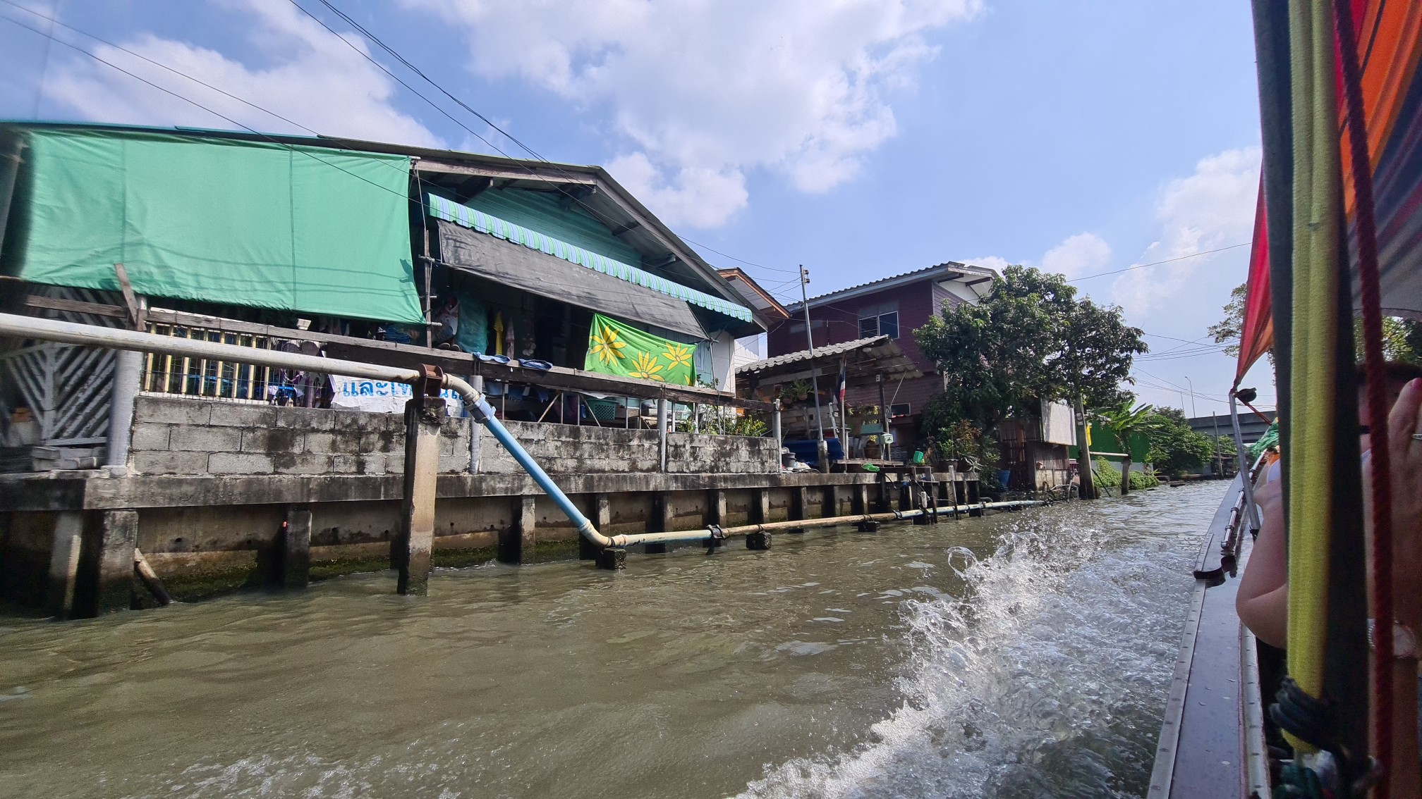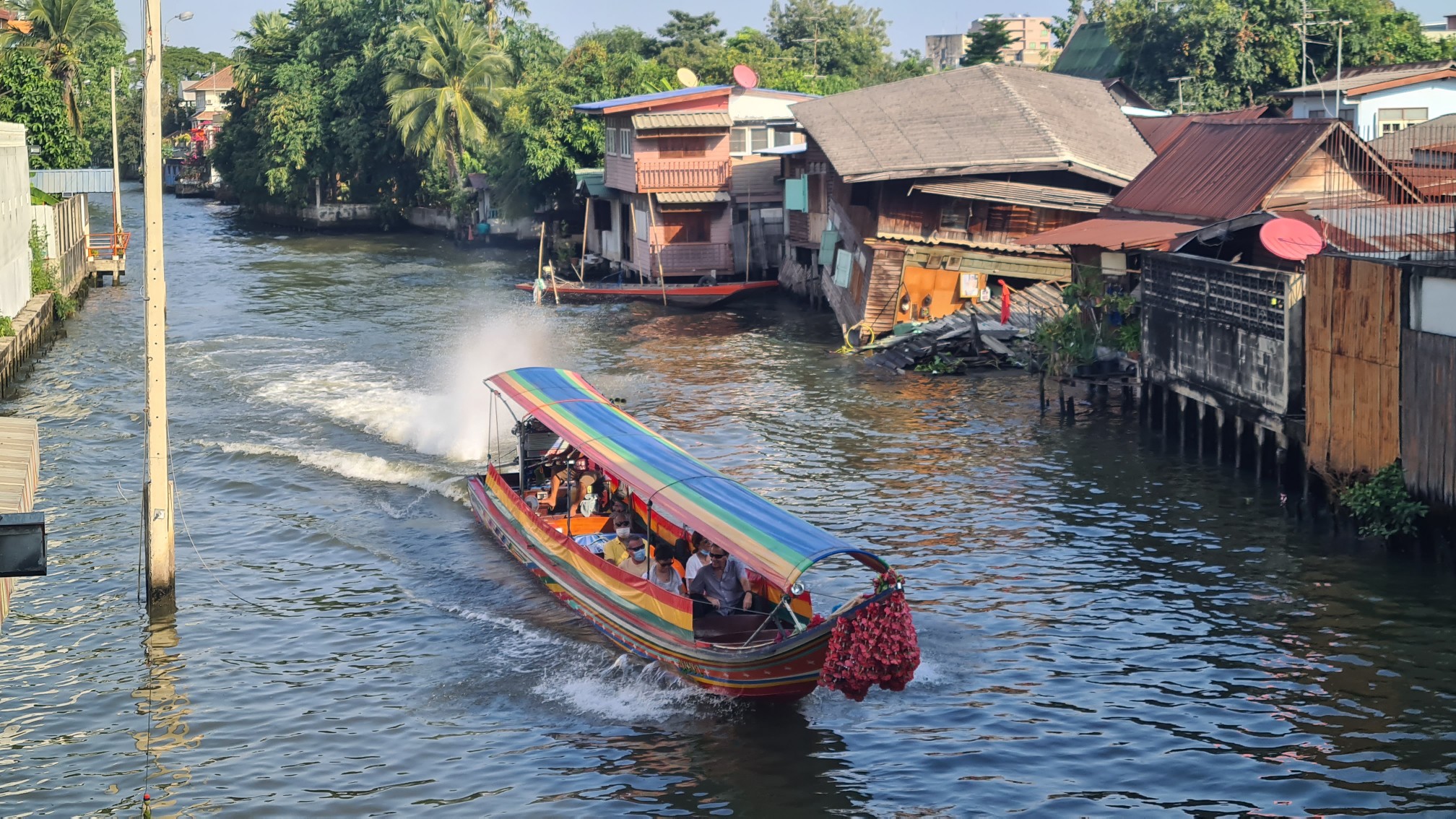 Ab dem Taling Chan Markt kann man für günstige 100 Baht eine einstündige Longtailboot-Tourifahrt durch die Khlongs machen. Ach, das reicht mir doch gerade mal, um eine andere Perspektive der Wasserstraßen zu erhaschen. An der Schiffsanlegestelle herrscht Chaos mit viel Geschrei und Gefuchtel, dabei wäre es ein Leichtes mit einfachen Pappschildern das Boarding für die diversen Routen und Boote zu organisieren. Wir haben sogar eine Tourleiterin an Bord, die ich allerdings schon kurze Zeit später verfluche, kreischt sie doch mit furchtbar nerviger Stimme in ihr Megafon, dass einem schier das Trommelfell platzt. Dazu der dröhnende Motor und das Stimmengewirr der Fahrgäste – da habe ich nach 5 Minuten Gruppentour schon die Nase voll. Ich „verabschiede mich“ indem ich mir die Ohropax einstecke und genieße so relativ geräuschgedämpft die weitere Fahrt. Die Eindrücke der wassernahen Bebauung sind vielseitig und faszinierend, durch die meist rasante Fortbewegung aber auch leider nur von kurzer Dauer und ich freue mich, so viele Kilometer zu Fuß und in Muse abgelaufen zu haben.