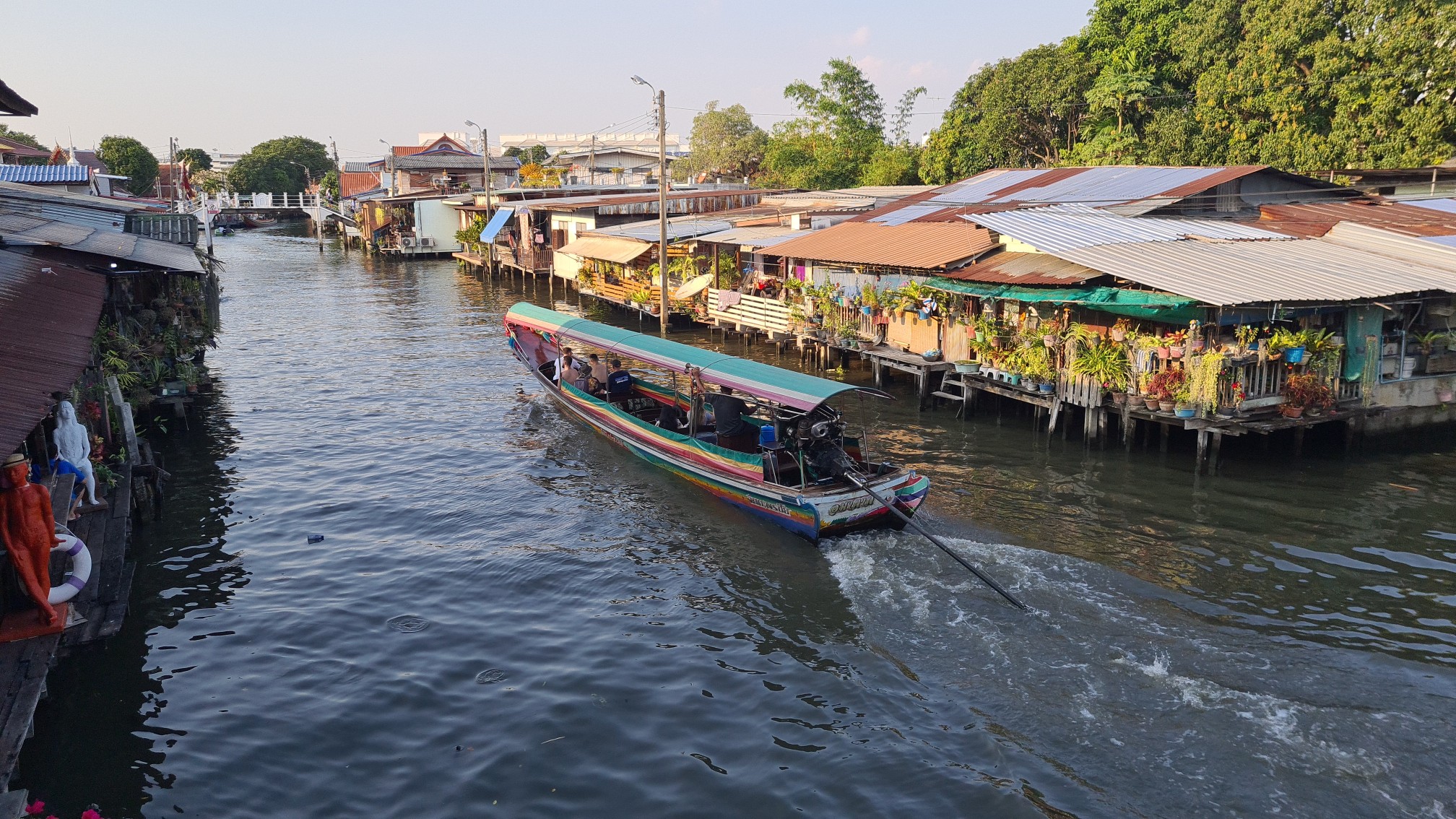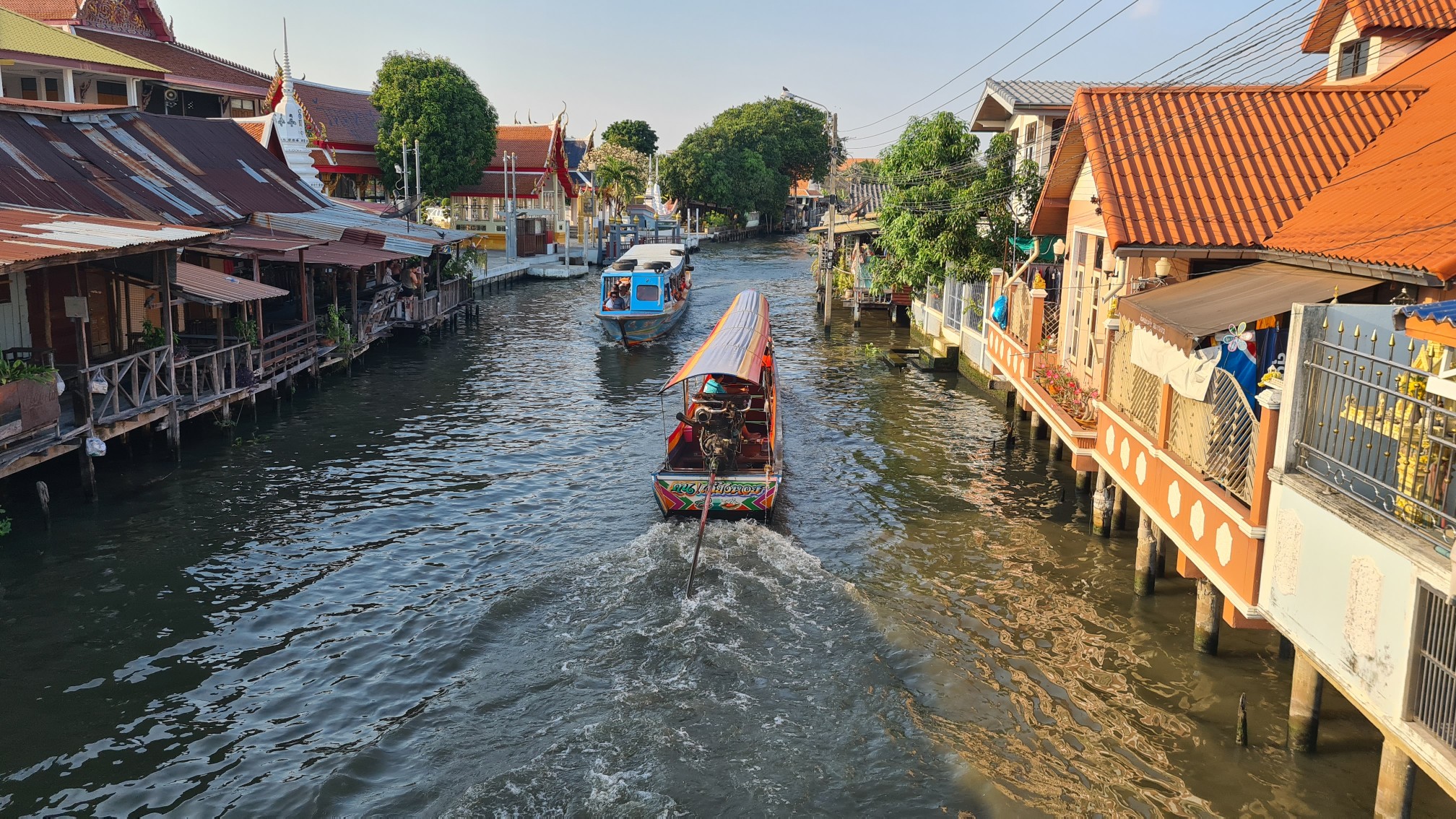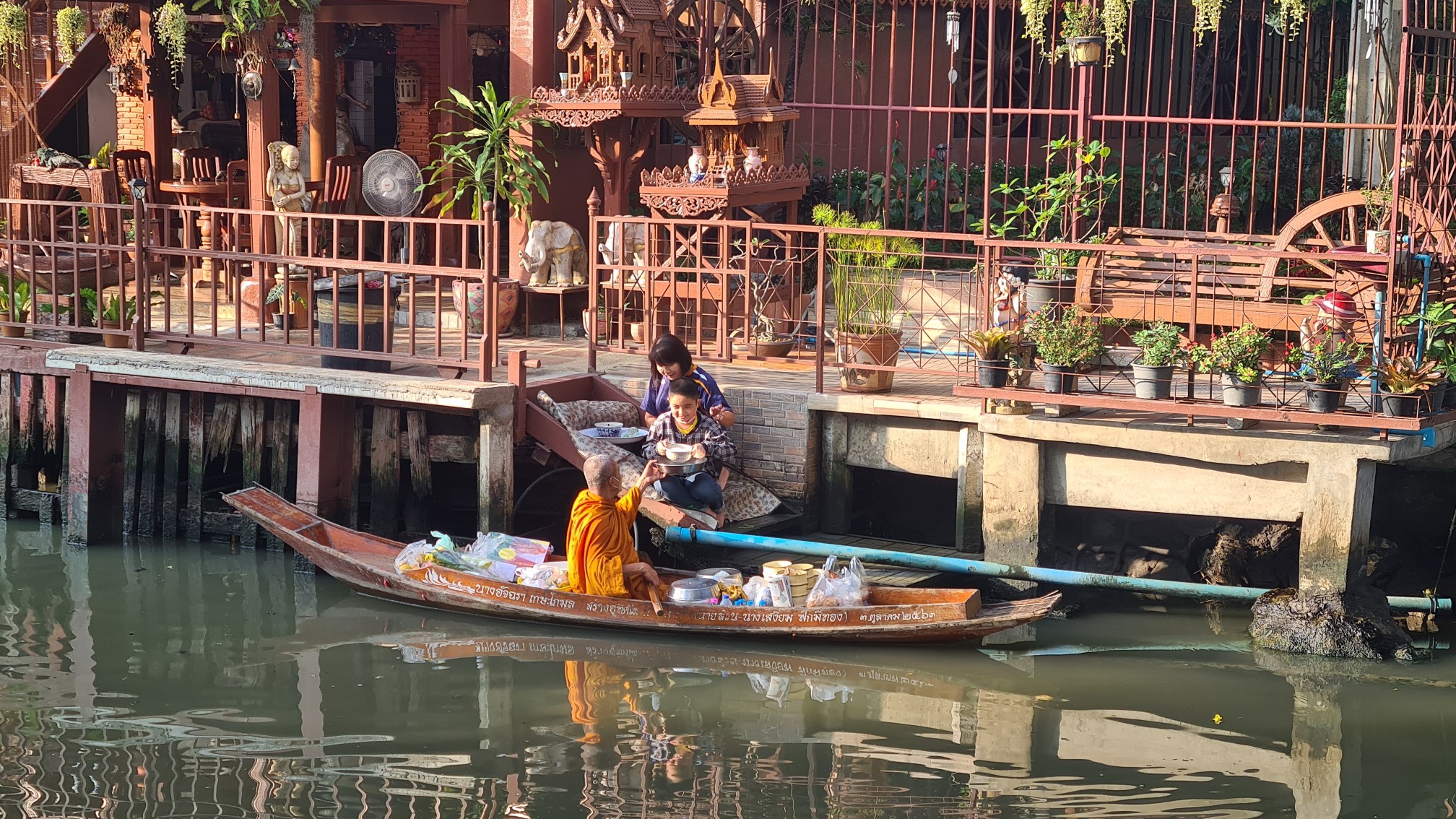 Dagegen strahlt der Vorzeige-Khlong Bang Luang geradezu im warmen Licht der Abendsonne. Lange Zeit beobachte ich auf einer der kleinen Brücken über den Khlong die Longtail-Boote, die mit ihren laut knatternden Motoren Passagiere aus aller Herren Länder mal mehr oder weniger schnell durch die Wasserstraßen manövrieren.