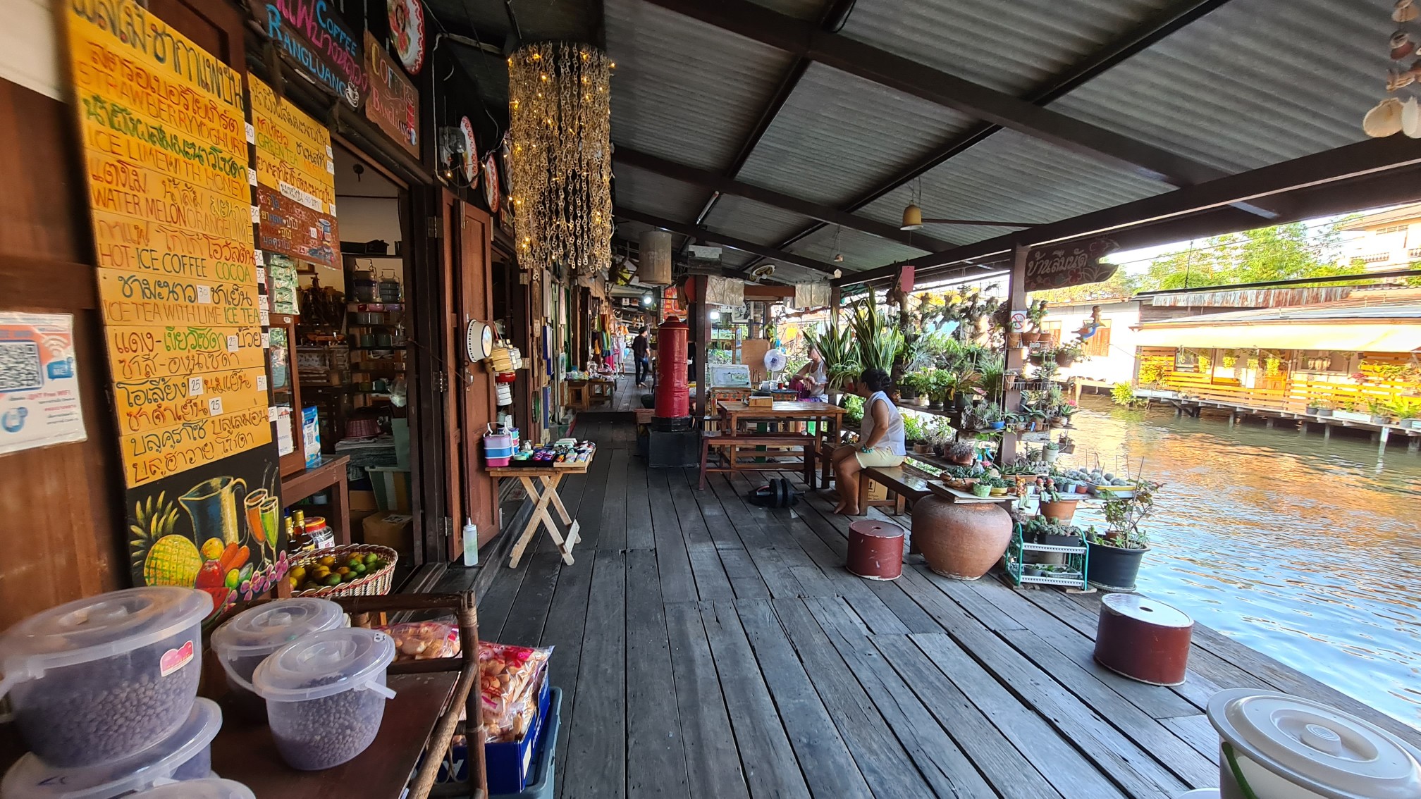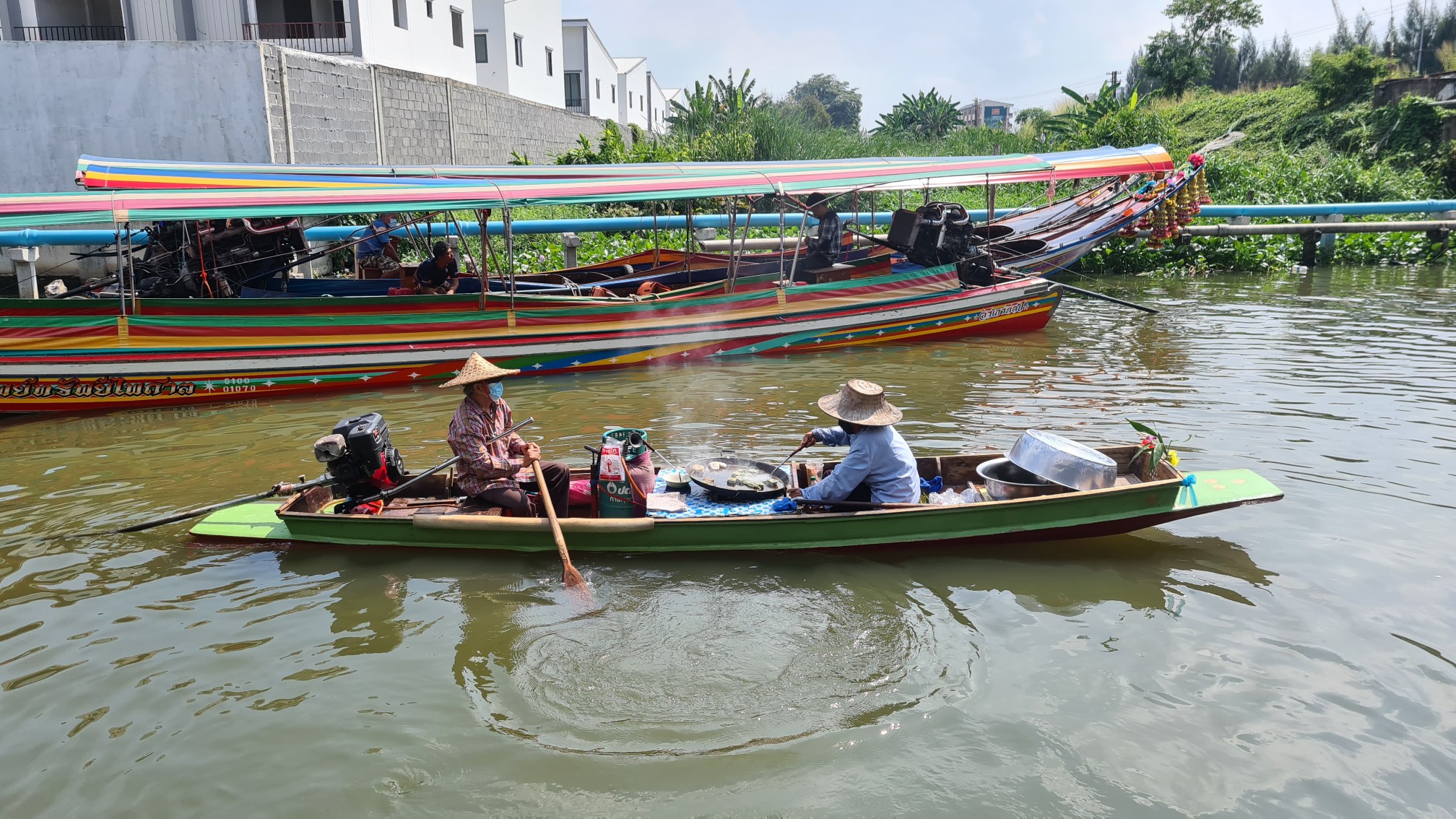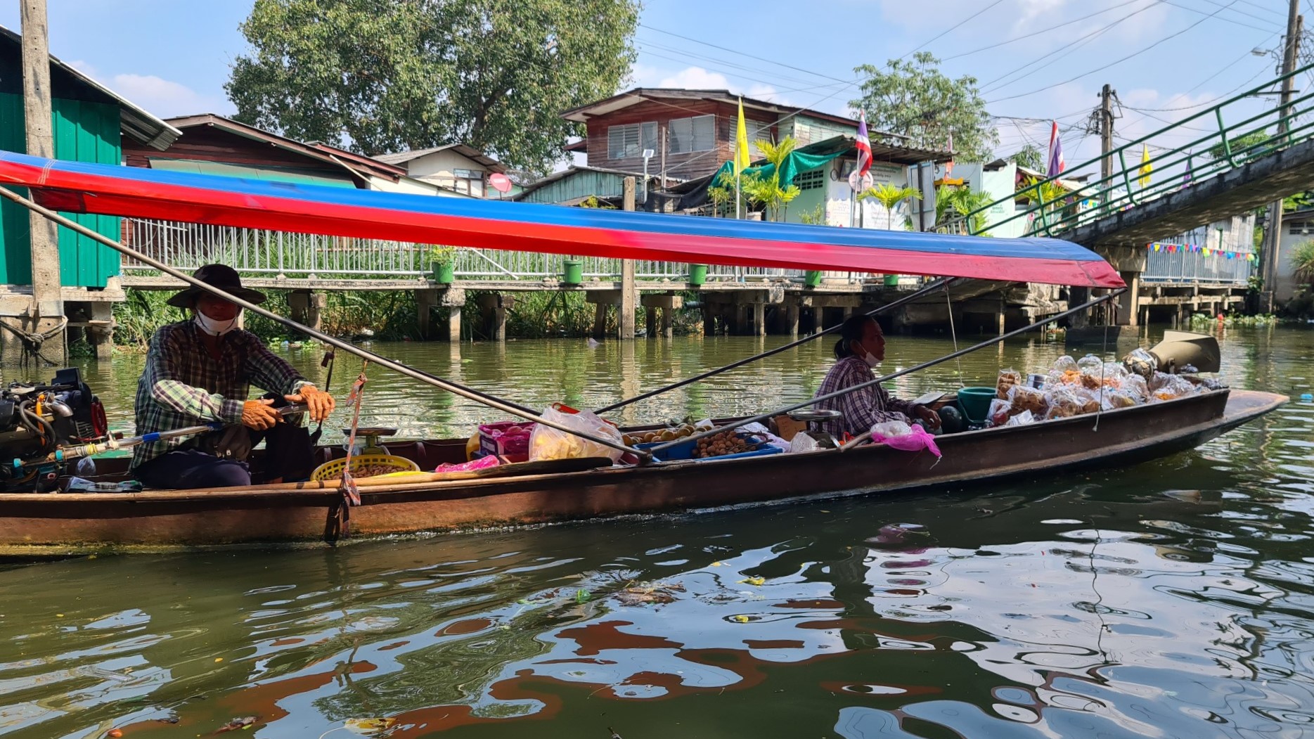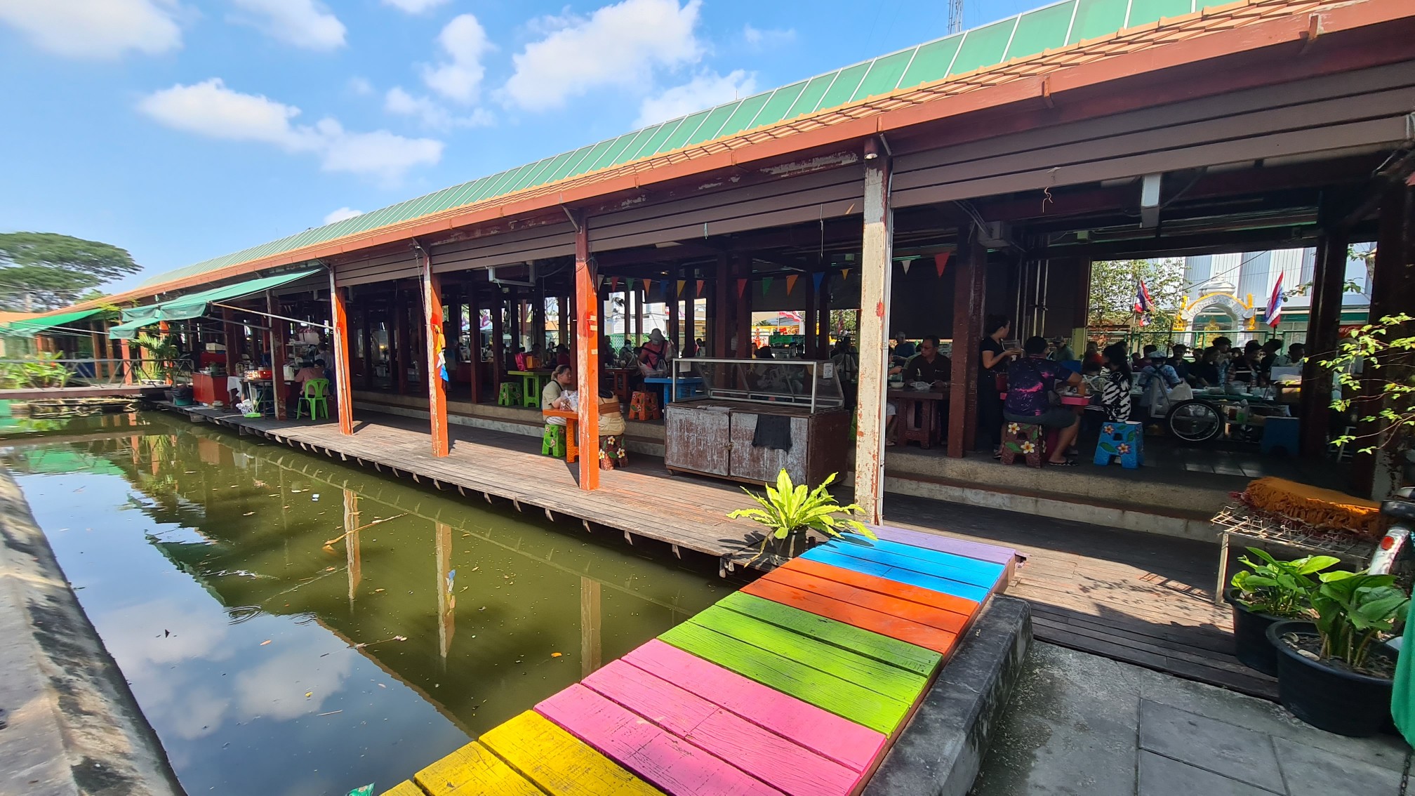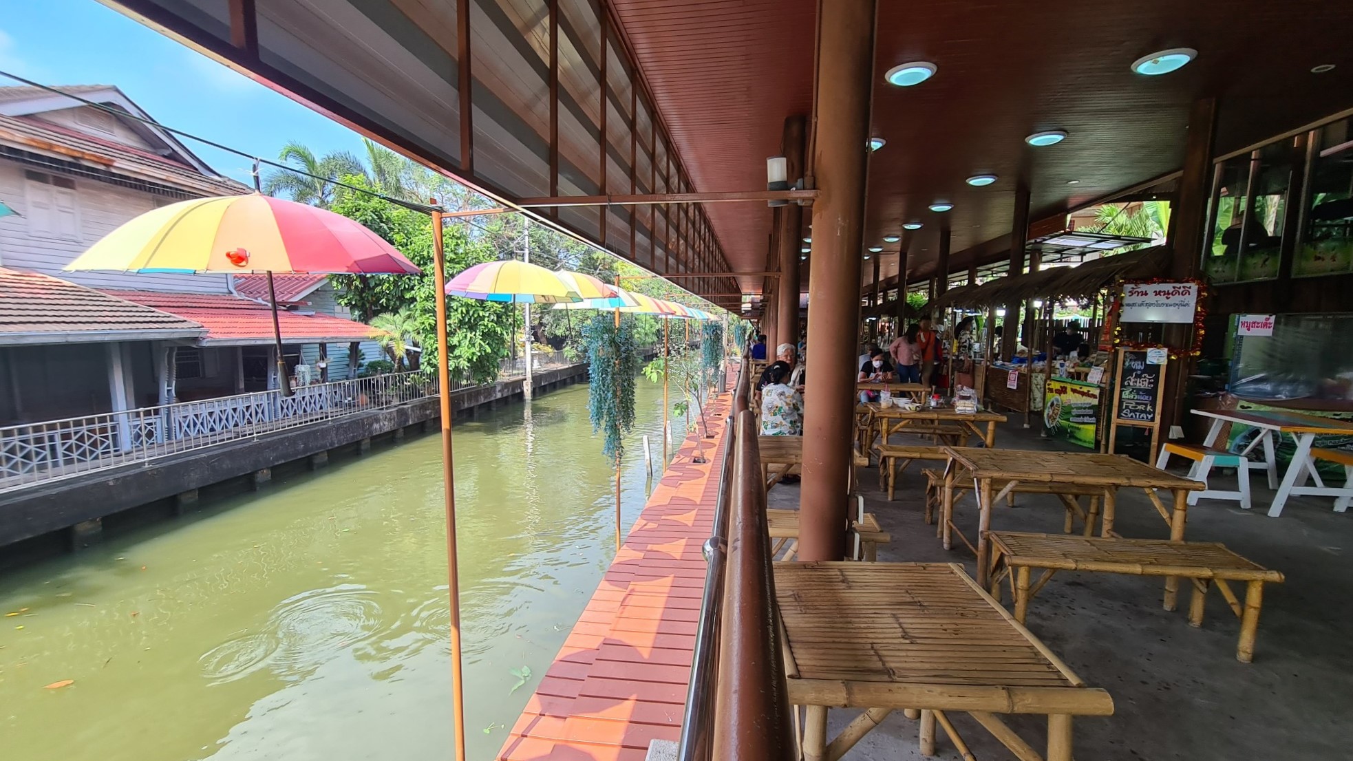 Station Nummer 3 ist der Markt Song Khlong – wie mir der Busfahrer erklärte, eher ein unscheinbarer „Vormarkt vom Taling Chan Markt“. Und ja, ich muss ihm recht geben. Zwar ist alles adrett gestylt auf dem Song Khlong Markt mit hübschen Bamboo-Tischen, bunten Schirmen überm Kanal und sehr schönen Essensständen – aber dadurch auch schon fast wieder etwas „steril und nicht authentisch“. Obwohl sich der Song Khlong Markt um das kleine Wat Taling Chan schmiegt, trägt diesen Namen ein anderer schwimmender Markt in der Nachbarschaft, zu dem es zu Fuß nicht mehr weit ist.