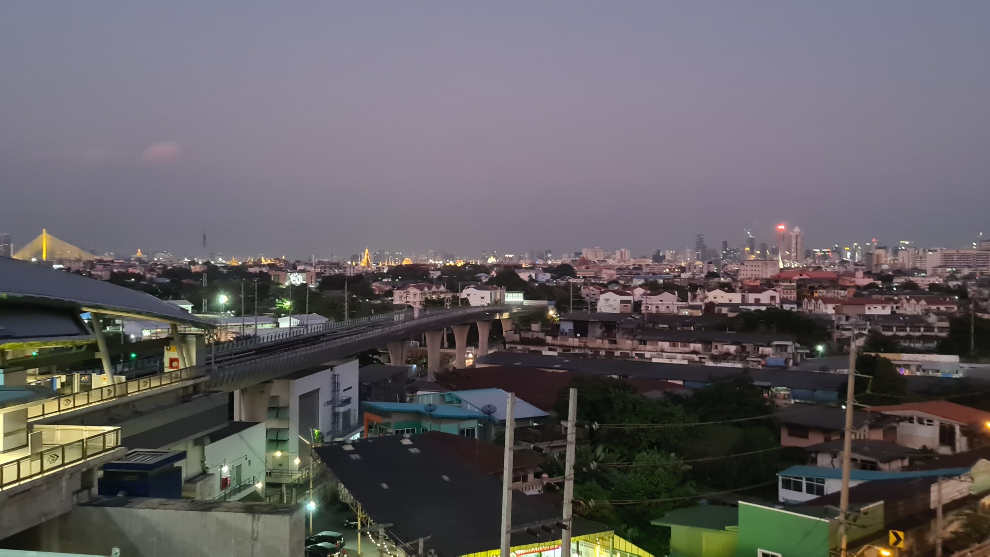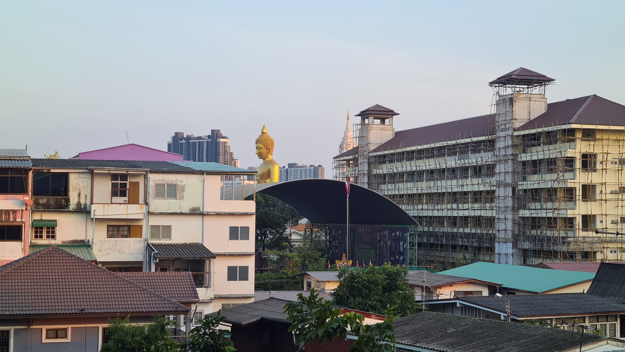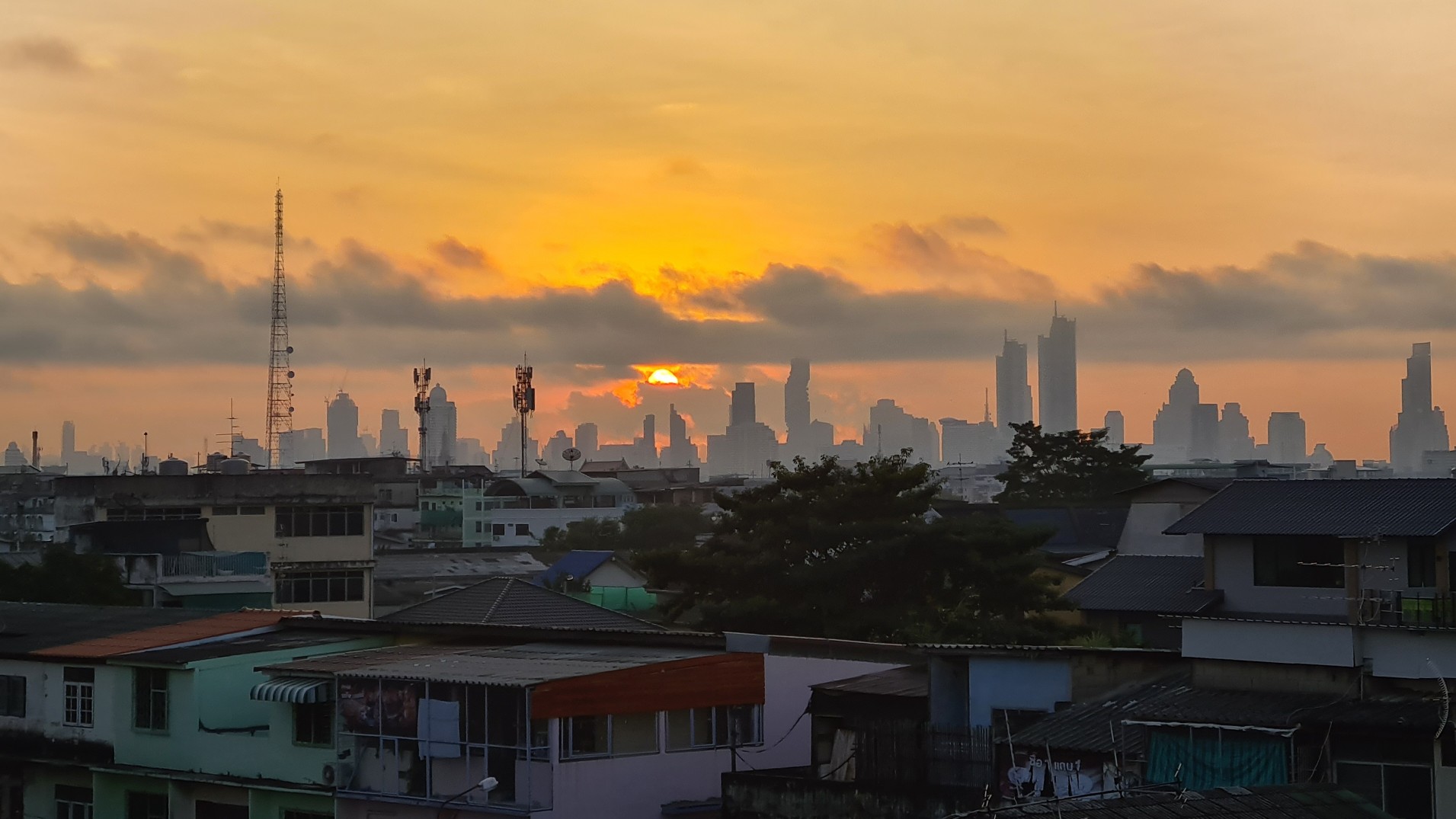 Überglücklich schaffe ich auch noch die restlichen hundert Meter und die vier Stockwerke zu meinem Zimmer und falle müde ins Bett, nicht ohne noch aus dem Mini-Fenster meines Bades einen Abschiedsblick zur untergehenden Sonne hinter der Silhouette von Bangkok zu werfen. Gute Nacht!