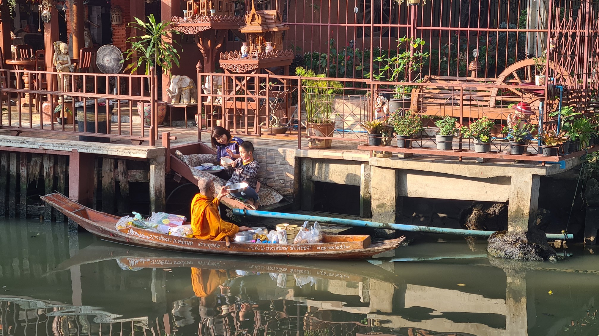 Eine andere Option wäre der Bus, aber die vorbeirauschenden tragen alle andere Nummern und an den Haltestellen steht kein Mensch, der mir Auskunft geben könnte. Also nicht jammern und fluchen, weiter geht’s zu Fuß dem Tagesziel entgegen. Ich tröste mich damit, dass ich besondere Augenblicke, wie diesen des bettelnden Mönches am Khlong unter einer der vielen megahäßlichen Betonstraßenüberführungen, im Vorbeigehen geschenkt bekomme.