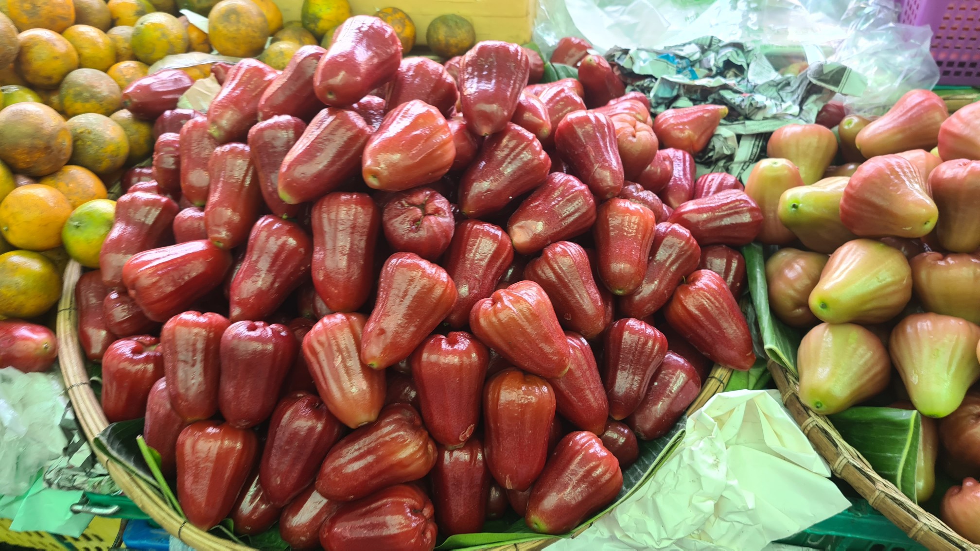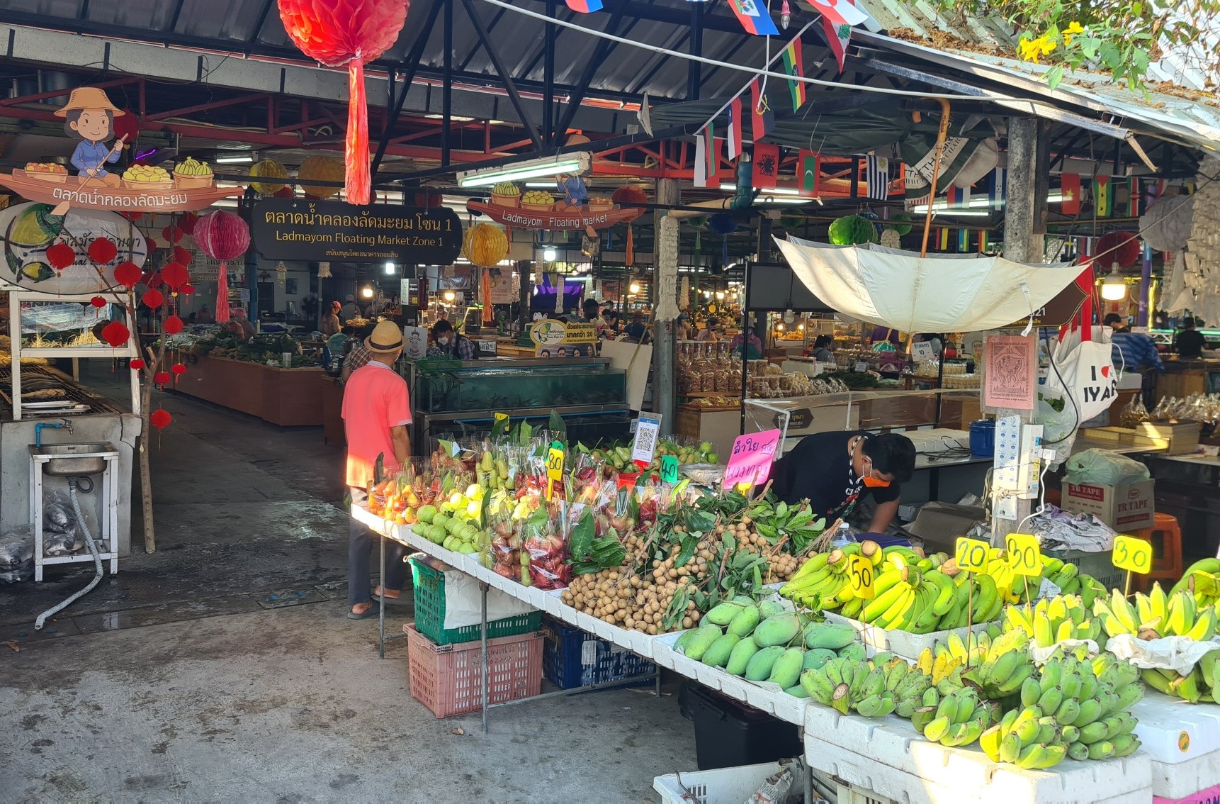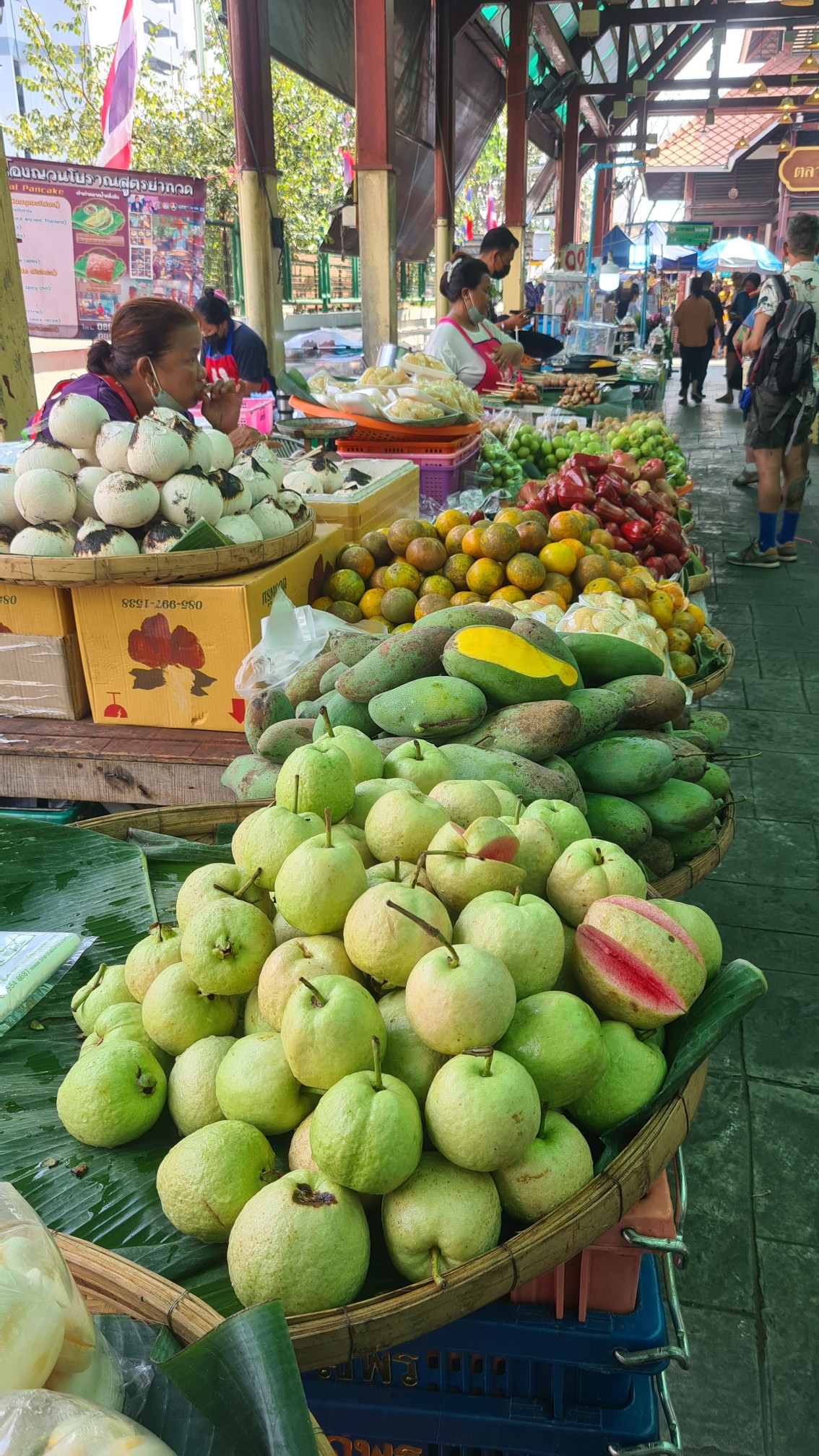 Meine erste Motorradfahrt in Thailand! Das ist ja per se schon spannend. Hatte ich schon erwähnt, dass in Thailand nahezu alle Motorradfahrer Maske tragen – aber äußerst selten einen Helm?! Wenn dann der Fahrer während der Fahrt auf der 4-spurigen Straße noch sein Smartphone zückt, liest und telefoniert, dann kriegt man schon leichte Schnappatmung. Aber der gute Mann bringt mich nach vielen Windungen und Turn-arounds dann doch wohlbehalten in die herrlich ländliche Gegend des Lat Mayom Marktes. Ehrlich gesagt, hatte ich nicht damit gerechnet, dass es noch so weit dahin ist. Da runde ich doch anstandshalber noch auf 100 Baht auf.
