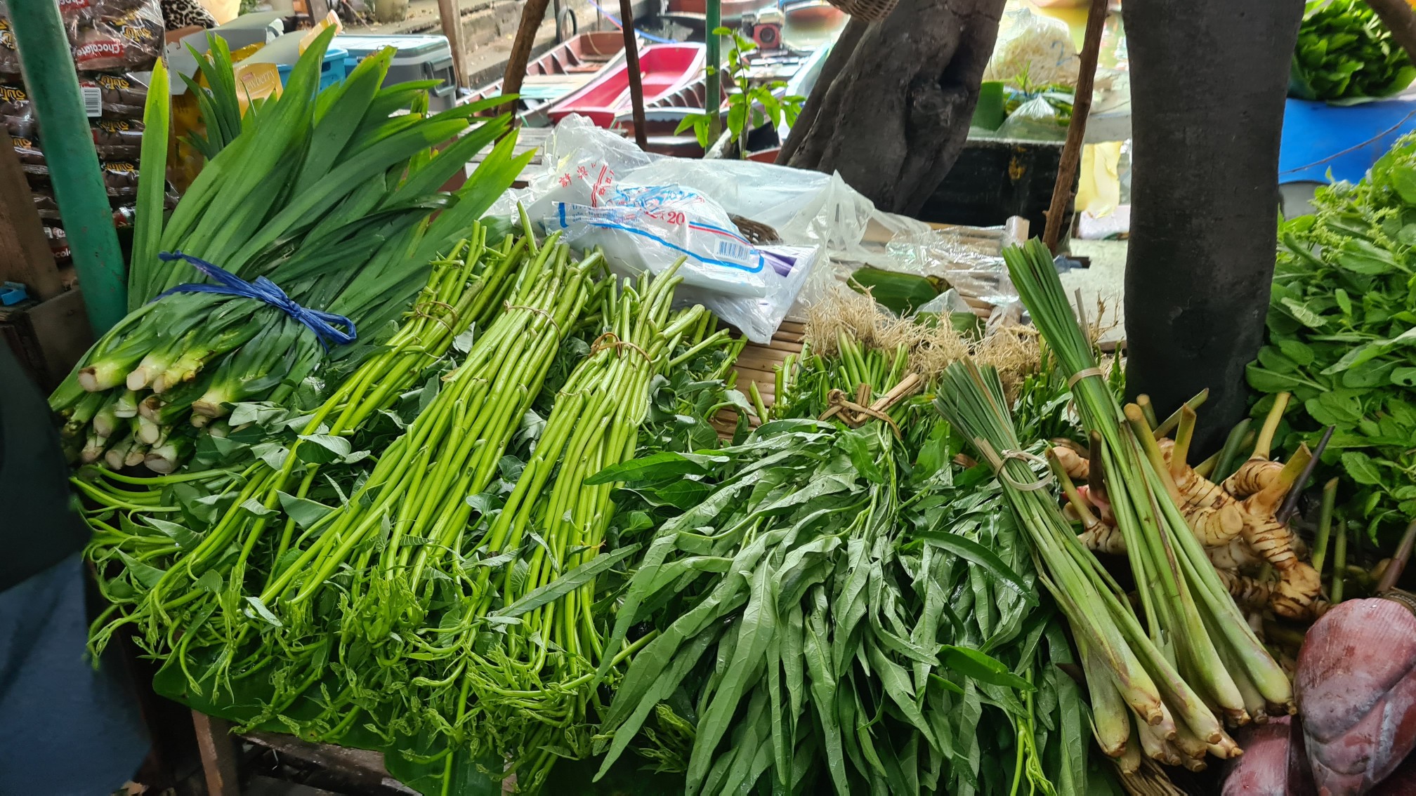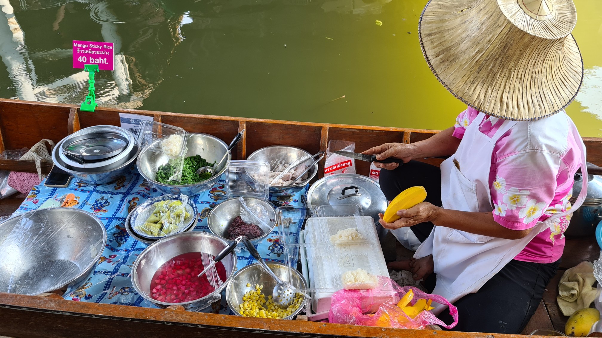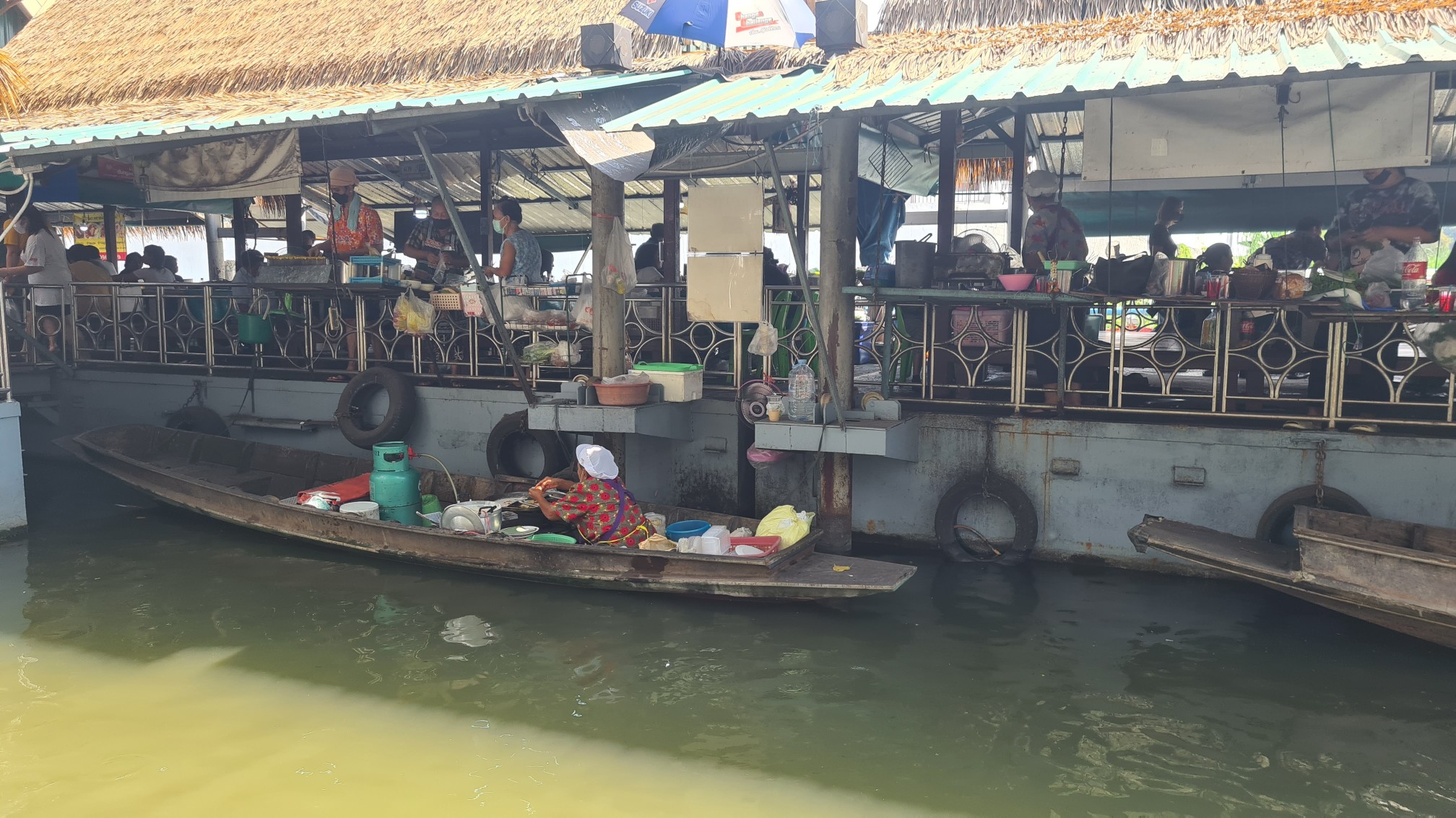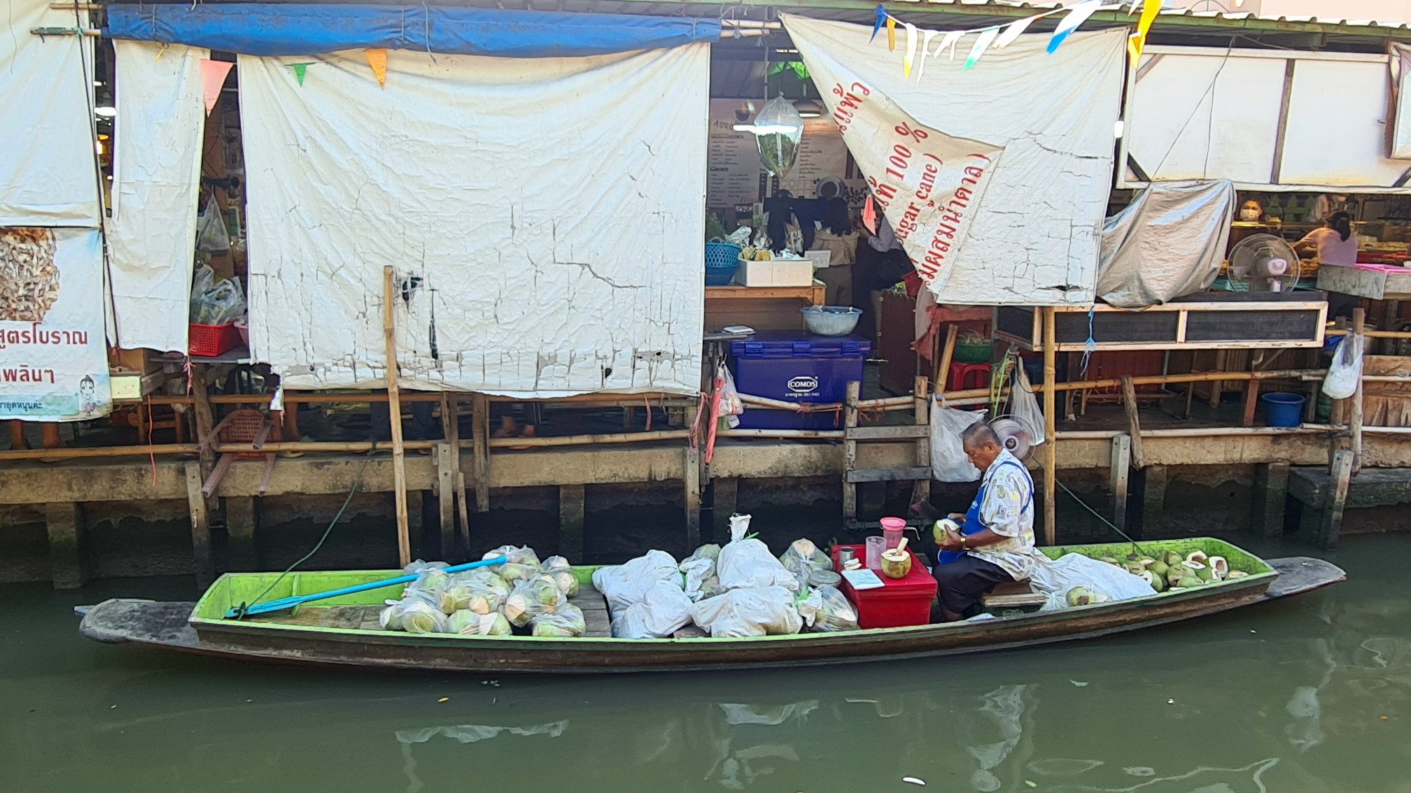 Nun aber auf ins Getümmel, wobei dieses um kurz vor 9 Uhr tatsächlich überschaubar ist. Die Einheimischen haben ihre Einkäufe schon längst erledigt und die touristischen Besucher sitzen noch beim Frühstück. Wie fast überall auf den Märkten sind die meisten Stände in offenen Hallen rund um einen Wasserkanal untergebracht. Auf dem schmalen Kanal selbst verkehren nur noch wenige der traditionellen Langboote, um tatsächlich ihre Waren anzubieten oder Essen zu verkaufen.