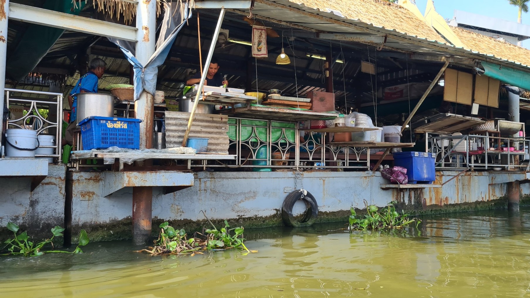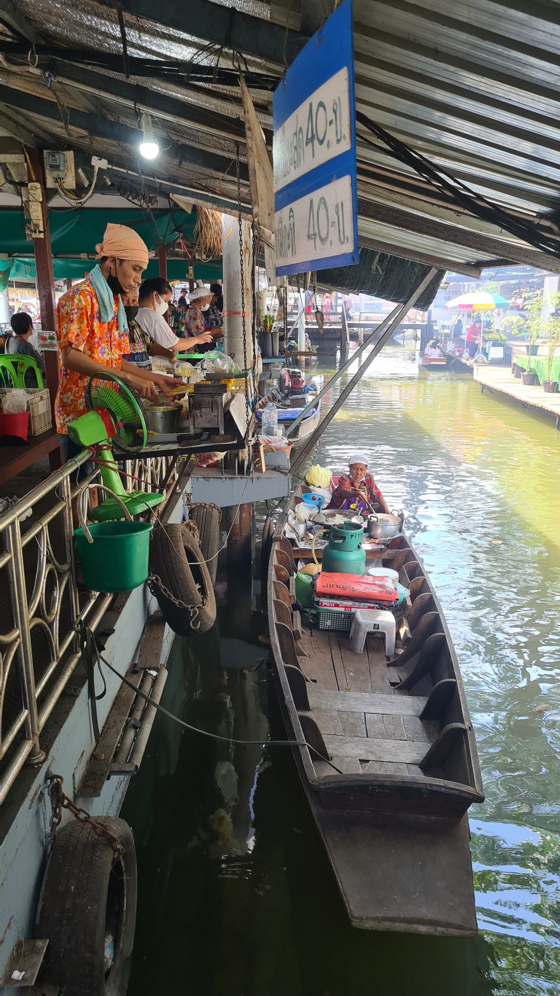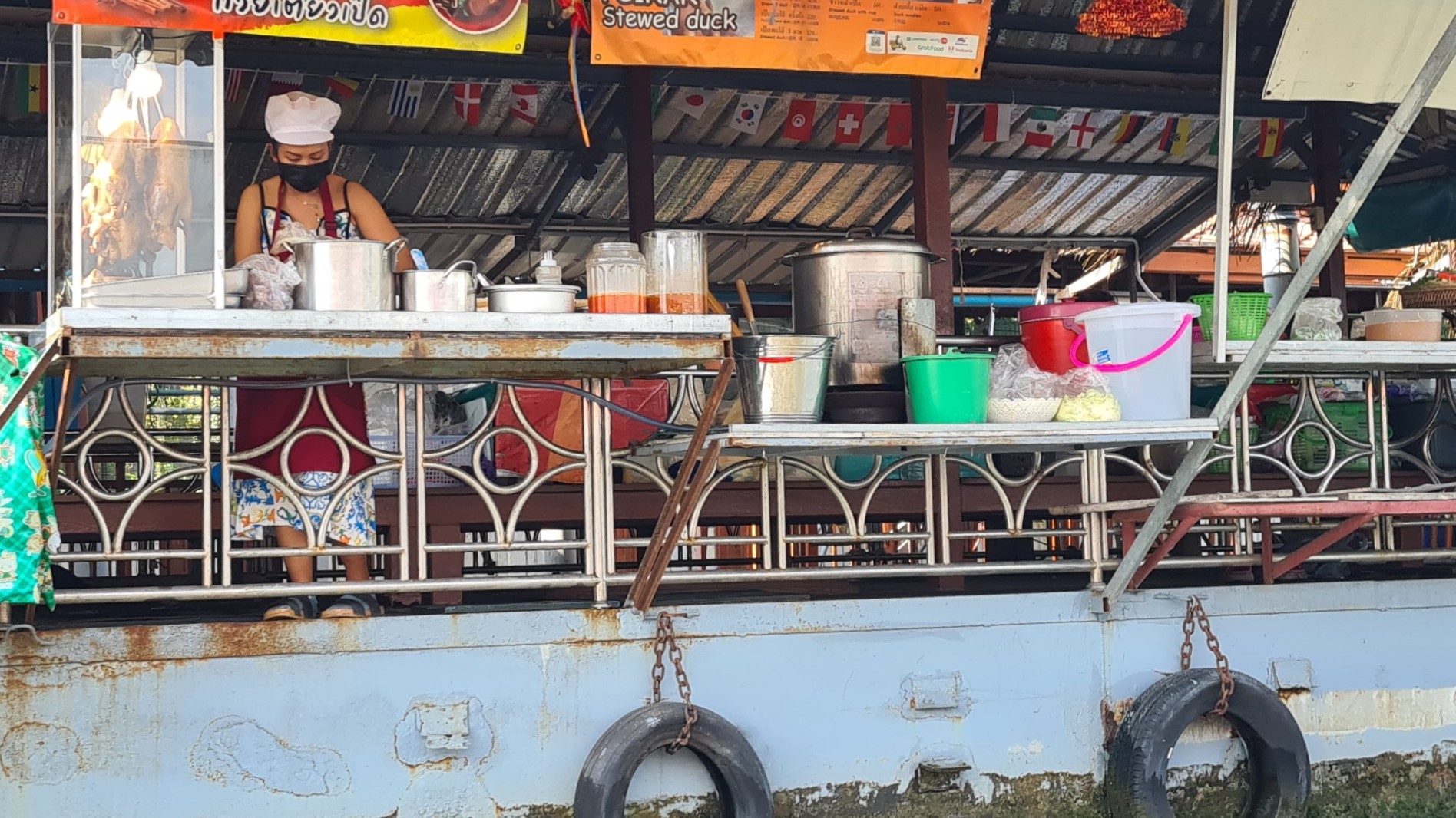 Auf schwimmenden Pontons haben sich Restaurants und Freiluftküchen ideenreich eingerichtet. Links und rechts entlang der Geländer sind die mobilen DIY-Küchen verbaut und mittig stehen Tische und Stühle für die Gäste. Einige wenige köcheln und bruzzeln – noch fotogener – direkt auf ihren Booten und eines ist gewiss: Verhungern muss in Thailand niemand!
