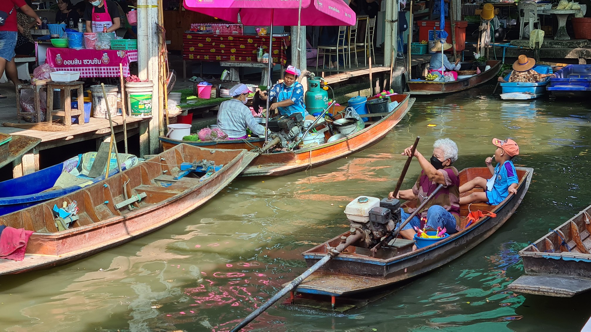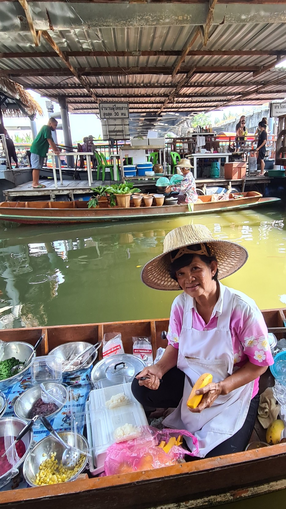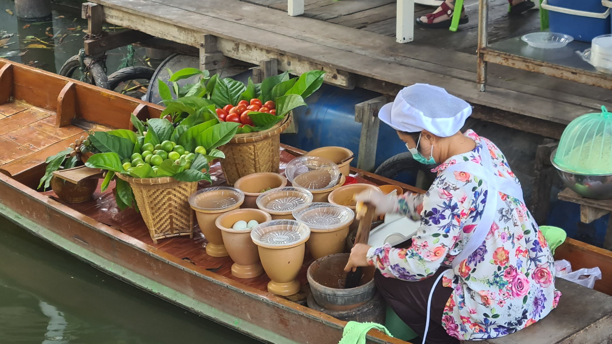 Auf schwimmenden Pontons haben sich Restaurants und Freiluftküchen ideenreich eingerichtet. Links und rechts entlang der Geländer sind die mobilen DIY-Küchen verbaut und mittig stehen Tische und Stühle für die Gäste. Einige wenige köcheln und bruzzeln – noch fotogener – direkt auf ihren Booten und eines ist gewiss: Verhungern muss in Thailand niemand!