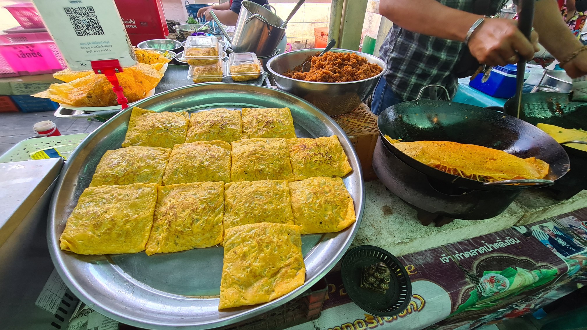 Den Rückweg habe ich mit der MRT etwas abgekürzt, musste dabei aber feststellen, dass mein Heimweg zum Guesthouse auch von der Station Charan 13 nicht weniger ermüdend ist als von der Station Chai Fai. Da fällt im Vorbeigehen mein Auge in einen Wok am Wegesrand, dessen sehr lecker und frisch aussehender Inhalt von einer adrett gekleideten „Thai-Mama“ meines Alters fachmännisch umeinandergewirbelt wird. Erst schaue ich in den Wok, dann in ihre Augen, dann wieder in den Wok und auf ihr freundliches Lippenstift-Lächeln. Spontan überfällt mich ein unbandiges Hungergefühl und eine große Lust auf genau ihre Kreation.